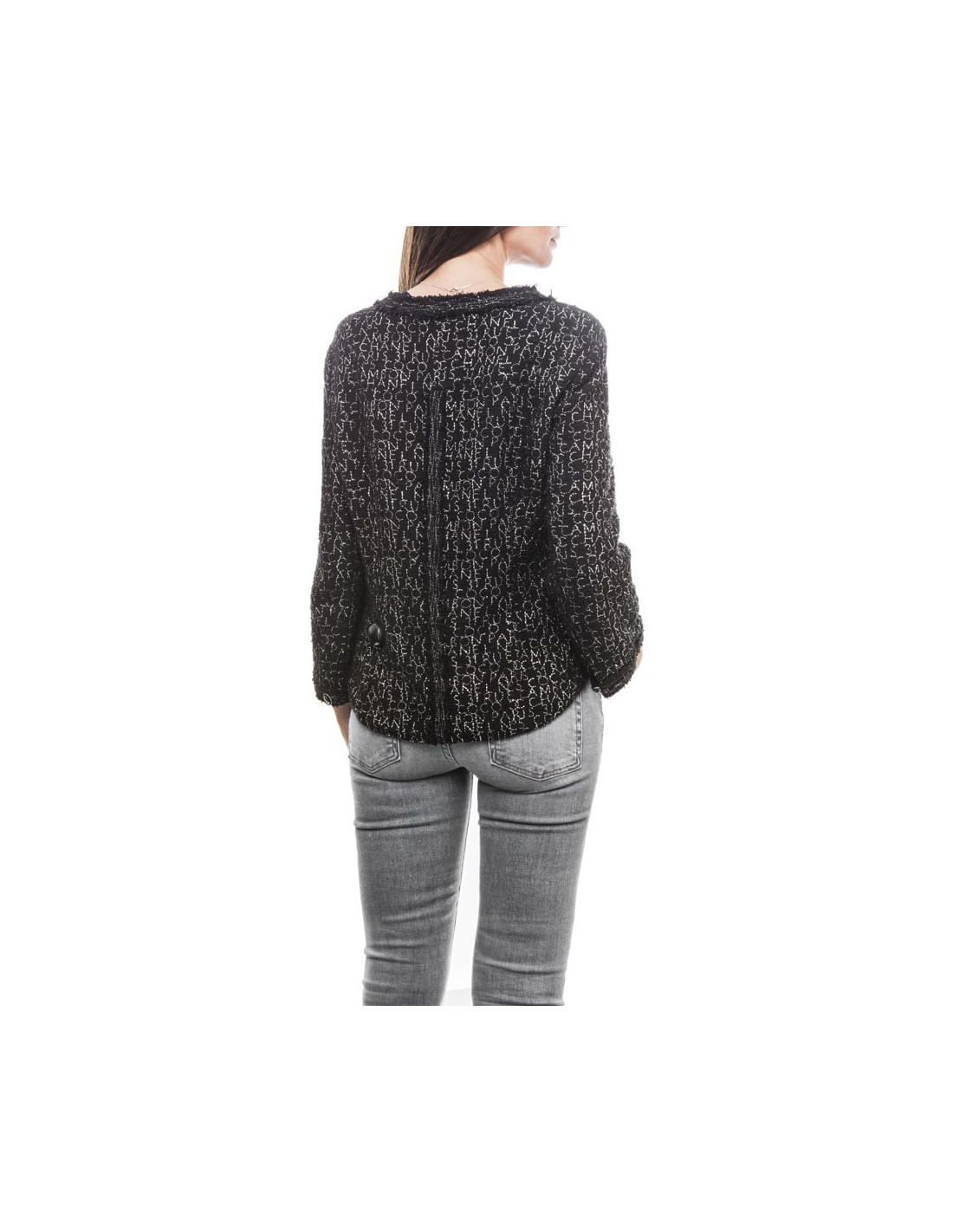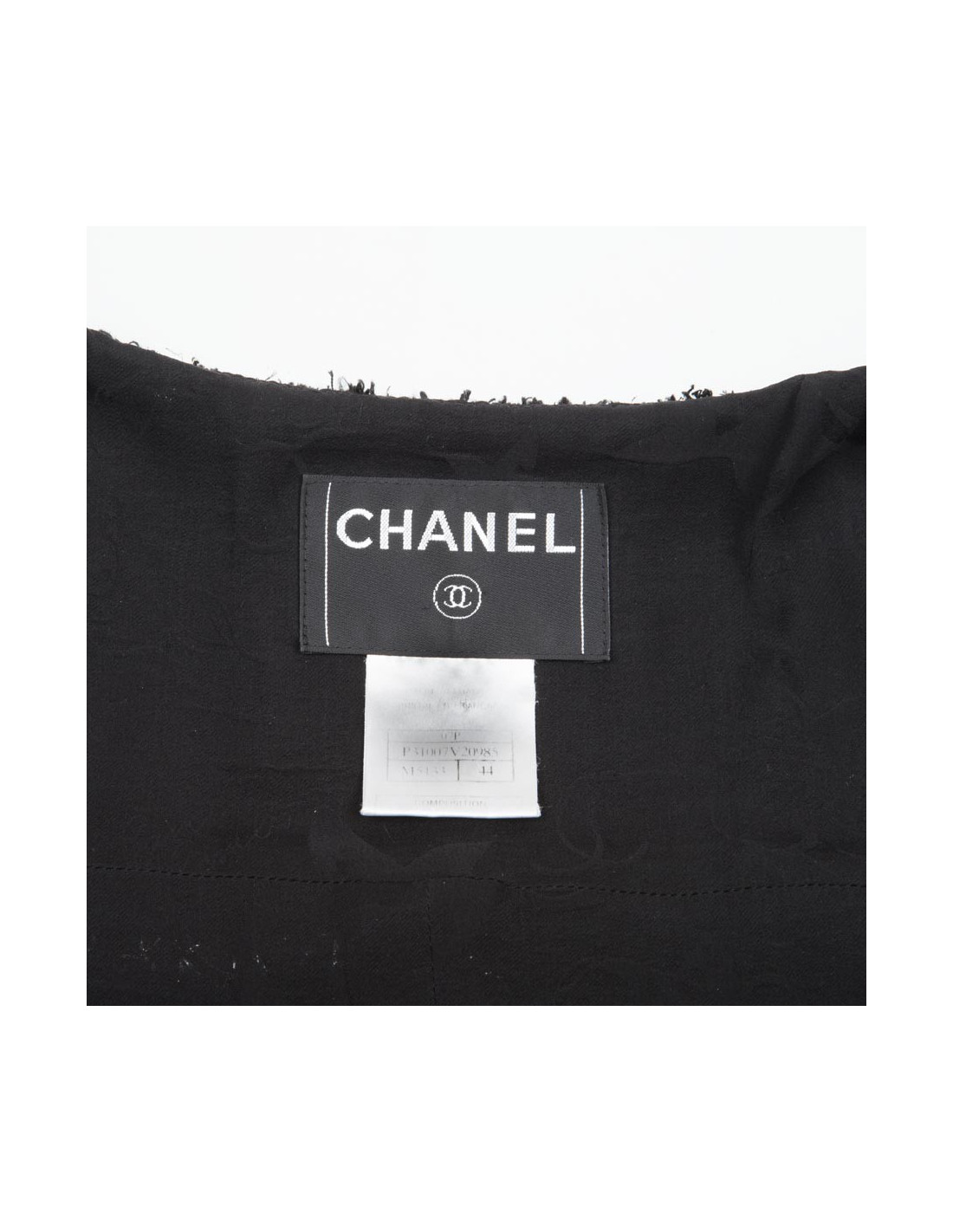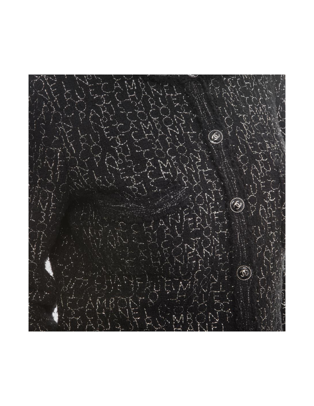 CHANEL jacket in black tweed embroidered with silver thread 'Coco, Cambon Paris, Chanel'. Collection Spring / Summer 2007. It closes with 6 black and silver enamelled buttons "CC". Two small pockets at the front. The lining is black silk monogram.