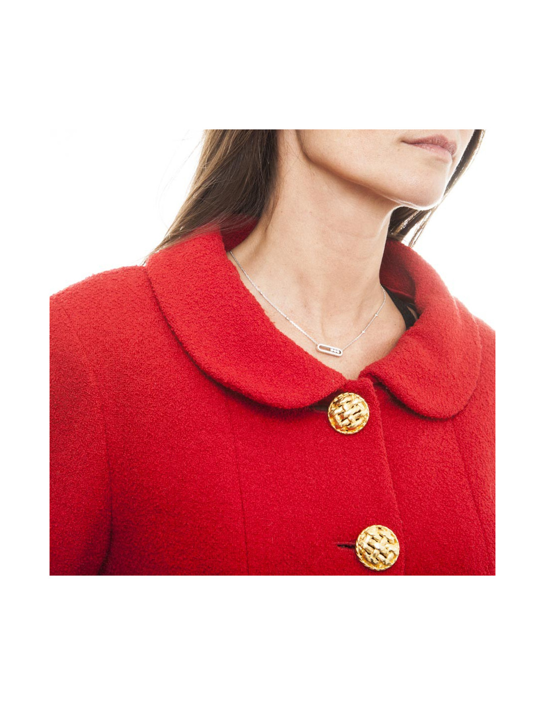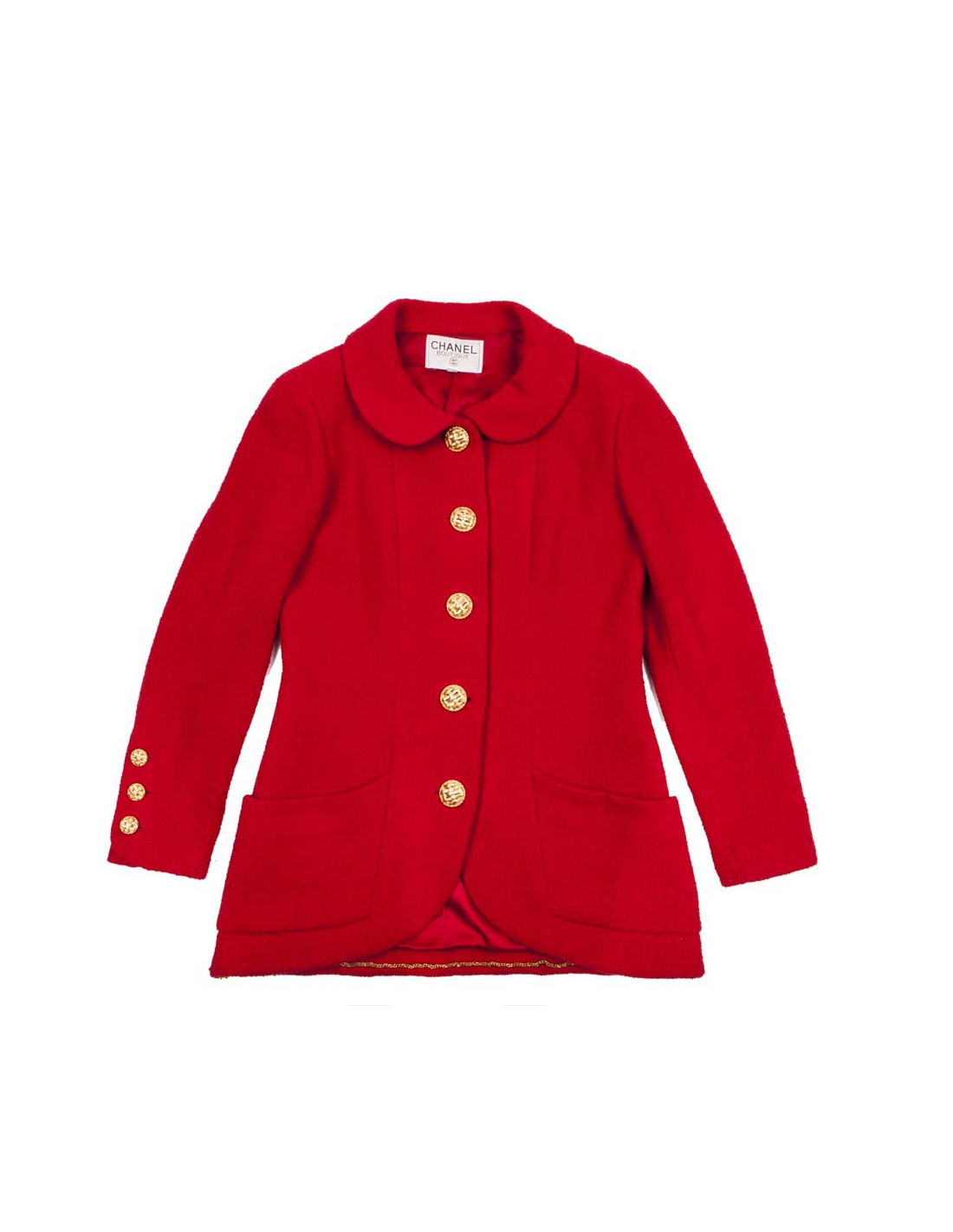 Chanel jacket in red wool lined with red silk (no label of material), closed by four big gold buttons with two pockets veneered. The sleeves are long with three smaller buttons.