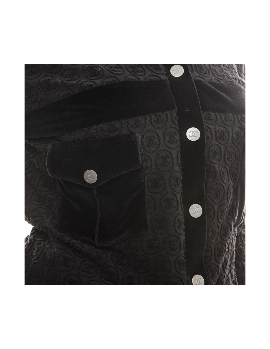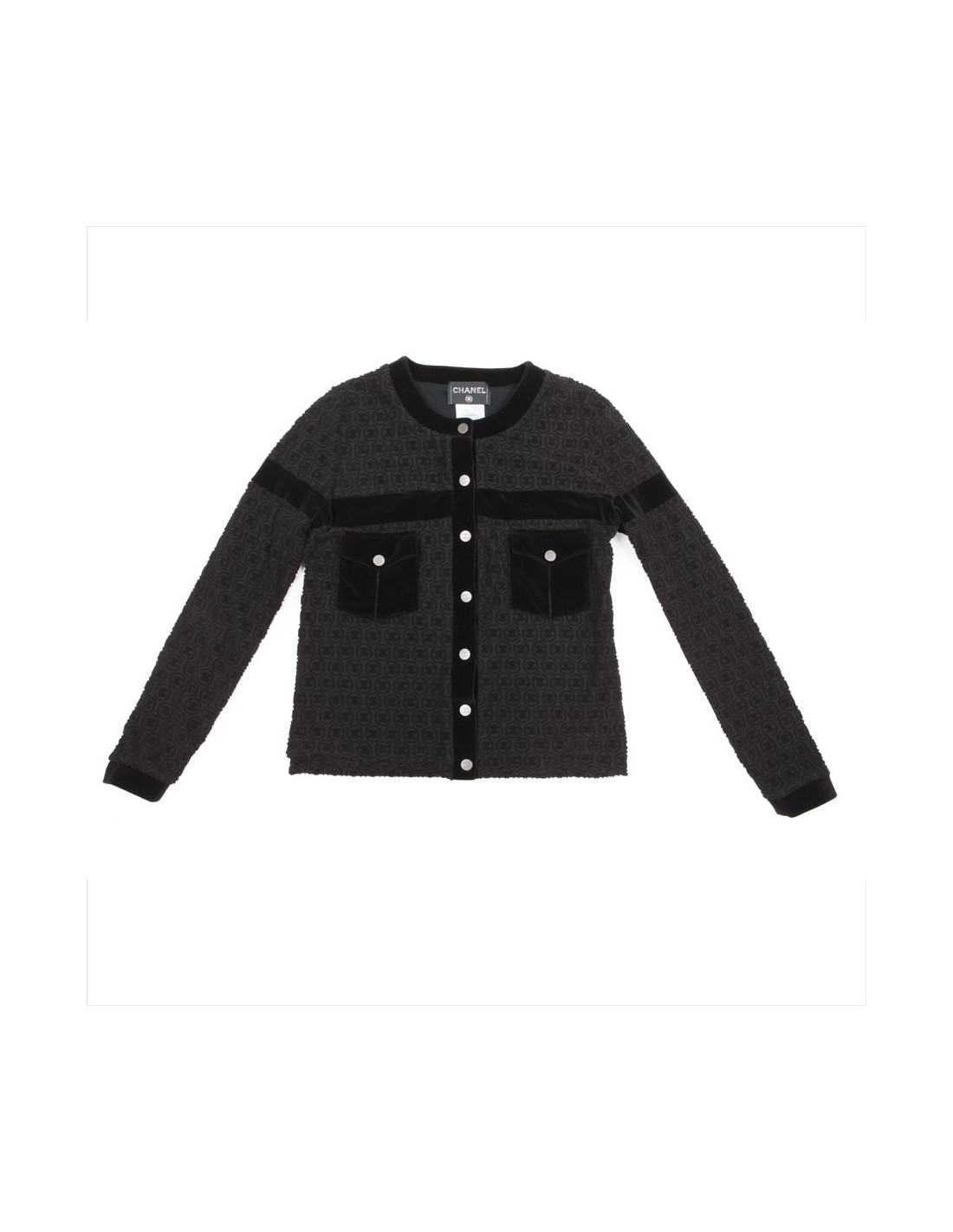 Jacket Chanel house in black cotton 'CC'. Closing with snaps 'CC', with two small pockets at the chest (snap closure) and is fully signed 'CC'. Lining in modal and black cotton.