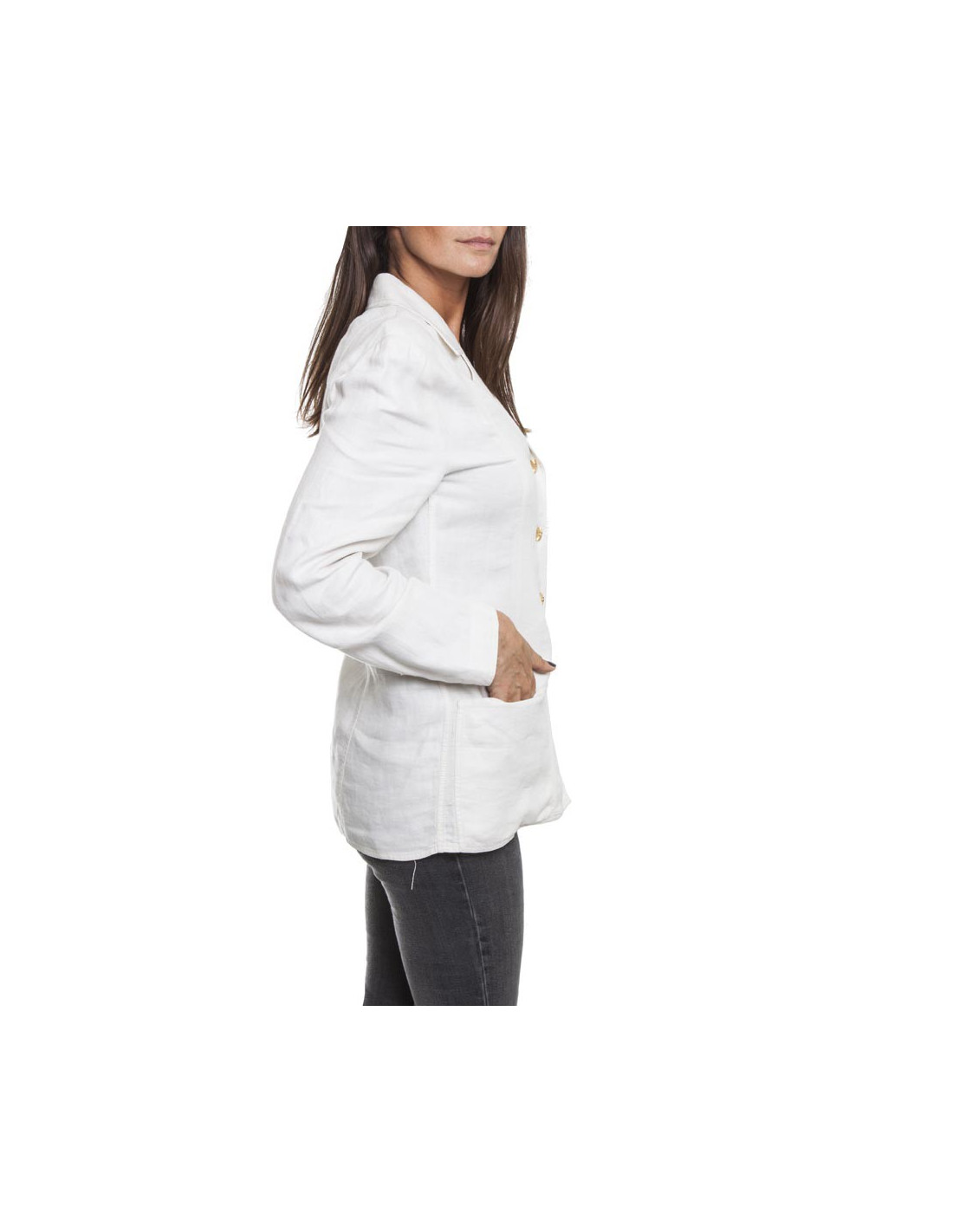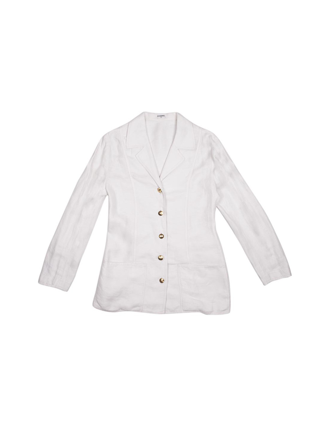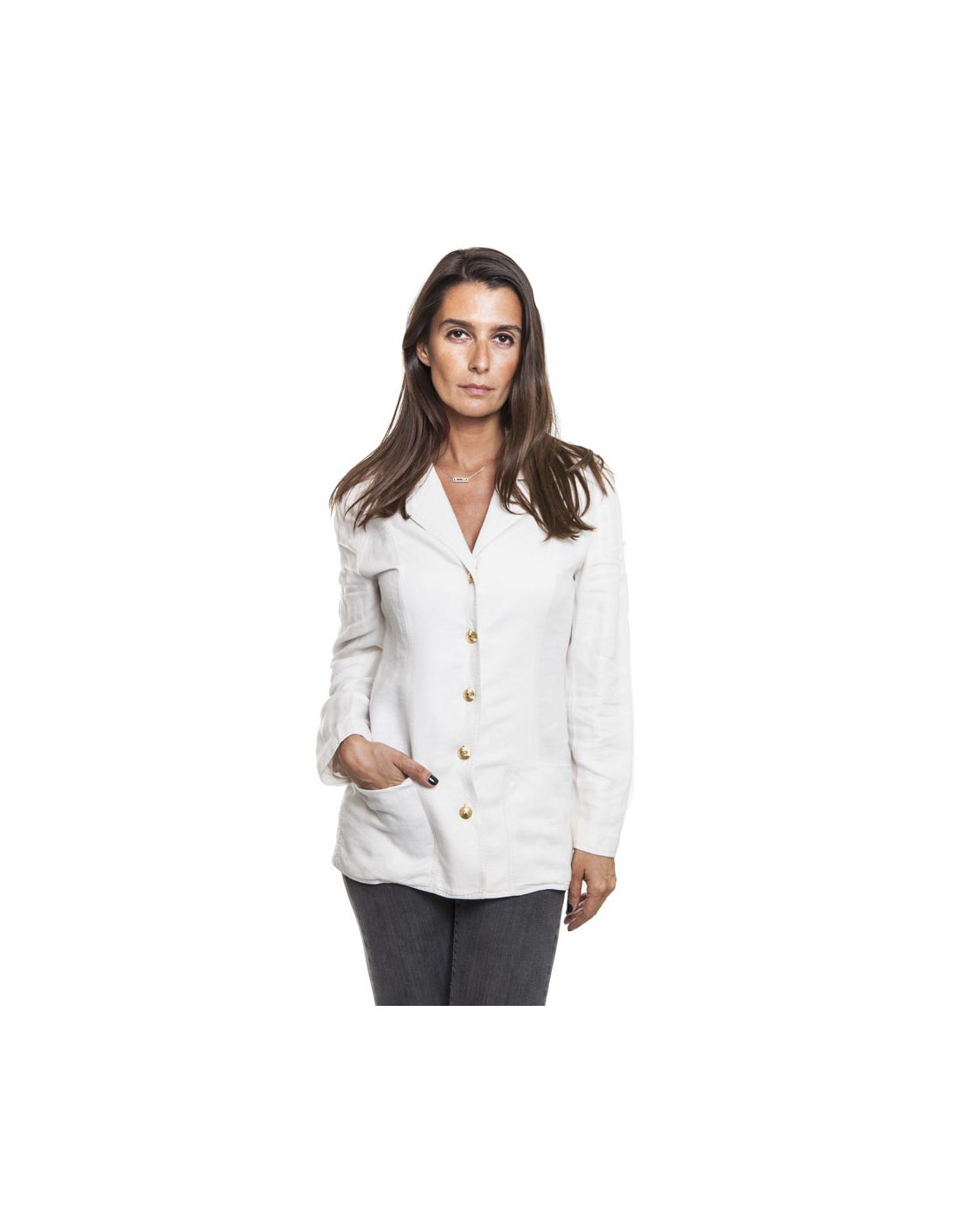 Vintage! CHANEL jacket in ecru linen. It is equivalent to a size 38 FR (no size and material label). It is cut arched. It closes with five golden brushed CC buttons.