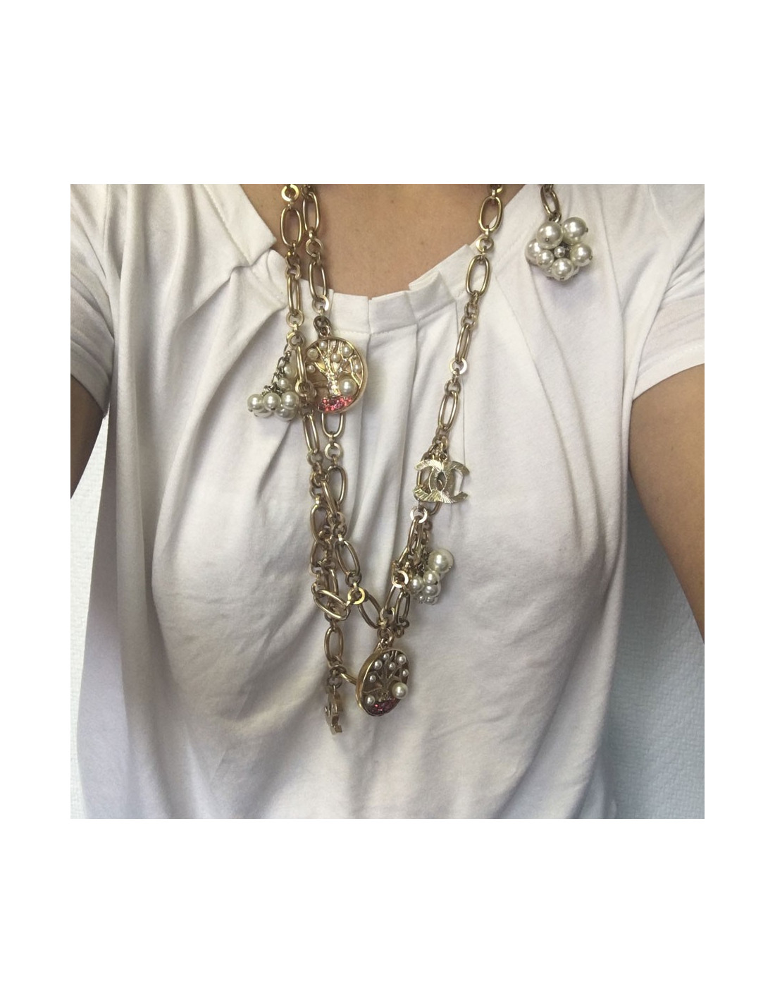 Great Belt CHANEL necklace in gold chain, small clusters of pearly beads, round charms with a motif adorned tree of pearly beads and pink rhinestones and gold CC. The chanel hologram is etched on the carabiner.