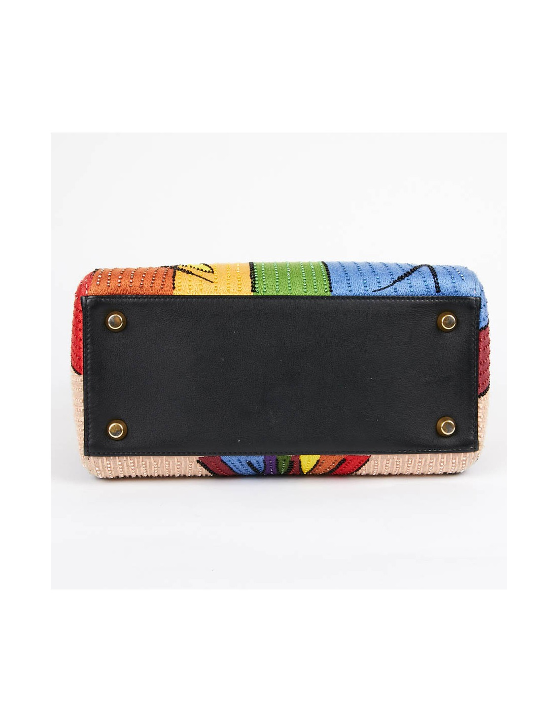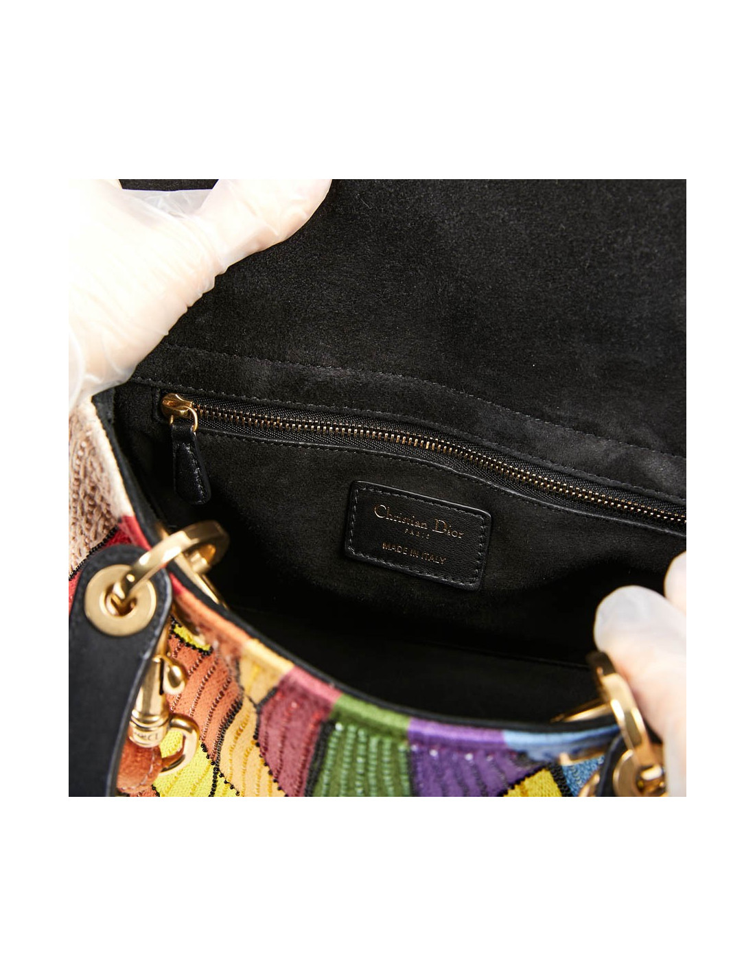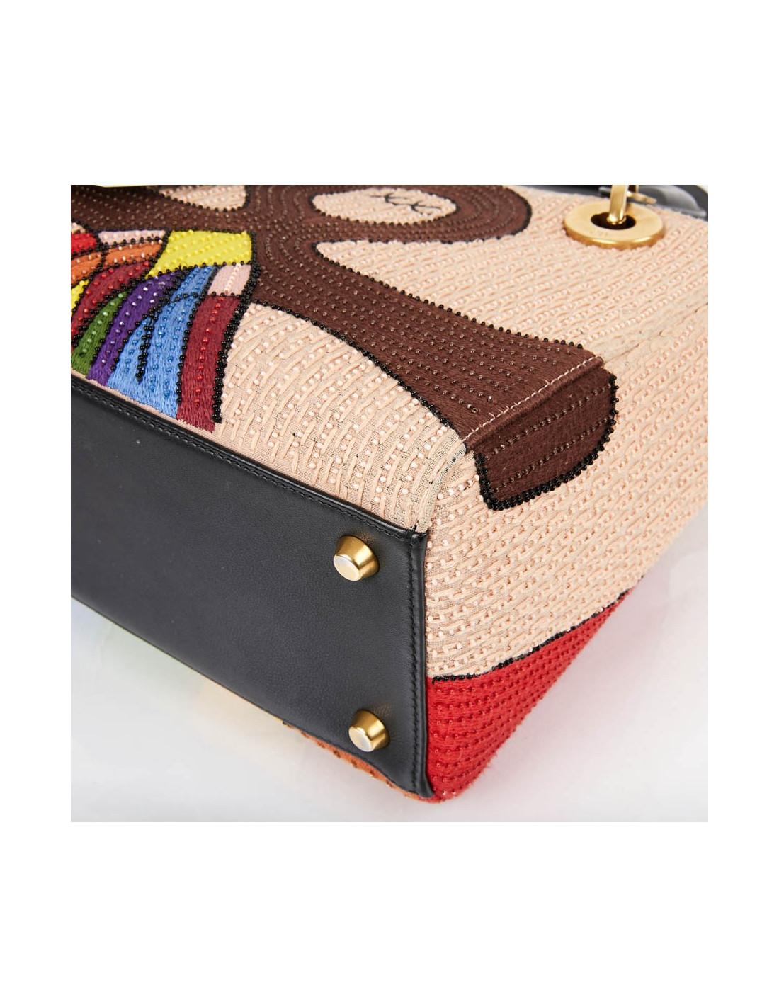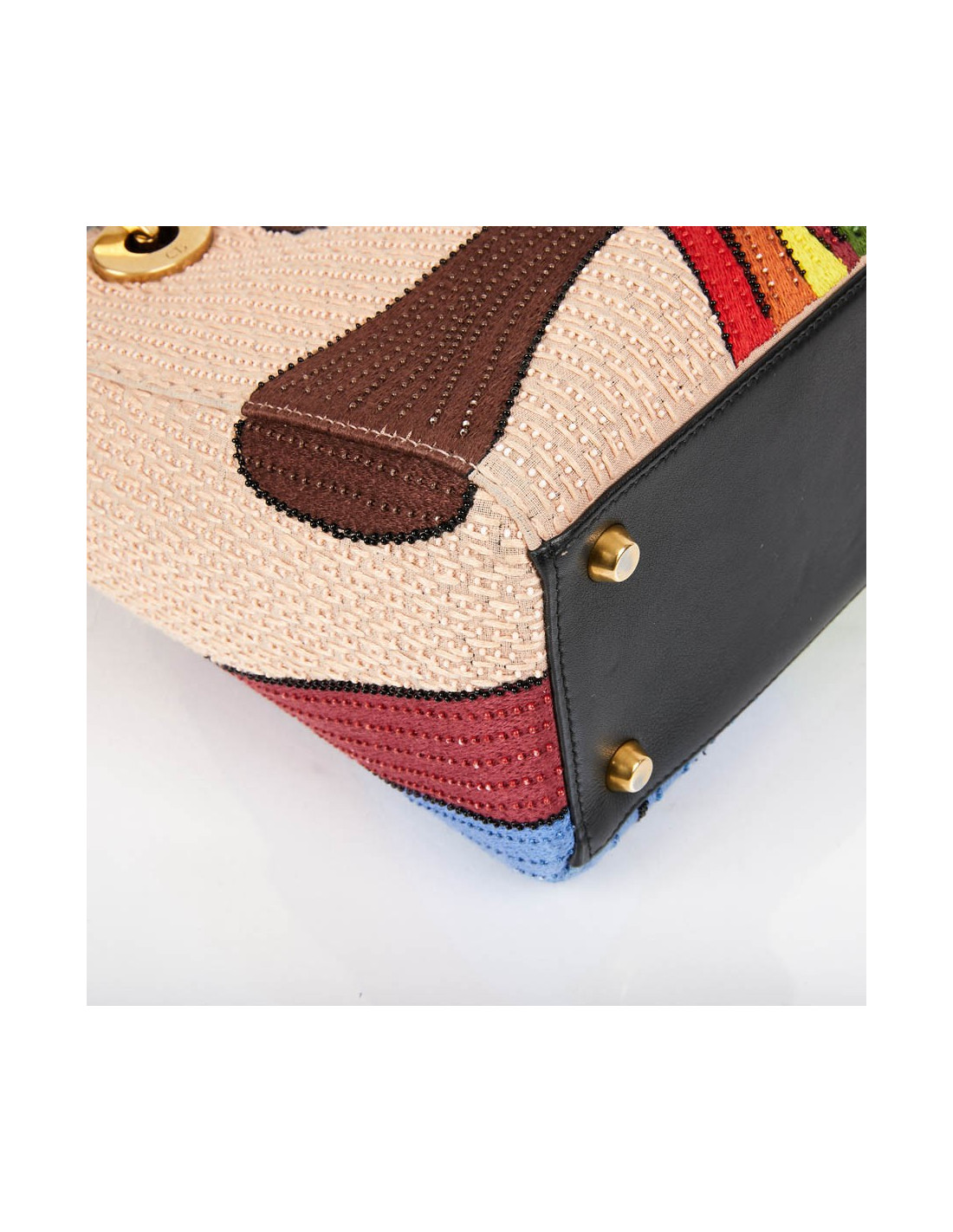 It is multicolored with its embroidery and beads. The leather flap is black and the lining is black suede.