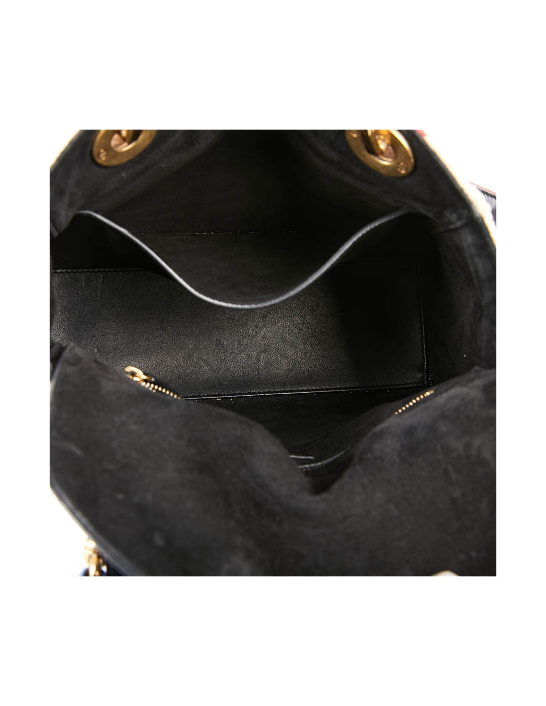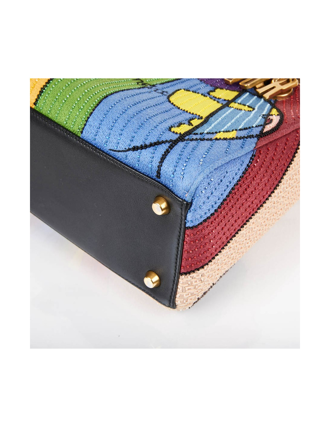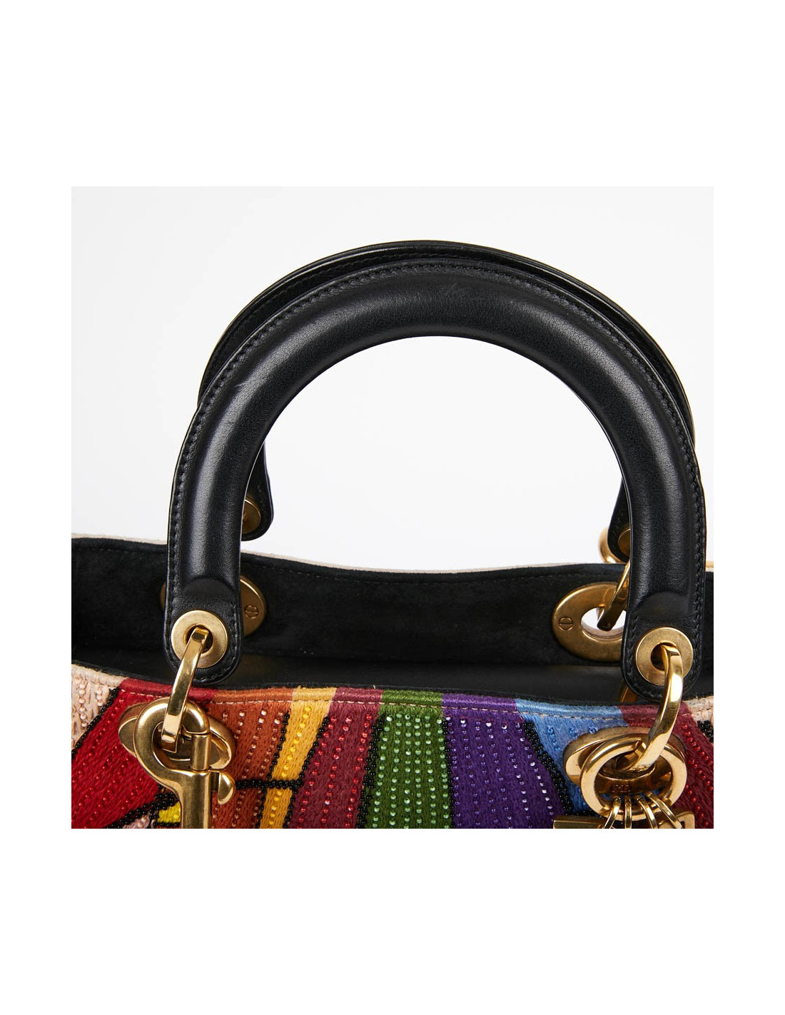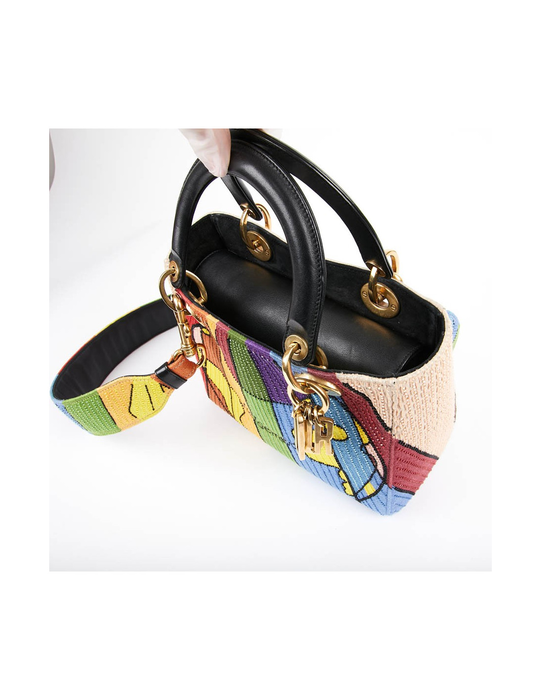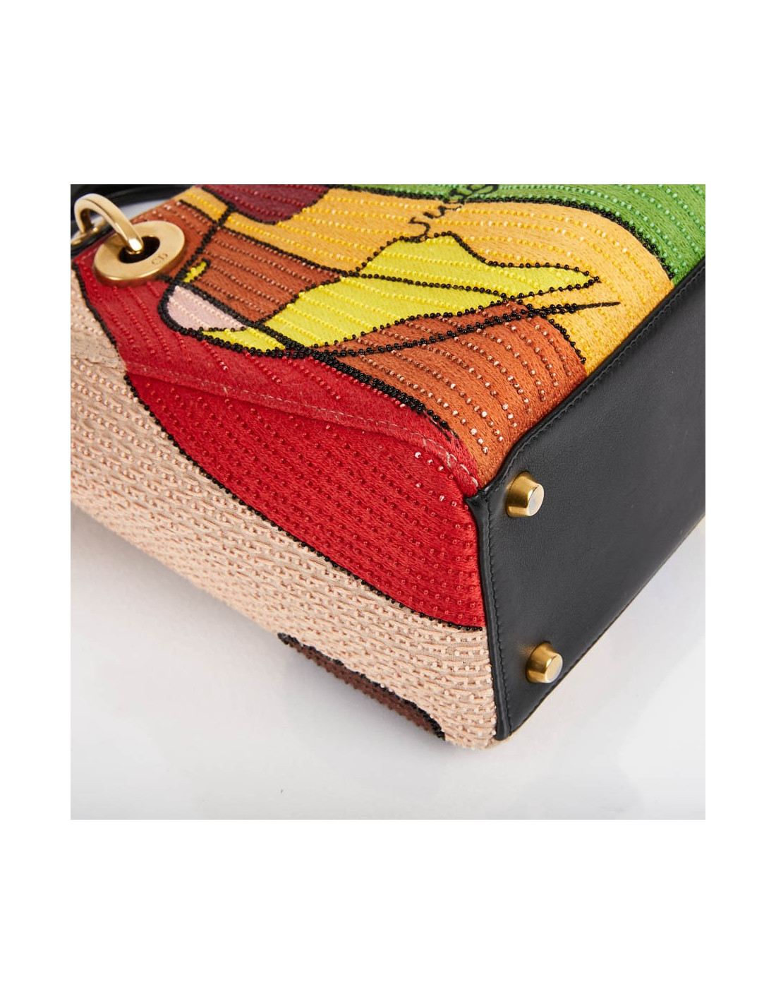 It is multicolored with its embroidery and beads. The leather flap is black and the lining is black suede.