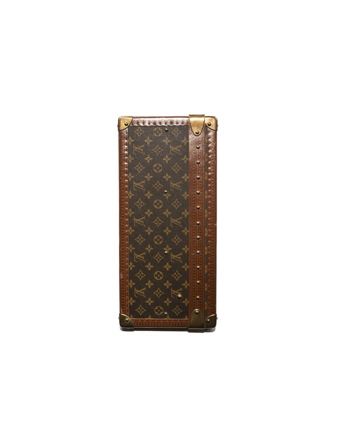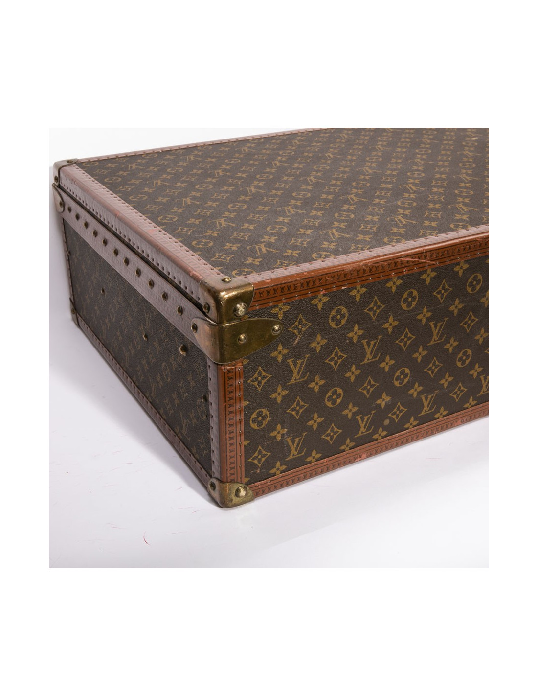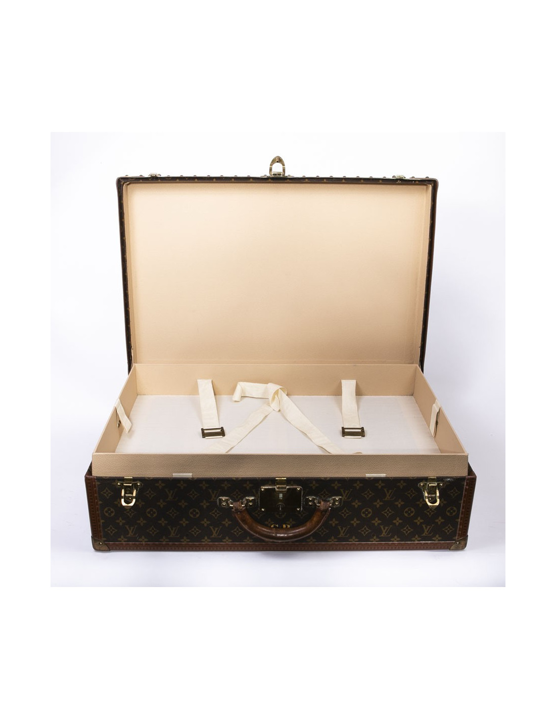 This magnificent LOUIS VUITTON trunk (suitcase) is made of monogram canvas. It is the Bisten 70 model. The hardware is in gold finish metal. The lining is canvas. The rounded handle is in leather. The interior features a double storage compartment with retaining straps. To close the trunk, an “S” lock (with two keys) is reinforced by two complementary latches. The edges of the trunk are in Monogram leather reinforced with rivets and gilded metal corners. The case bears the initials “CB” under the lock. The address label holder is present. It is in good state of use (wear marks and scratches on the canvas, and age-toned metalwork, perfect interior).