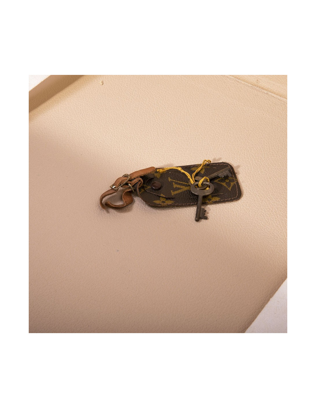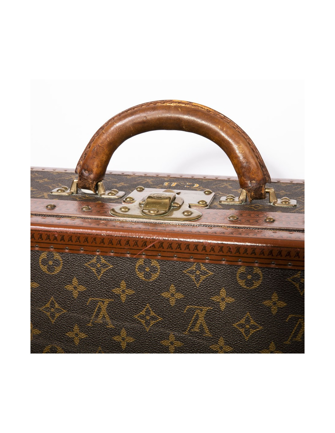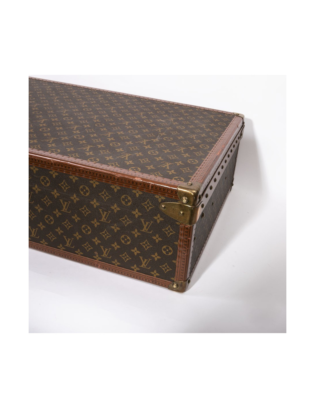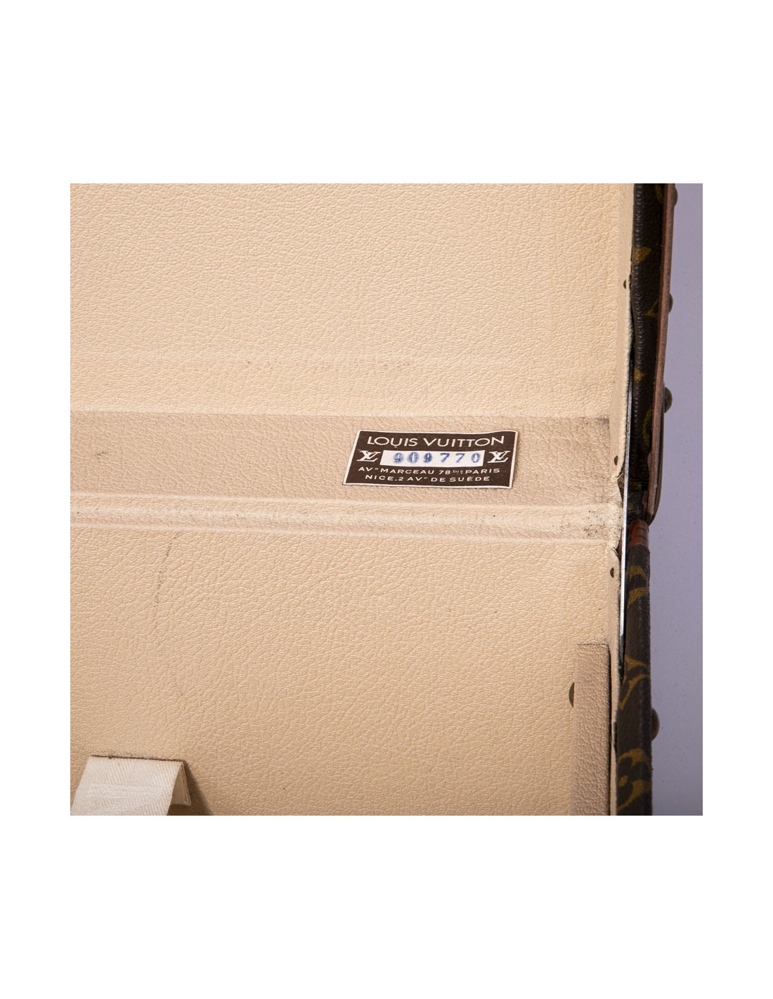 This magnificent LOUIS VUITTON trunk (suitcase) is made of monogram canvas. It is the Bisten 70 model. The hardware is in gold finish metal. The lining is canvas. The rounded handle is in leather. The interior features a double storage compartment with retaining straps. To close the trunk, an “S” lock (with two keys) is reinforced by two complementary latches. The edges of the trunk are in Monogram leather reinforced with rivets and gilded metal corners. The case bears the initials “CB” under the lock. The address label holder is present. It is in good state of use (wear marks and scratches on the canvas, and age-toned metalwork, perfect interior).