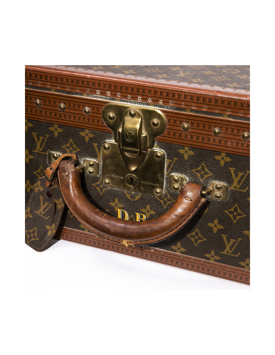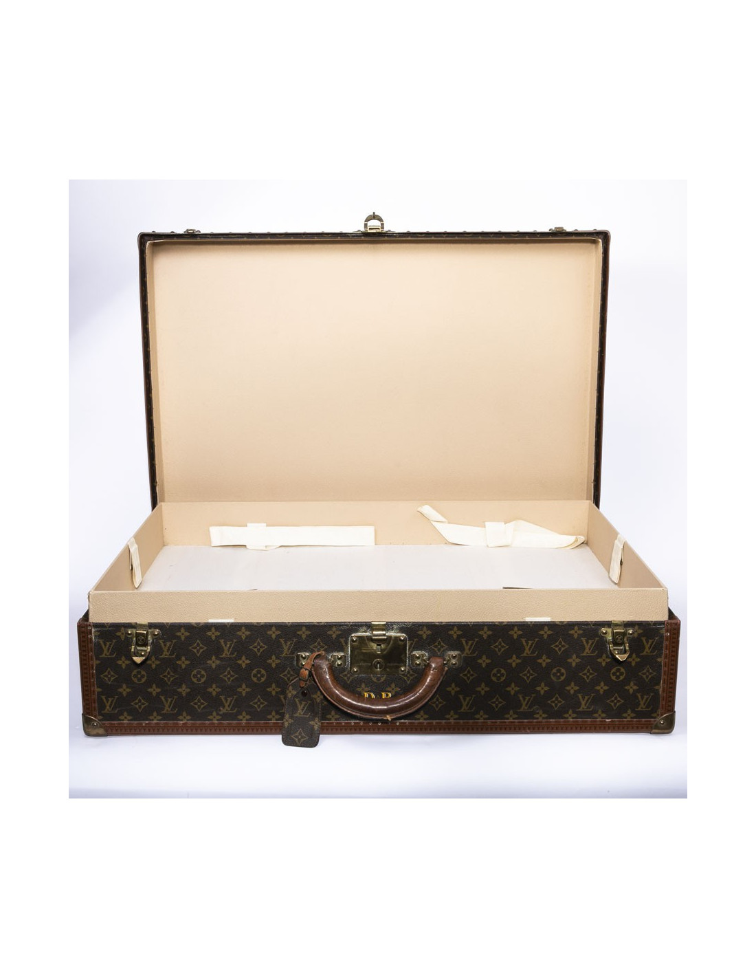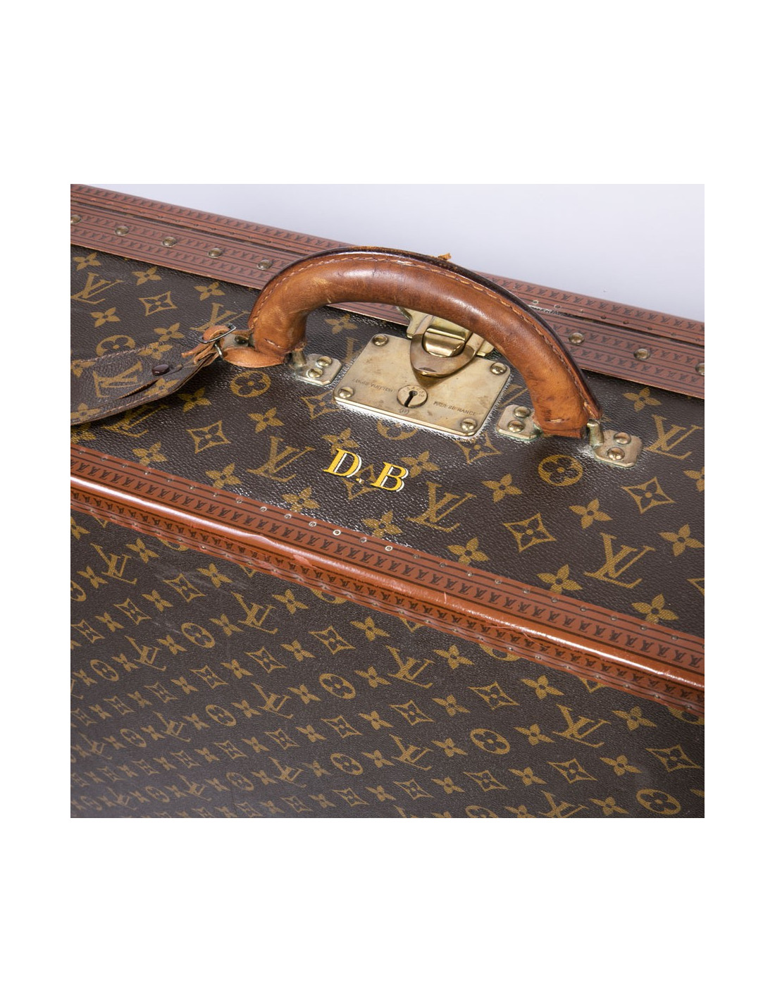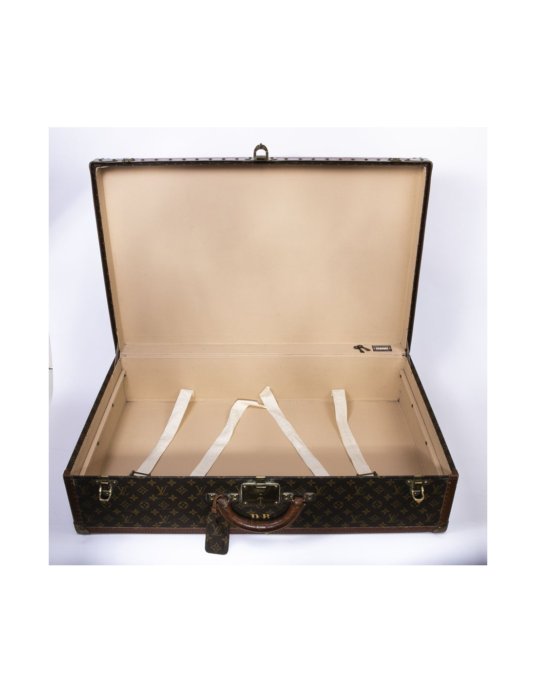 This magnificent second-hand trunk (hard suitcase)LOUIS VUITTON is monogram canvas. It is the Bisten 80 model. The hardware is in gold finish metal. The lining is in two layers of canvas (with holding straps). (small stains on the canvas). It can be carried by hand thanks to its rounded leather handle. The Louis Vuitton “S” lock (with two keys) is reinforced by two complementary latches for secure closure. The edges are in Monogram leather with reinforced rivets and gilded metal corners. A gilded “D.B” initials inscription is located under the lock. It has the address label holder. This suitcase is in very good state of use (wear marks and scratches on the canvas, and age-toned metalwork).