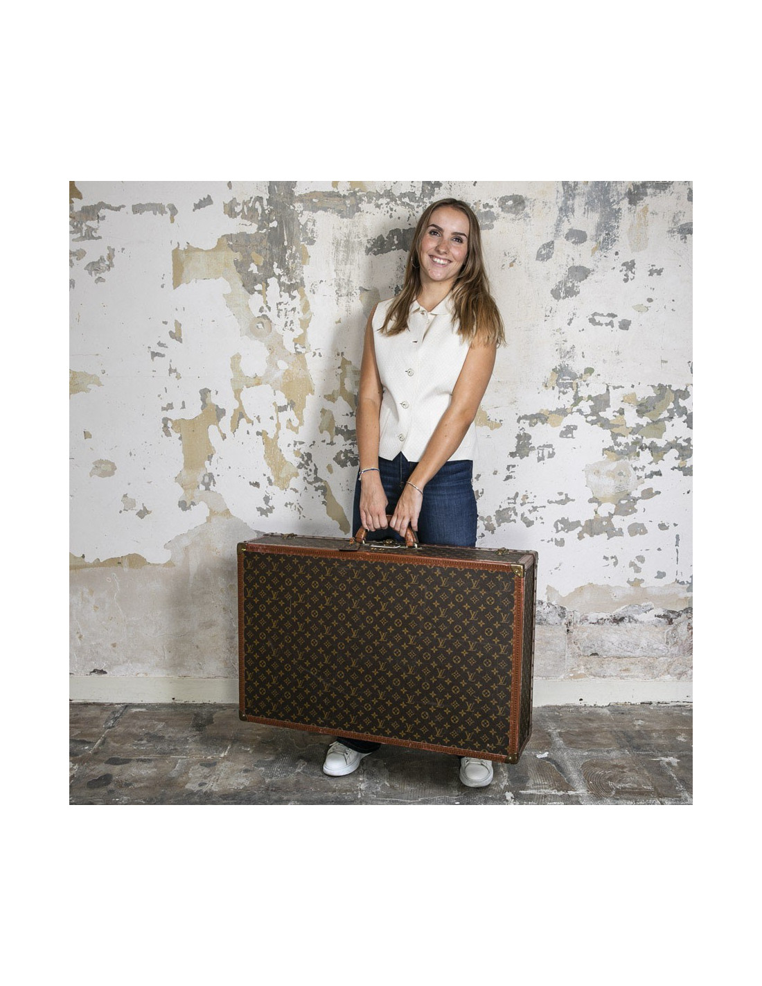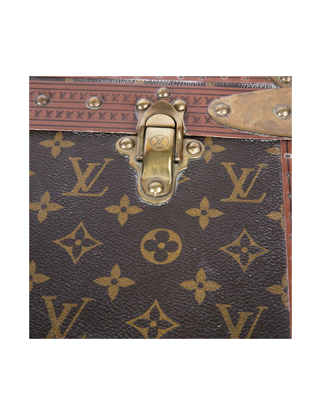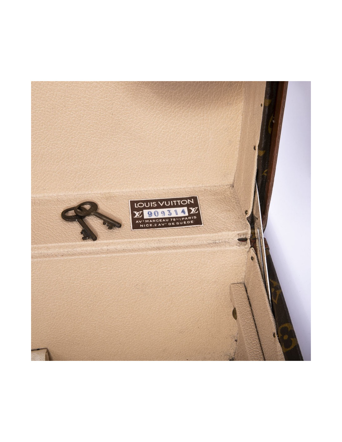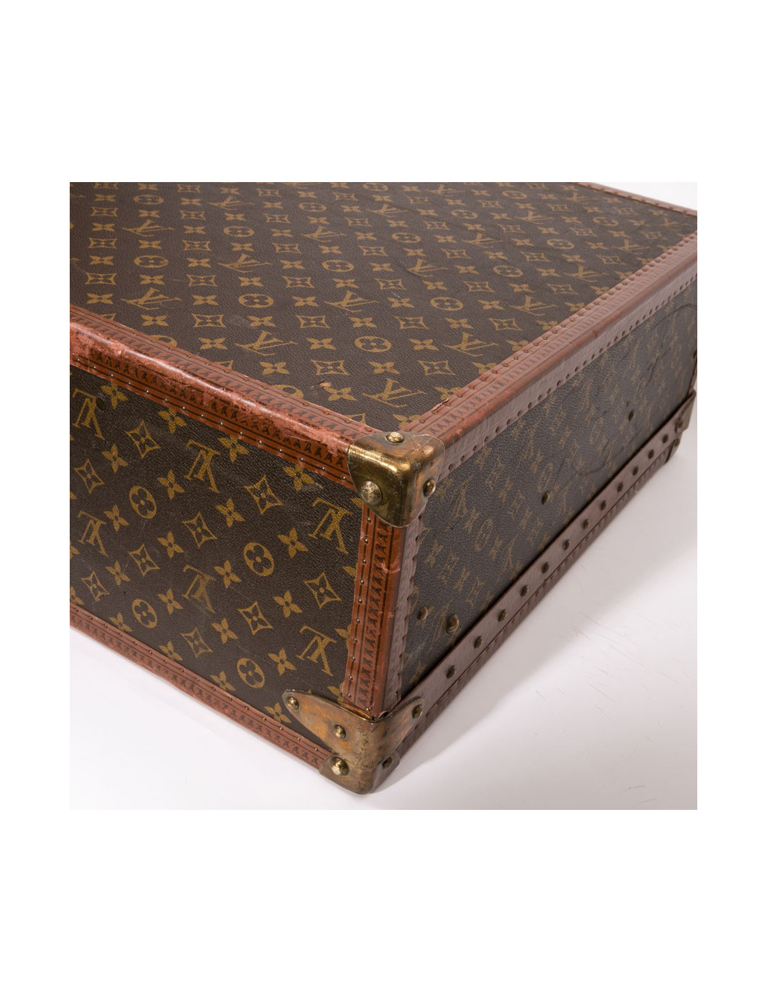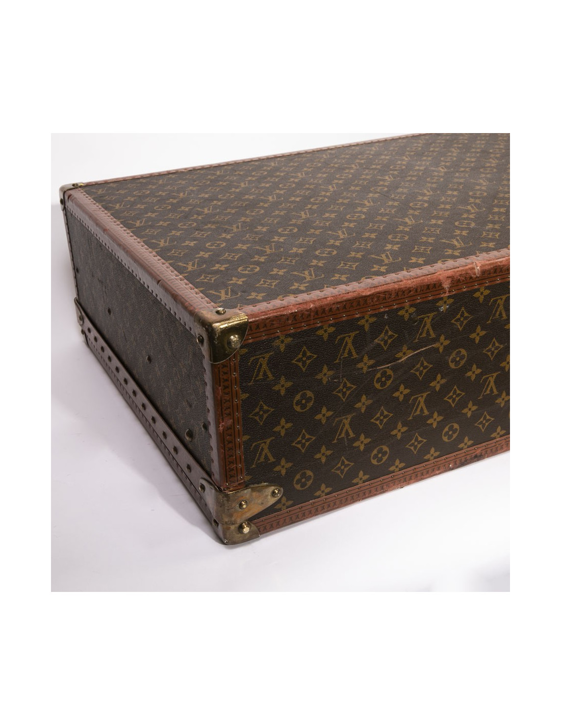 This magnificent second-hand trunk (hard suitcase)LOUIS VUITTON is monogram canvas. It is the Bisten 80 model. The hardware is in gold finish metal. The lining is in two layers of canvas (with holding straps). (small stains on the canvas). It can be carried by hand thanks to its rounded leather handle. The Louis Vuitton “S” lock (with two keys) is reinforced by two complementary latches for secure closure. The edges are in Monogram leather with reinforced rivets and gilded metal corners. A gilded “D.B” initials inscription is located under the lock. It has the address label holder. This suitcase is in very good state of use (wear marks and scratches on the canvas, and age-toned metalwork).