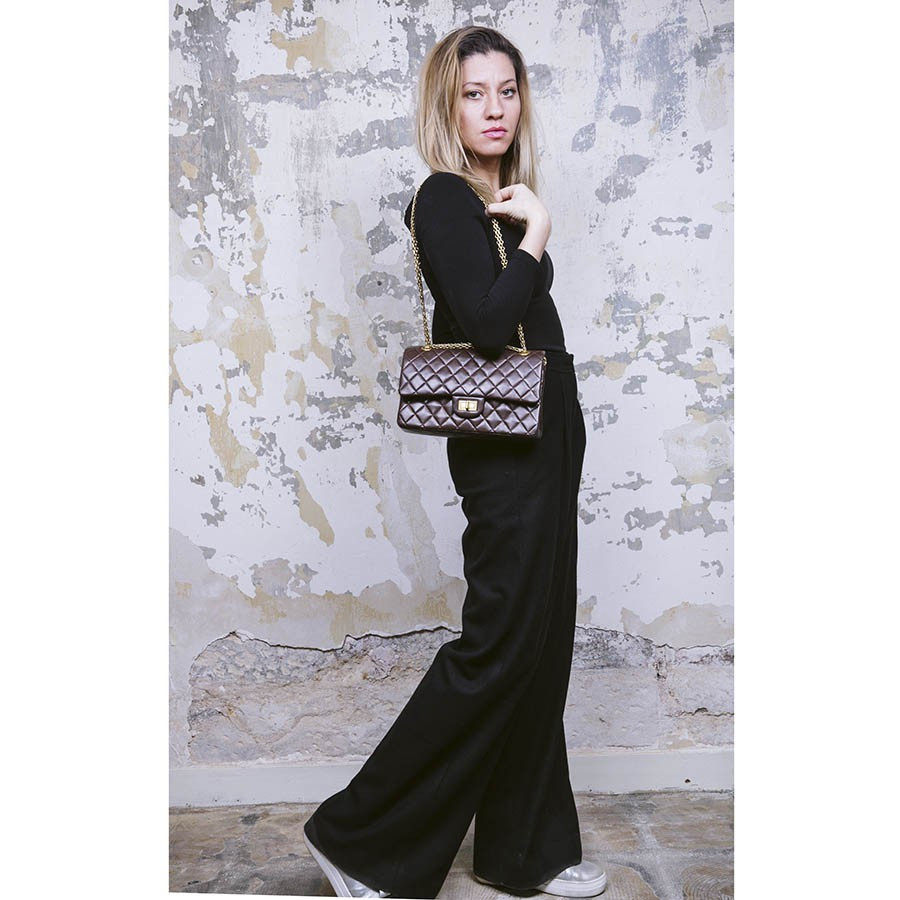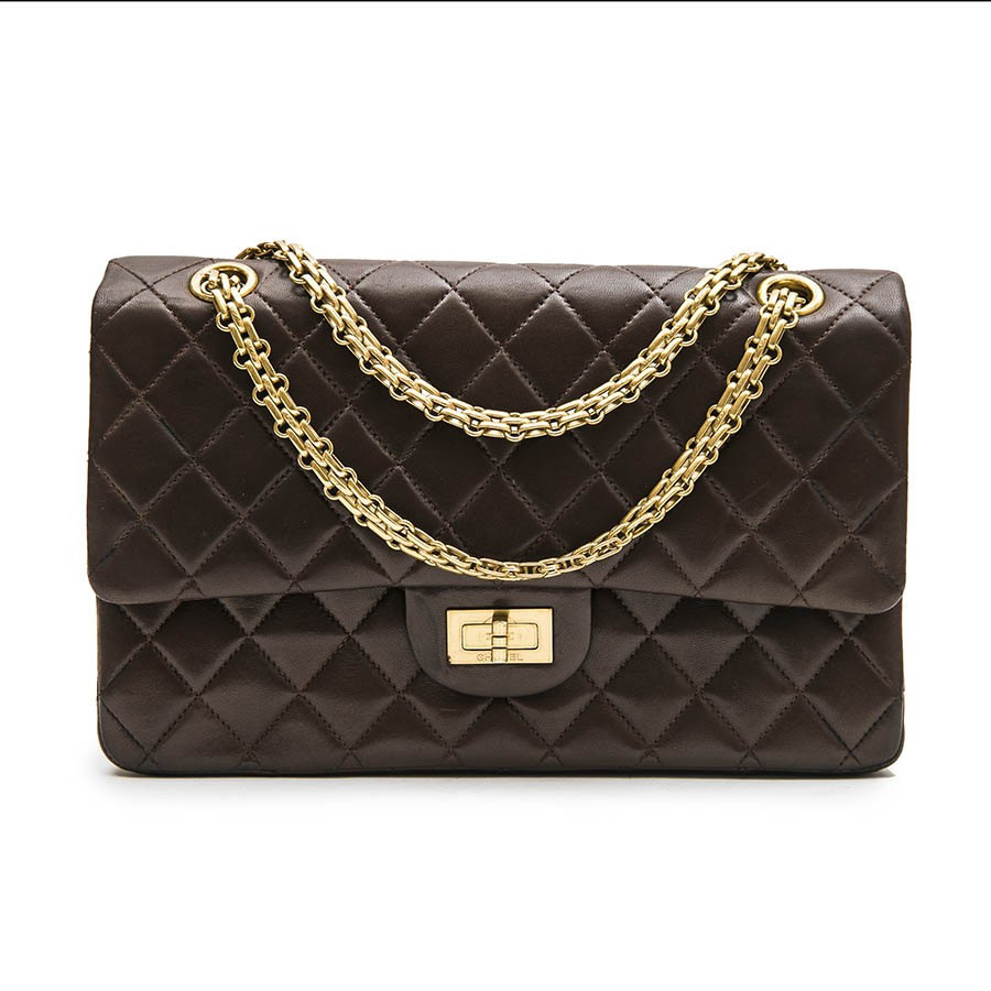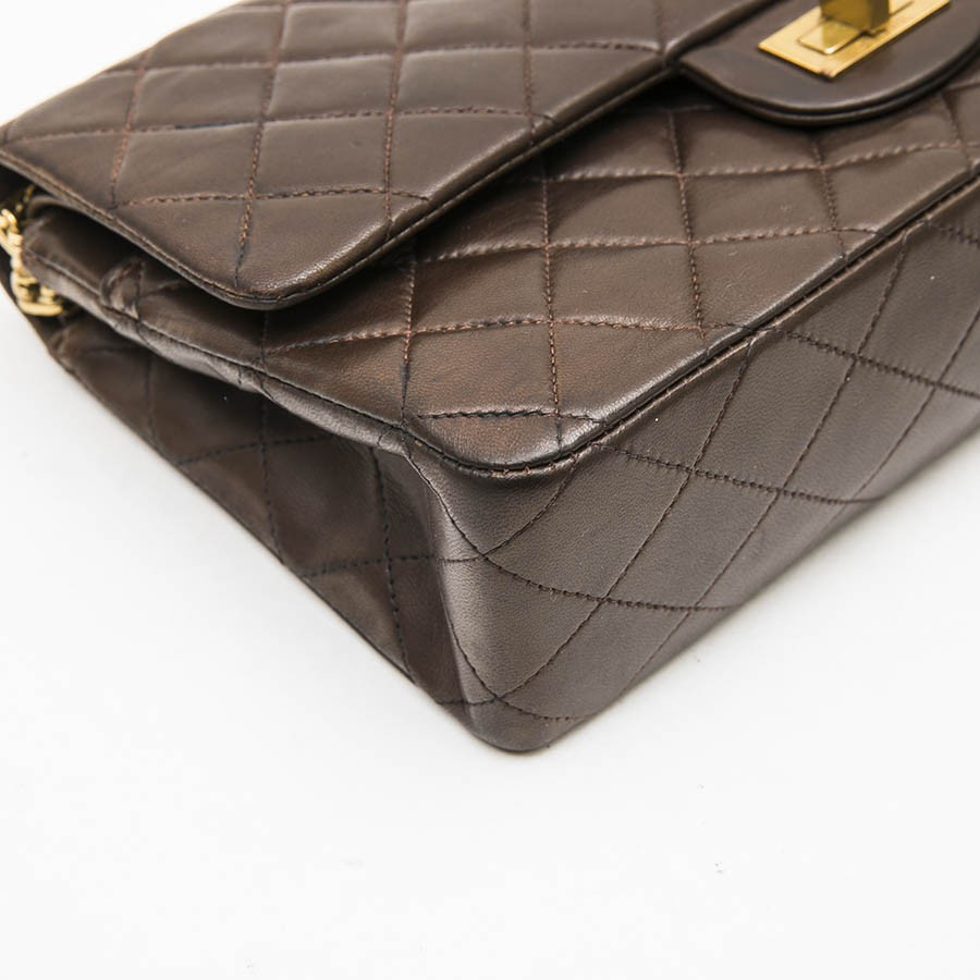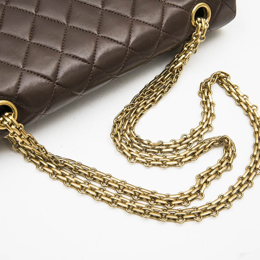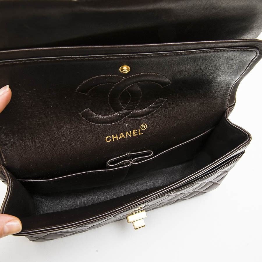 Chanel vintage Timeless double flap bag in brown smooth quilted lamb leather. Clasp 2.55. Gilded metal hardware.