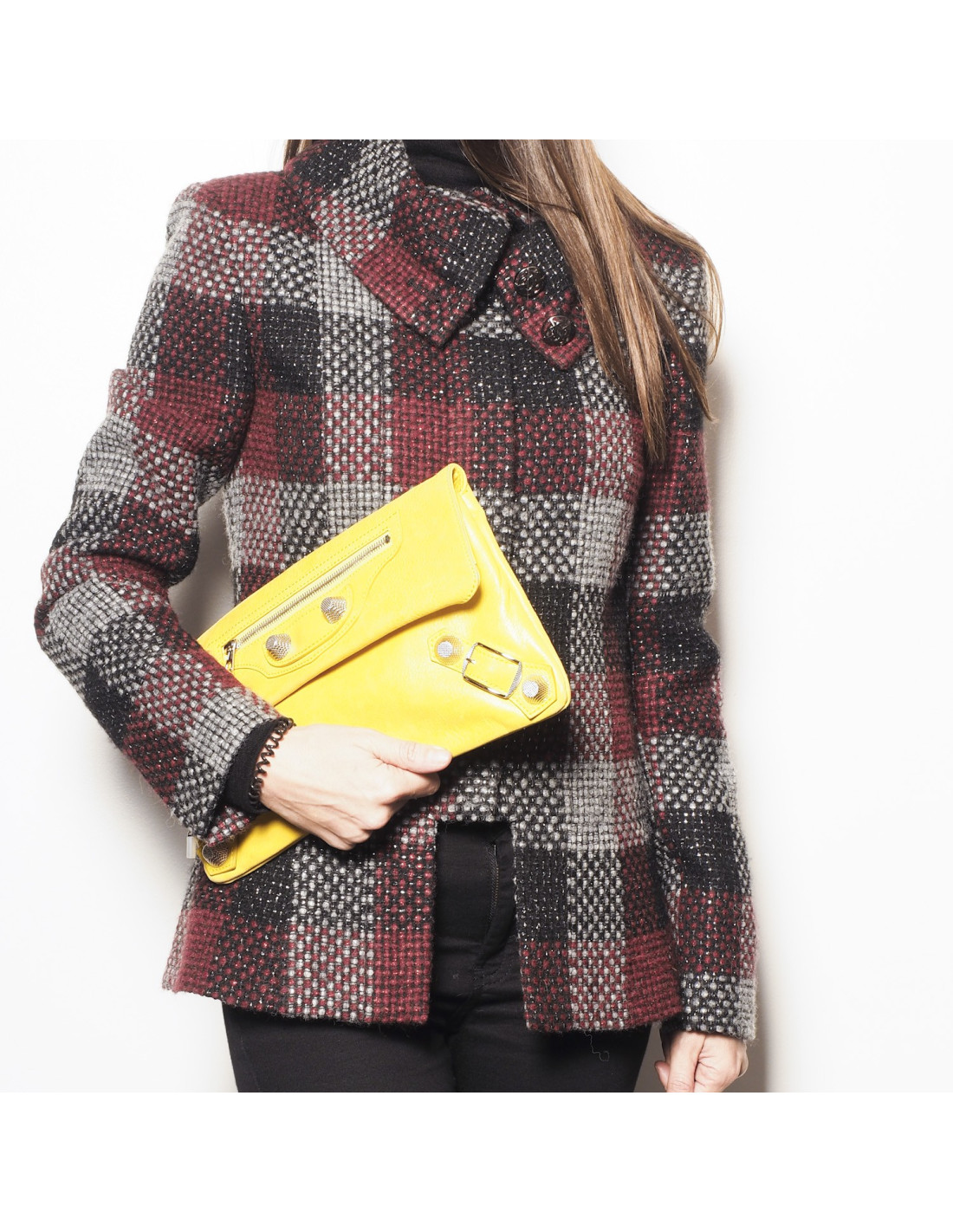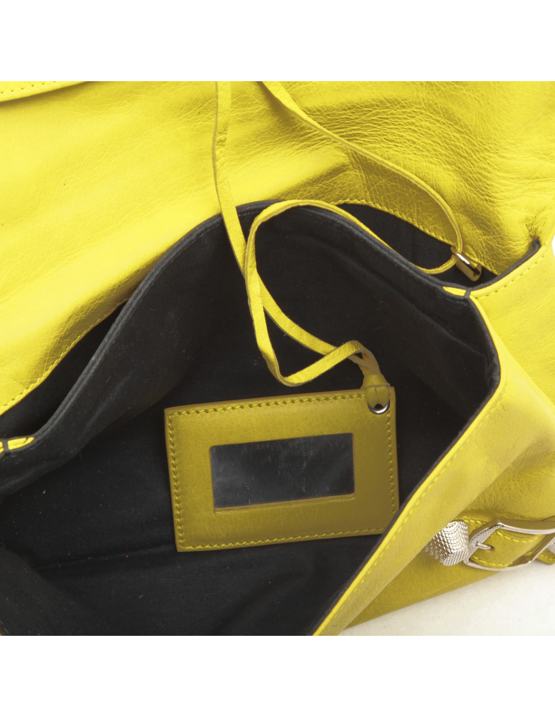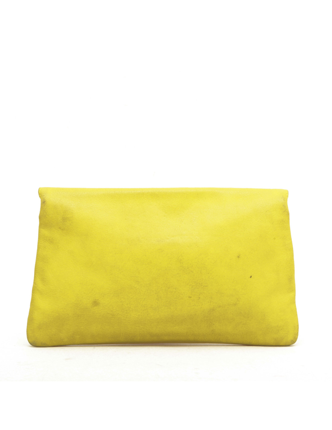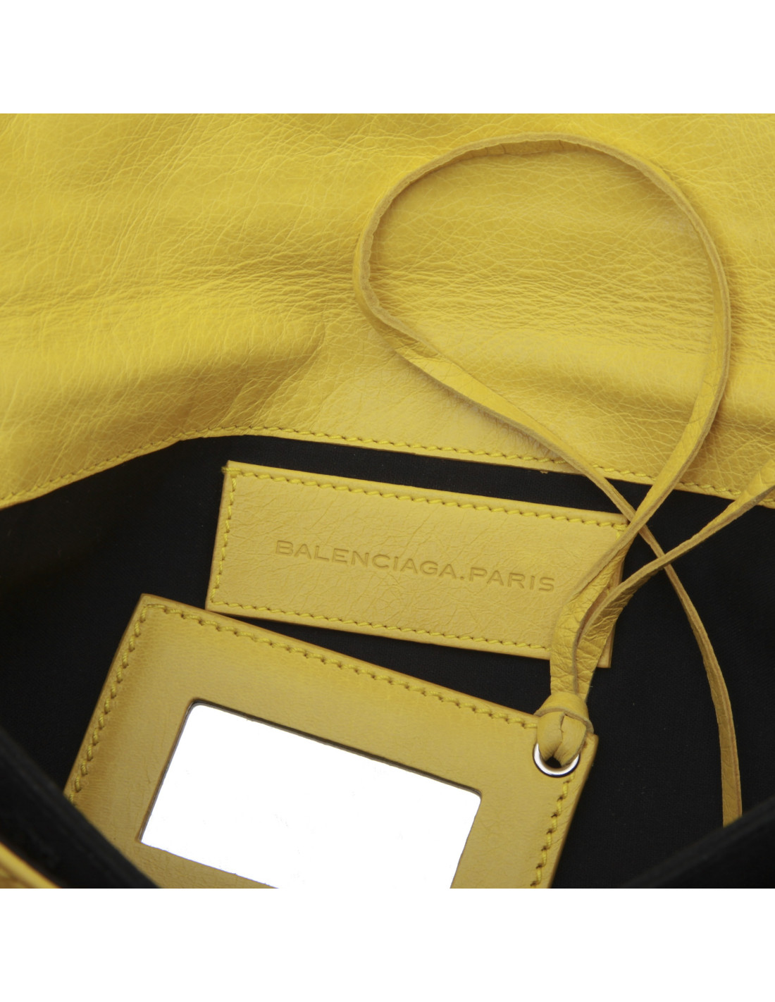 Balenciaga 'Giant Envelope' clutch in yellow leather. The interior is lined with black canvas. There is a large pocket closed by a snap button under the flap and two bellows and a mirror.
