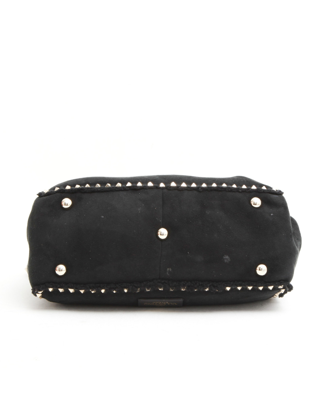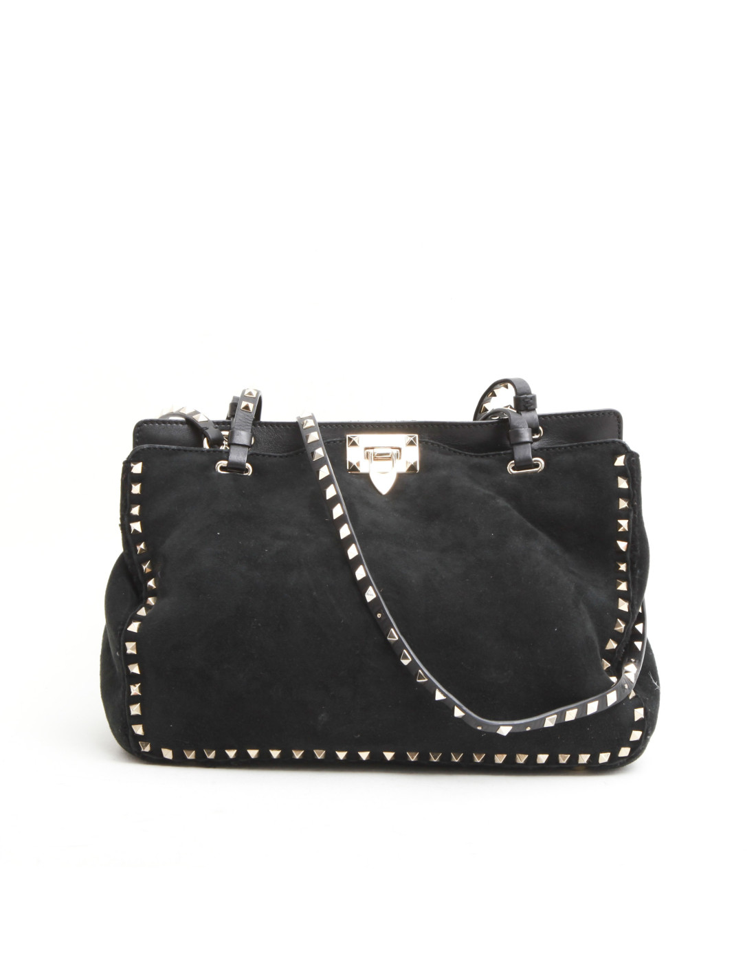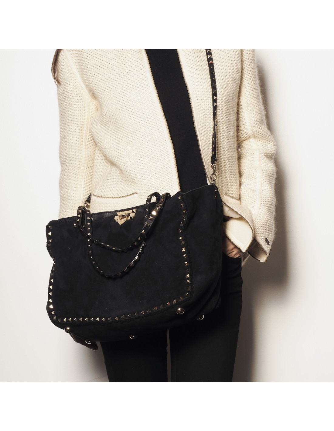 Valentino Rockstuds bag in black suede with gilded metal studs. Inside with a zipped pocket and two slits.