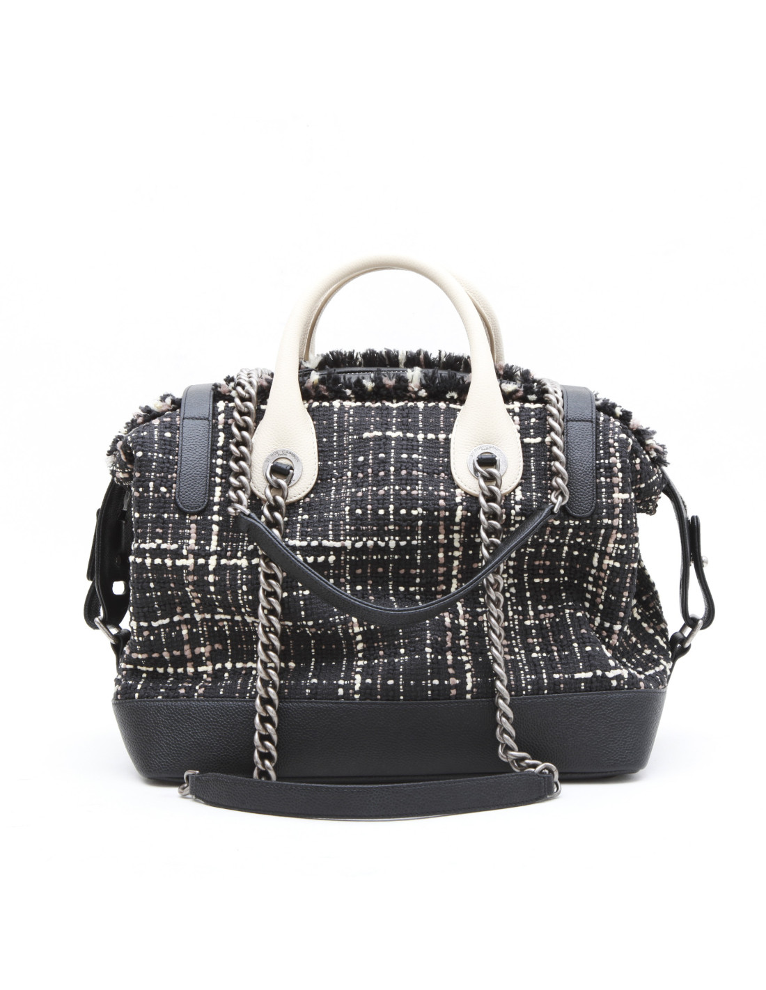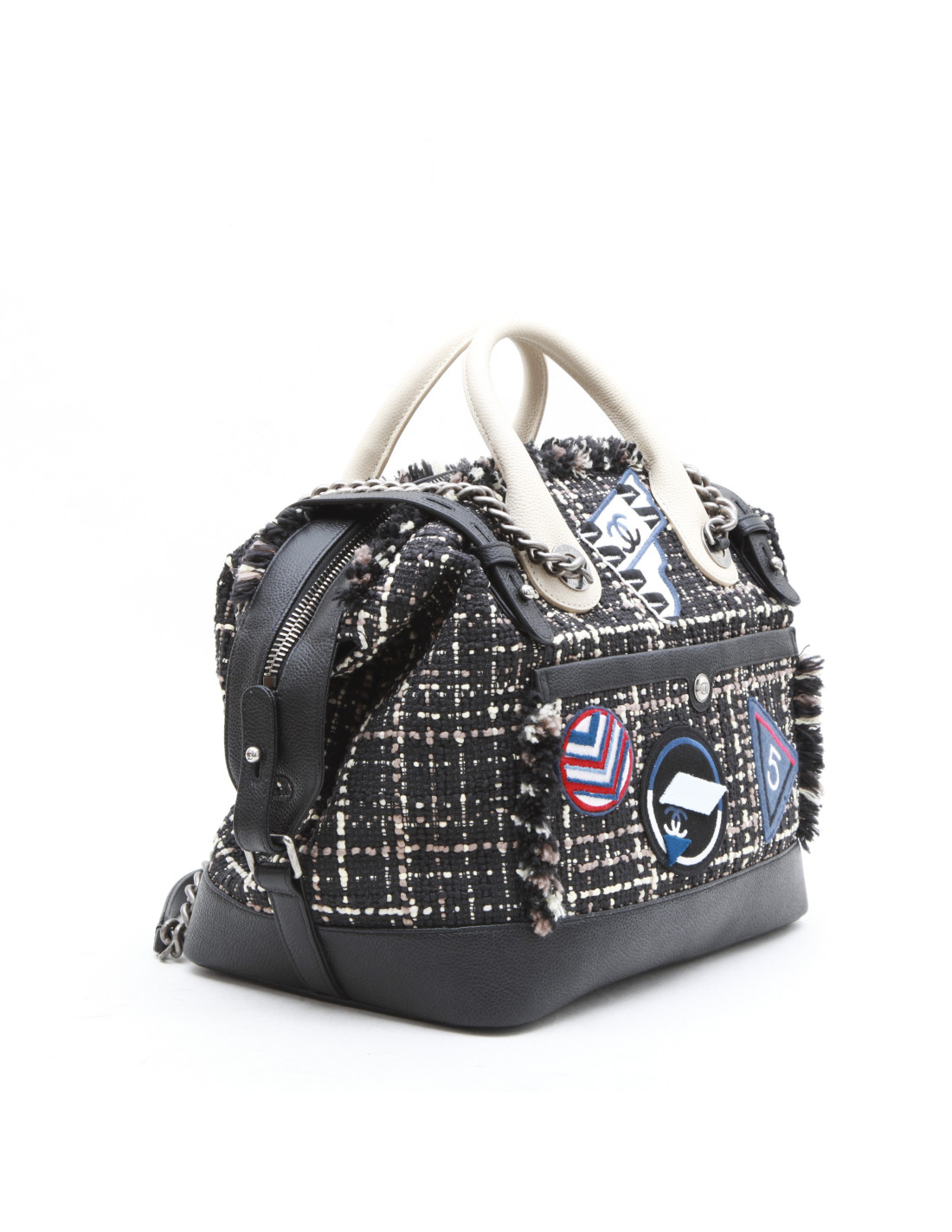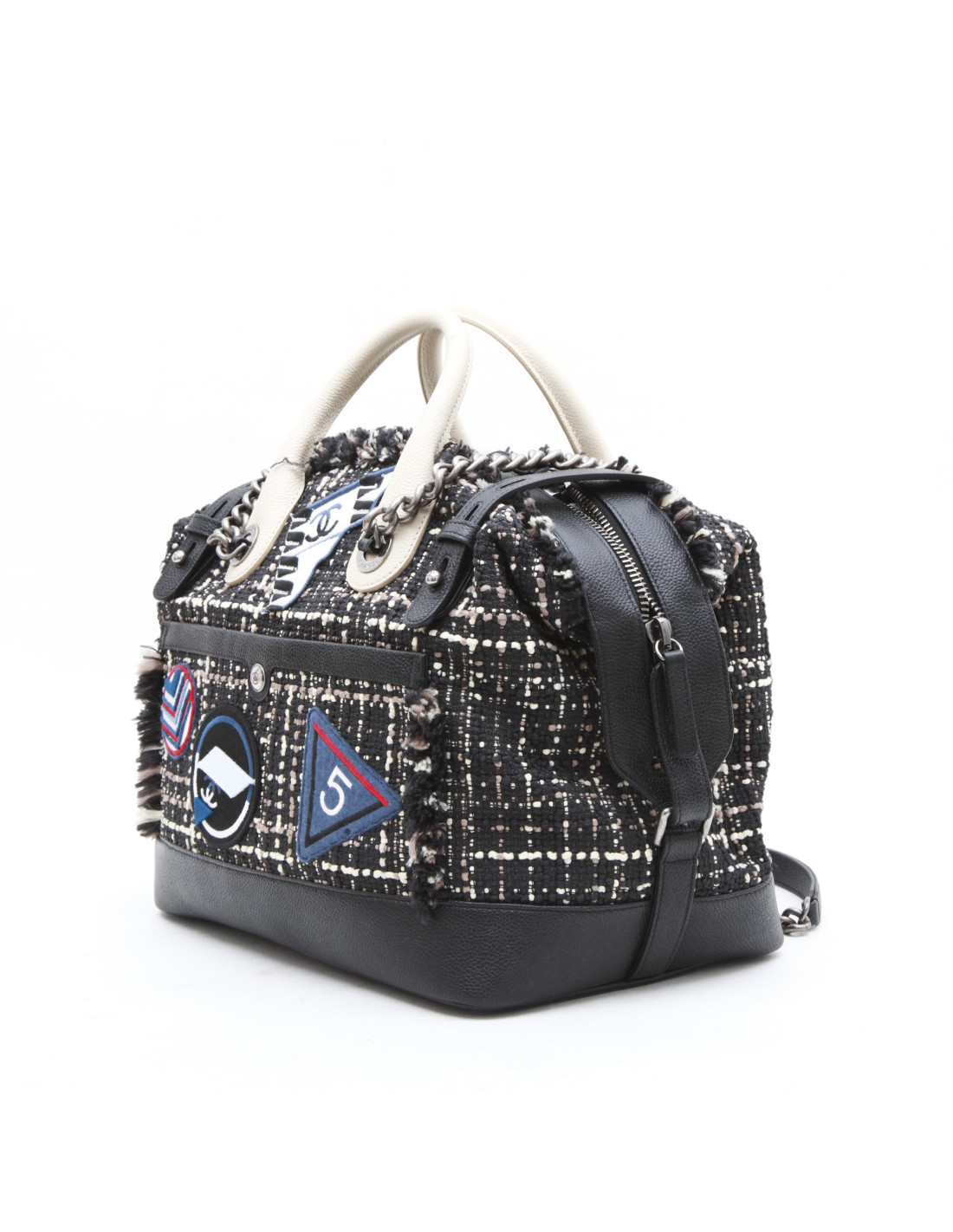 Collector. CHANEL "Airline" bag in black, beige and brown tweed. The bottom of the bag is entirely black grained leather as well as the top, the tabs and the handles. The interior is quilted black satin.