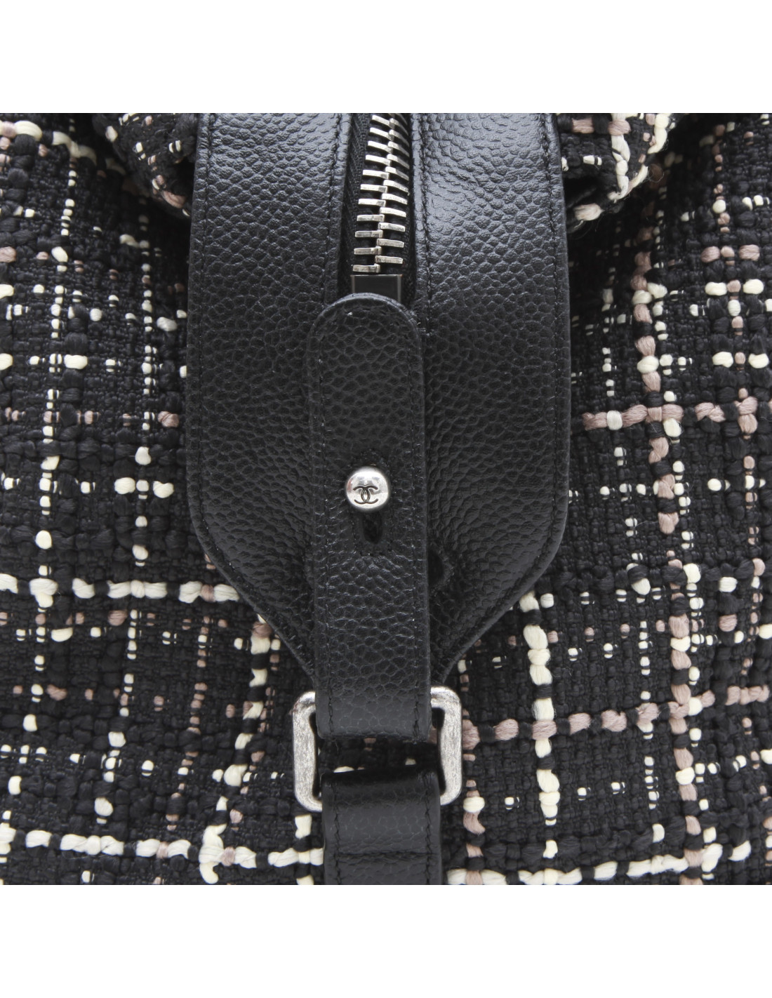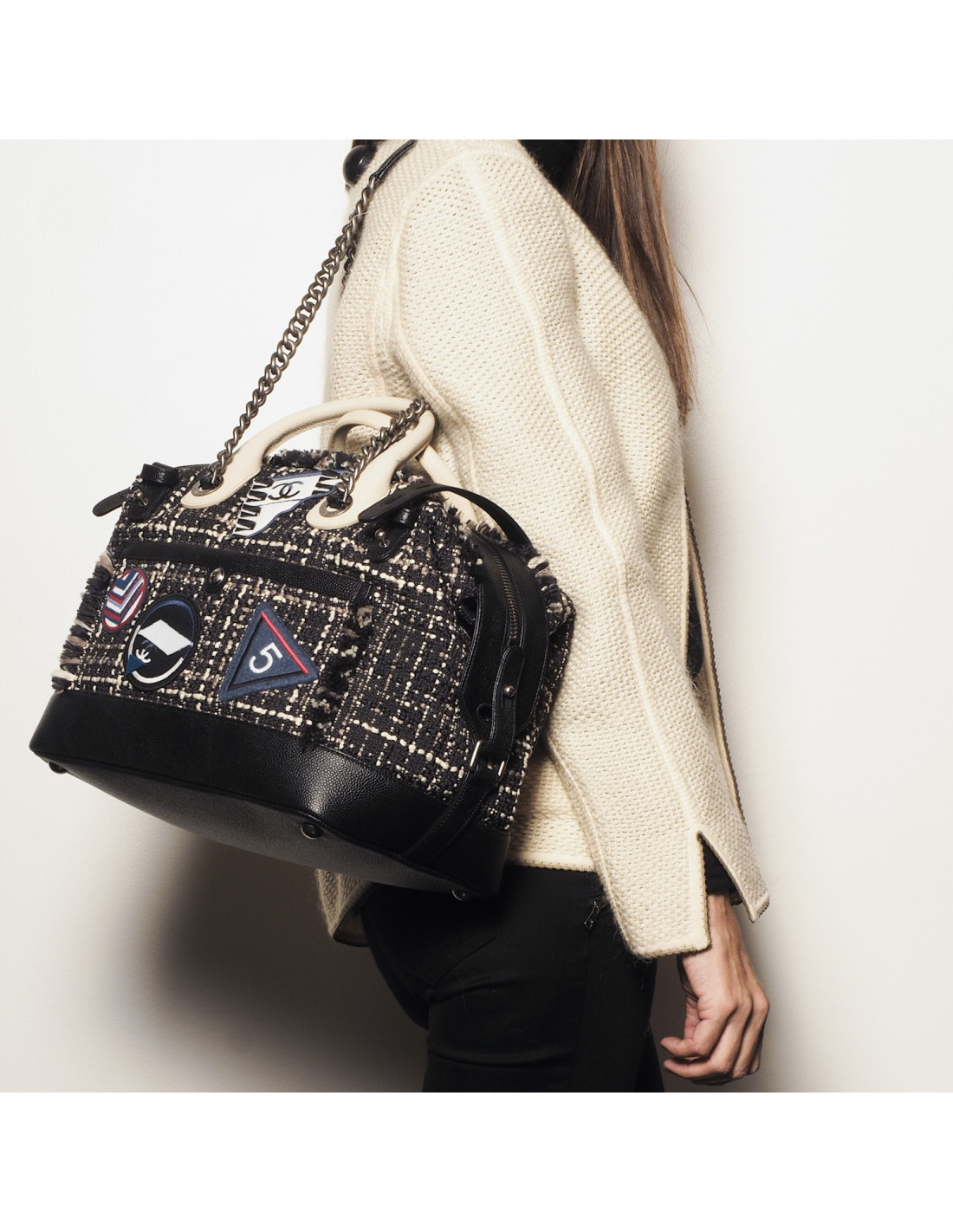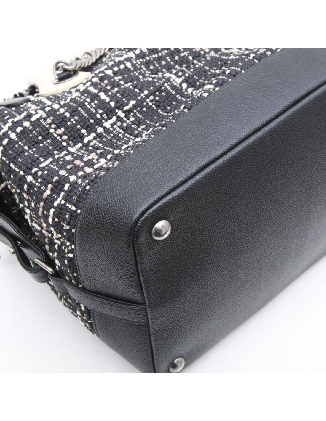 Collector. CHANEL "Airline" bag in black, beige and brown tweed. The bottom of the bag is entirely black grained leather as well as the top, the tabs and the handles. The interior is quilted black satin.