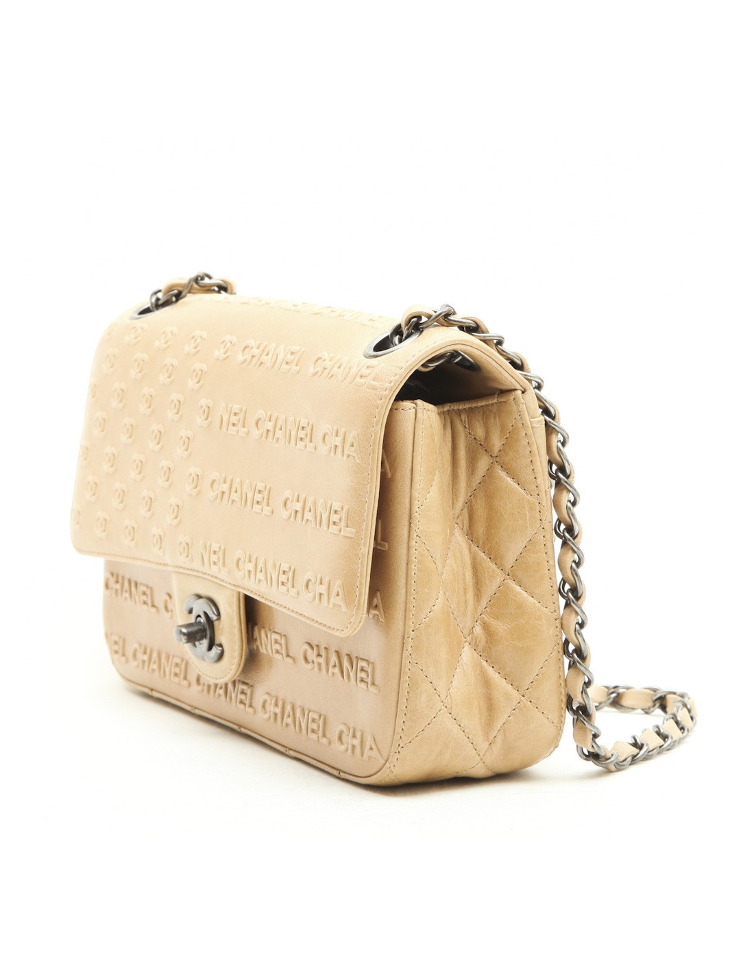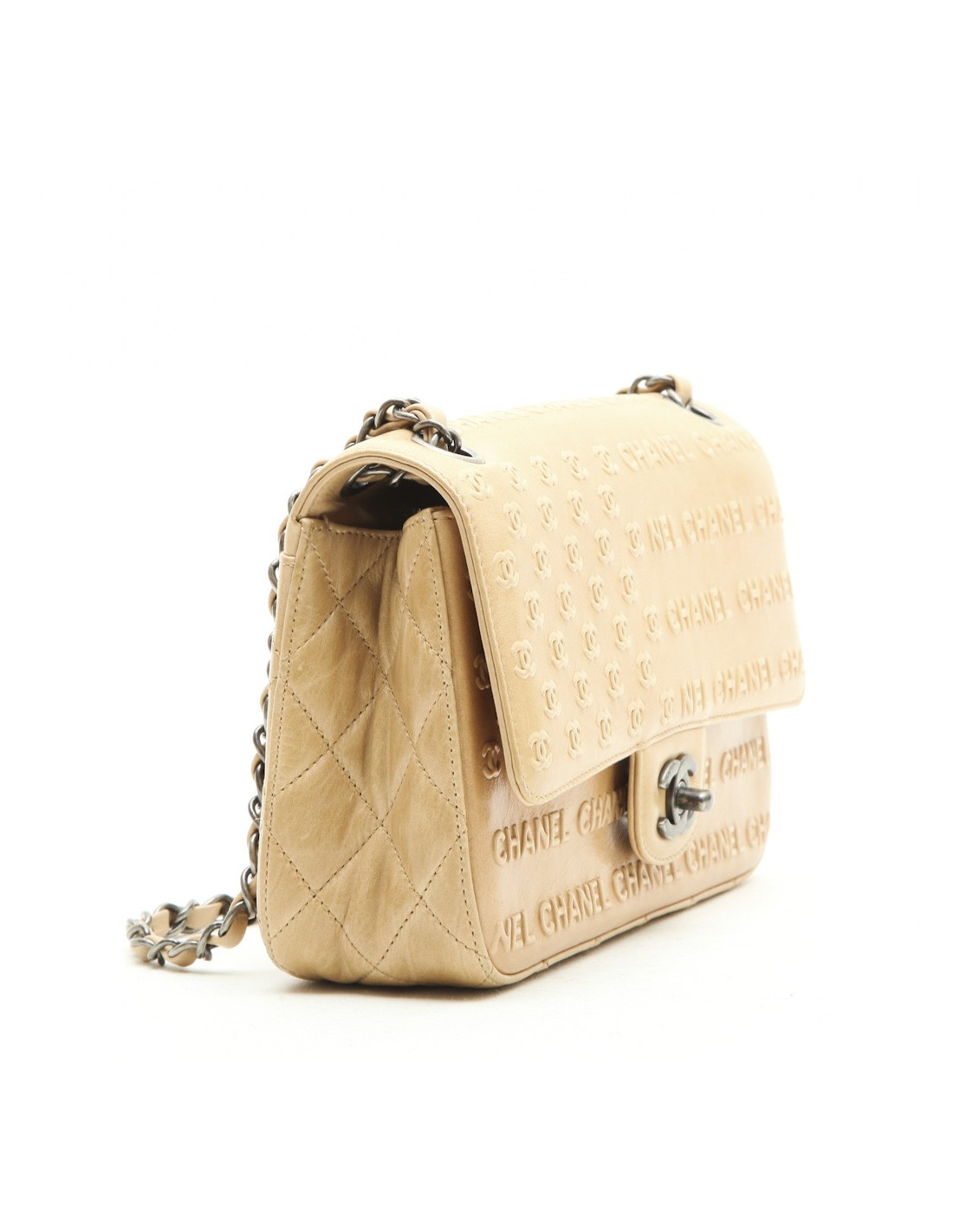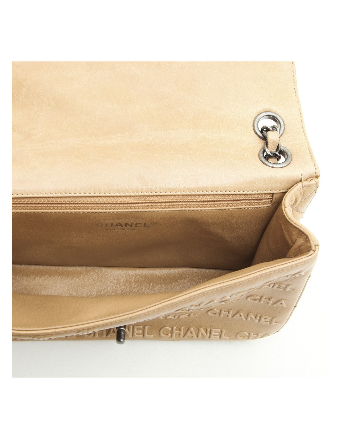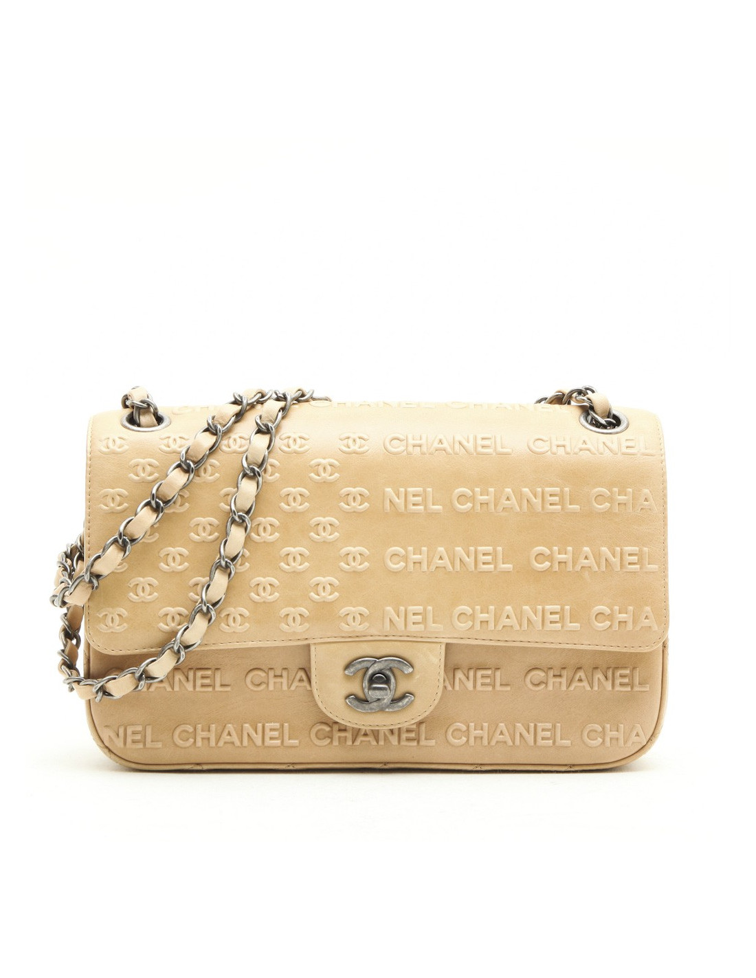 Chanel 'Timeless' bag in embossed 'CC' and 'CHANEL' beige. Aged silver metal hardware.