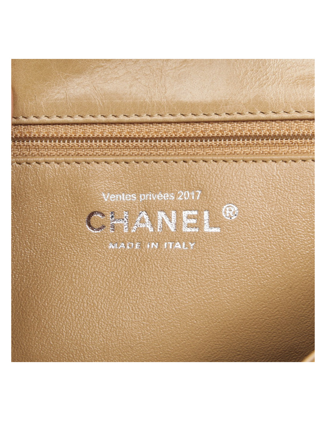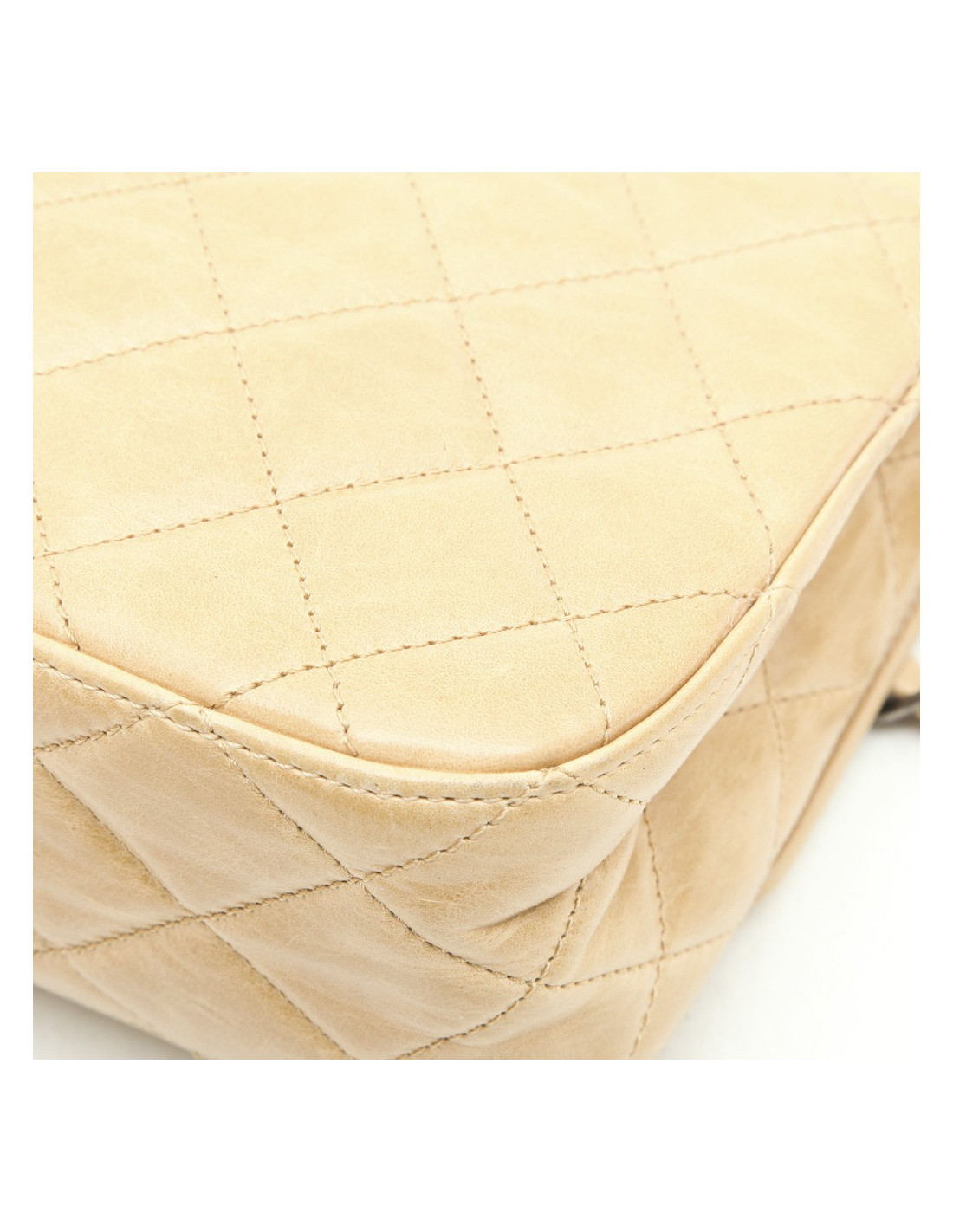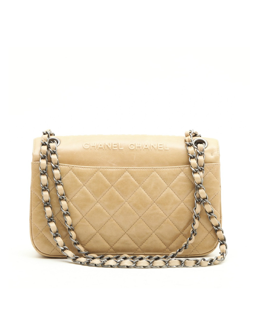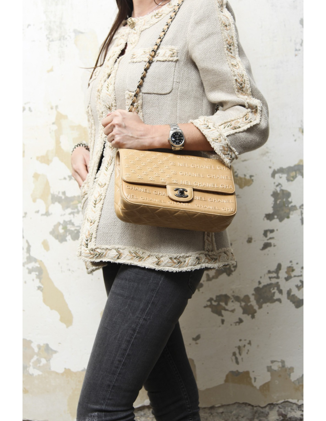 Chanel 'Timeless' bag in embossed 'CC' and 'CHANEL' beige. Aged silver metal hardware.