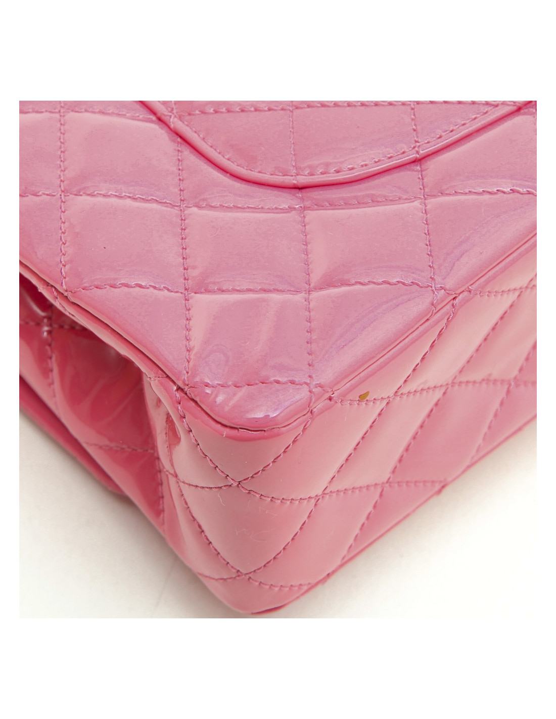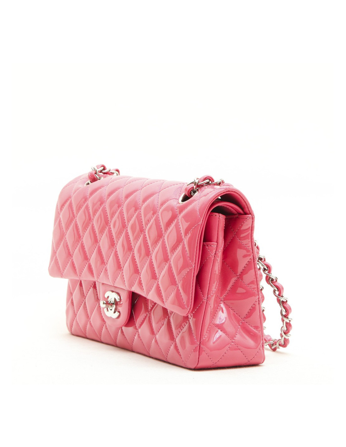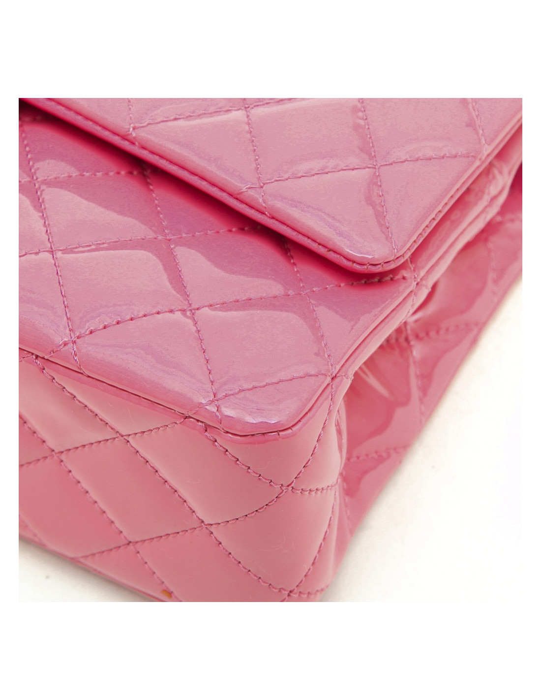 Chanel 'Timeless' double flap bag in pink patent leather. Silver metal hardware.