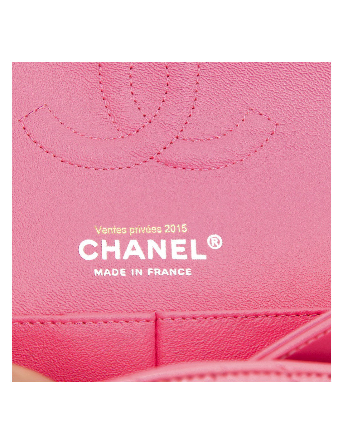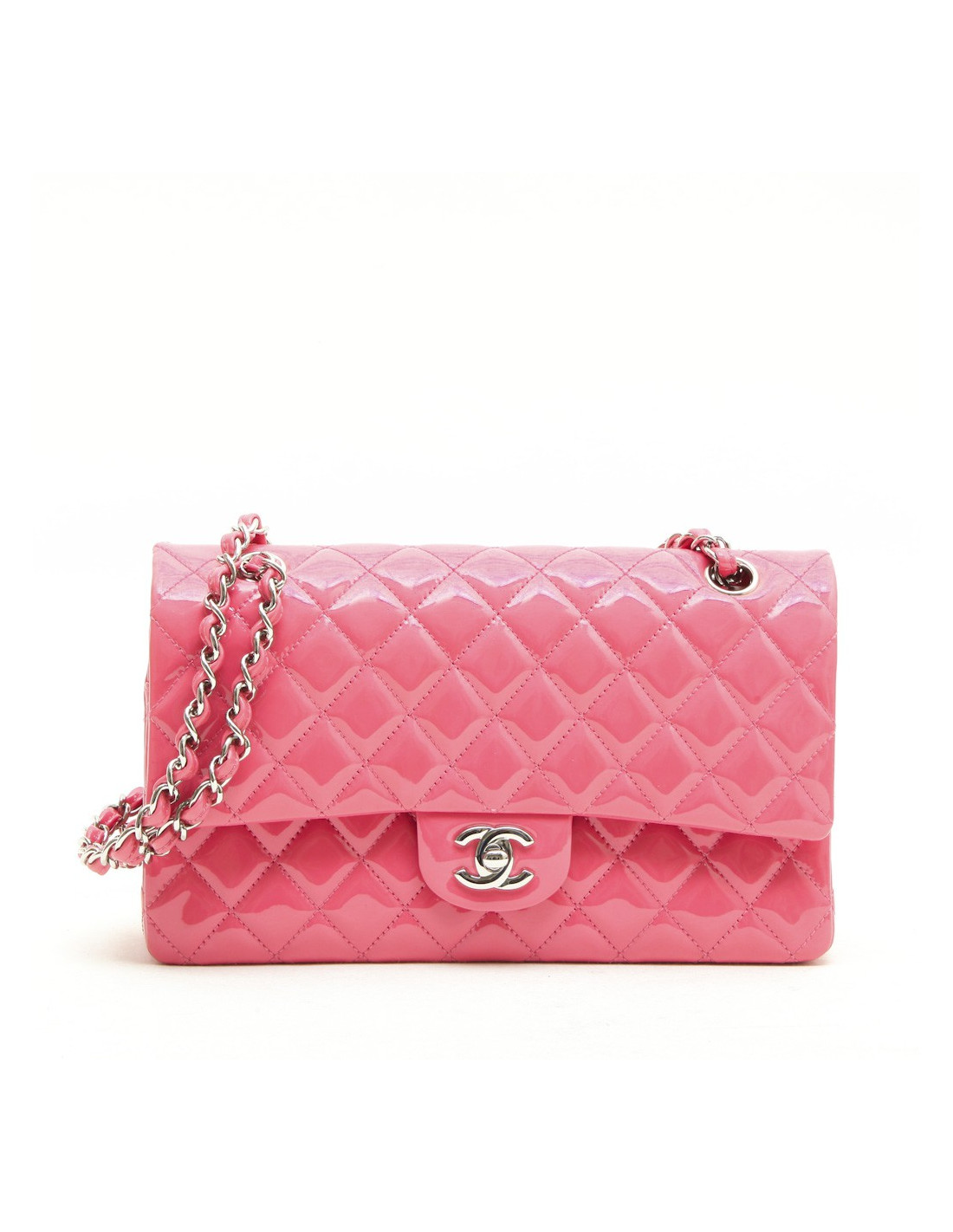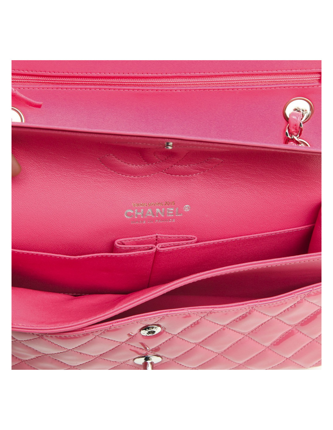 Chanel 'Timeless' double flap bag in pink patent leather. Silver metal hardware.