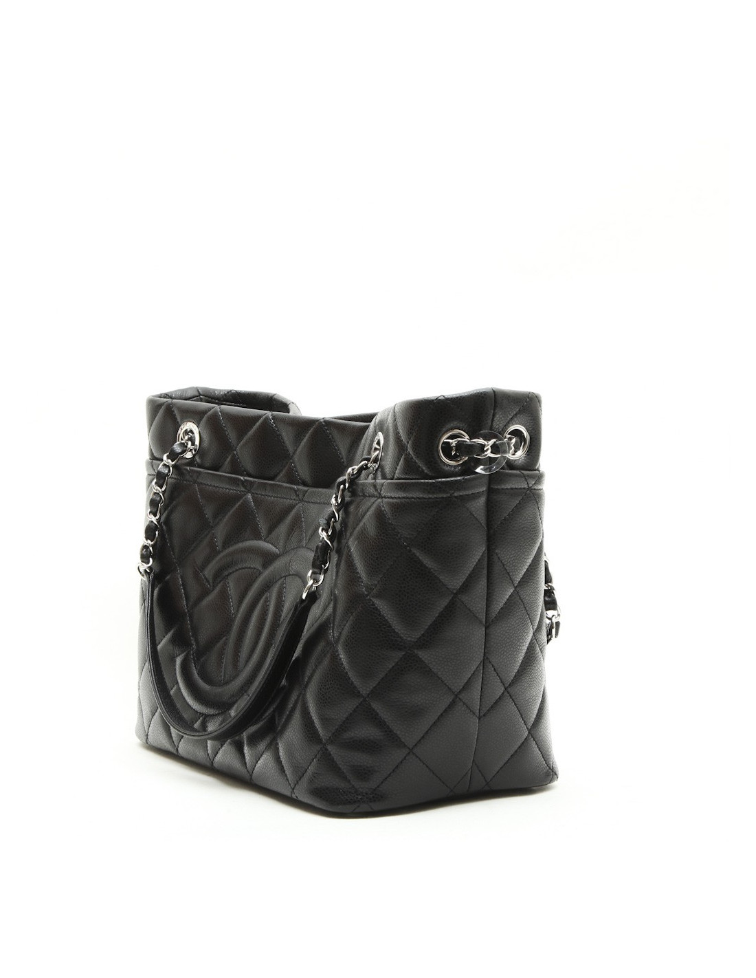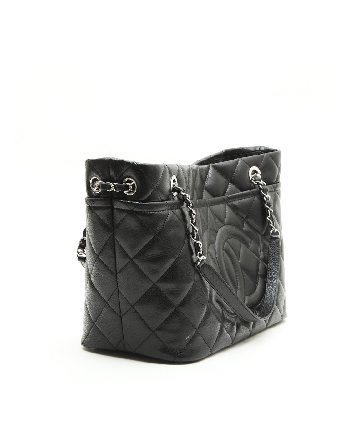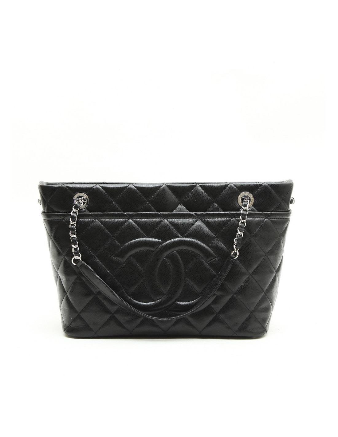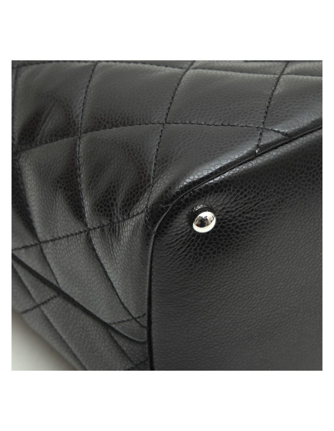 Chanel GM black grained leather tote bag. New condition. Silver metal hardware. Snap closure.