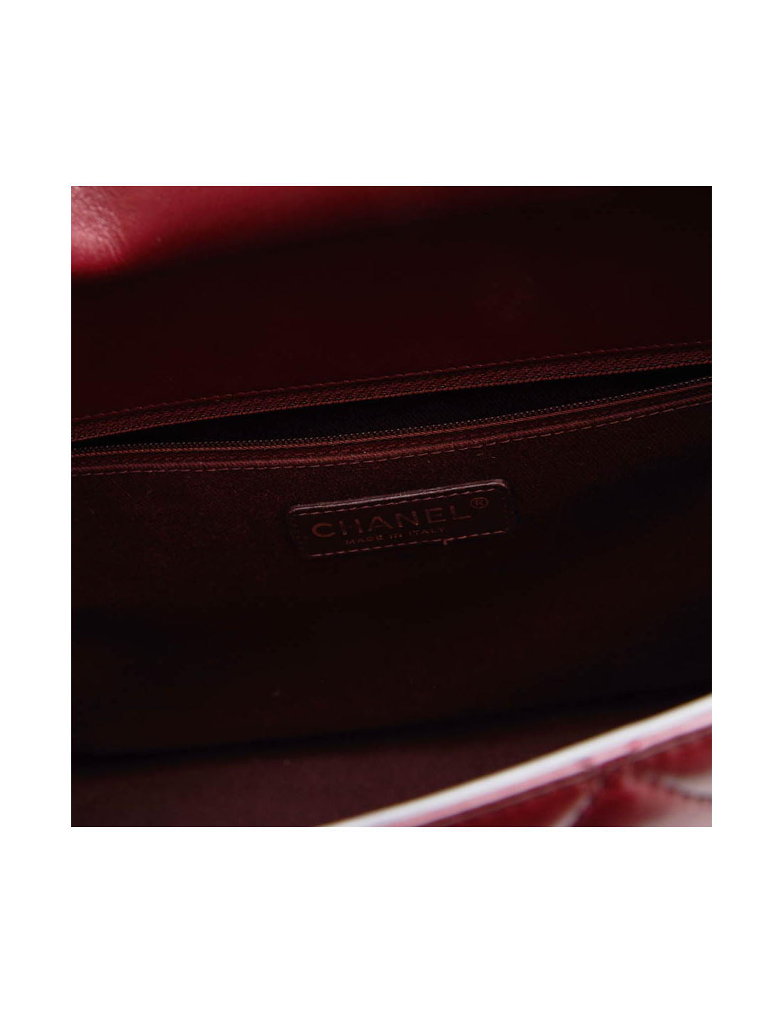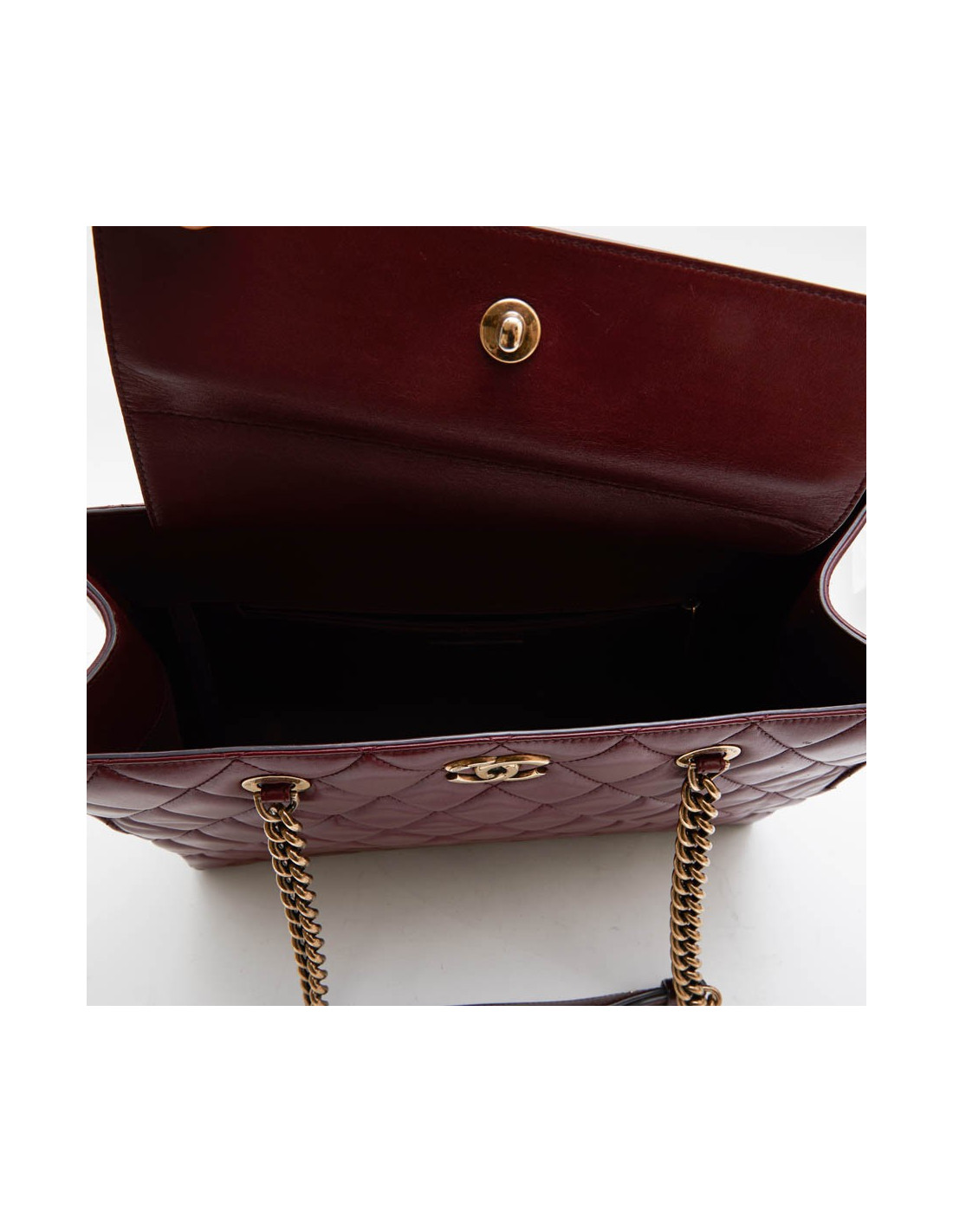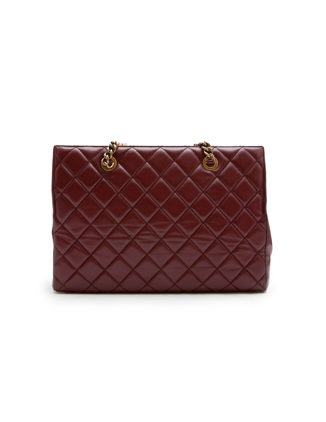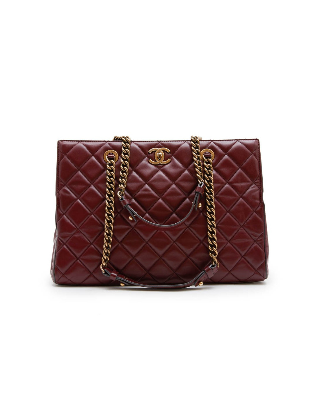 Chanel tote bag in burgundy quilted leather. Aged gilded metal hardware. The interior is in burgundy fabric with 3 pockets including one zipper.