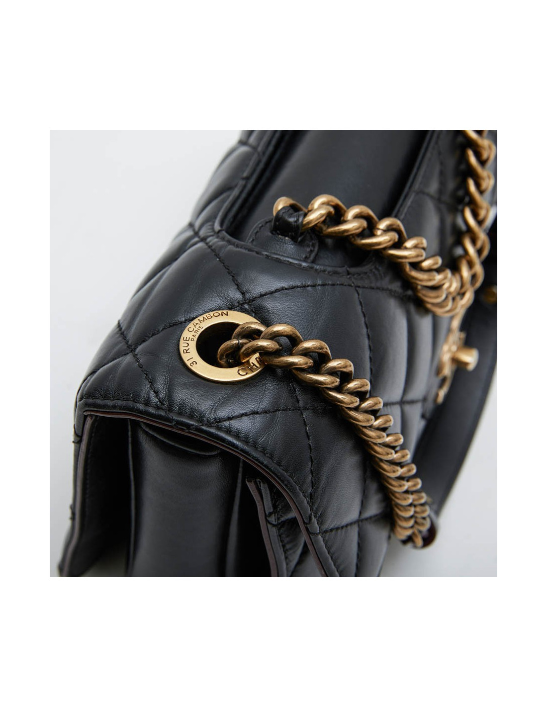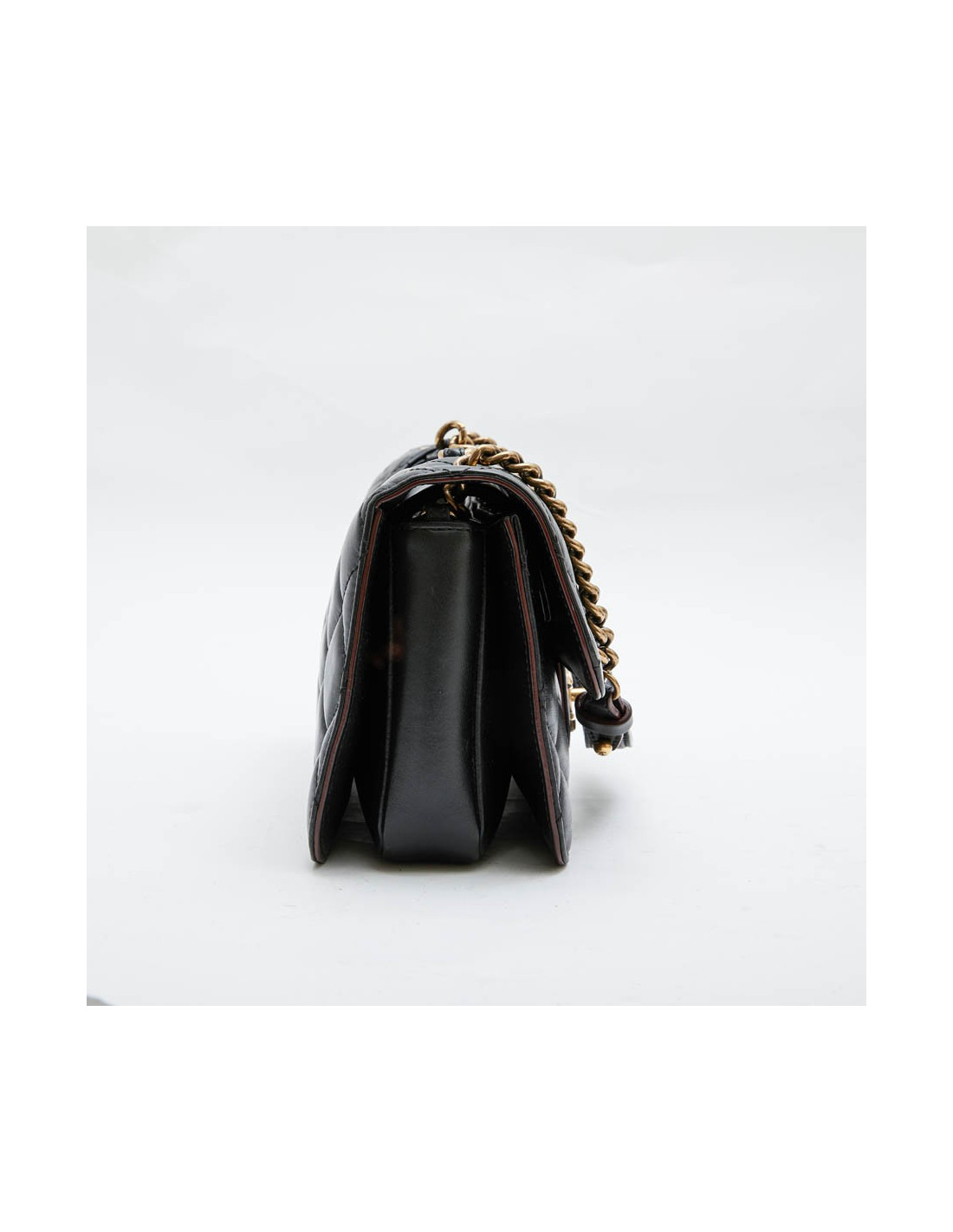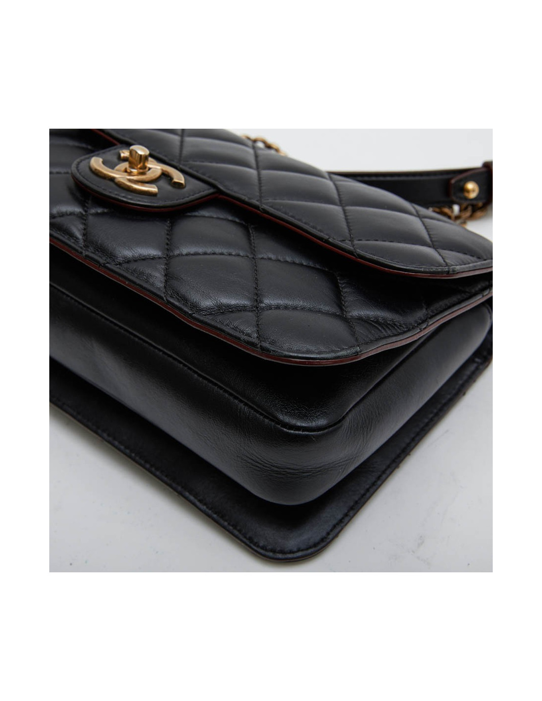 Collector. Chanel double flap bag, 'Pondicherry' model 'Paris-Bombay' collection, in black quilted leather and bordeaux borders. Antique coppered gold metal hardware. Worn by hand using a small chain or shoulder with a chain shoulder strap and black leather shoulder.