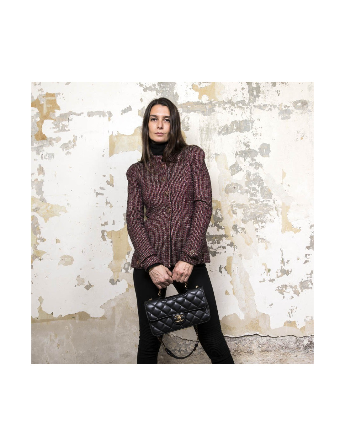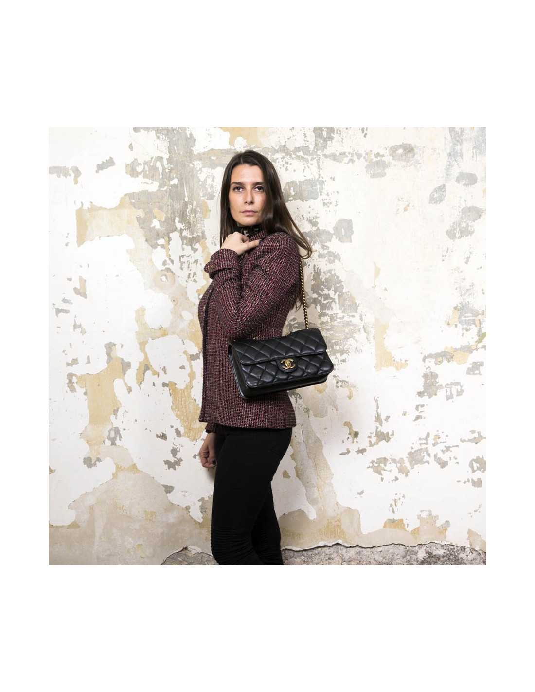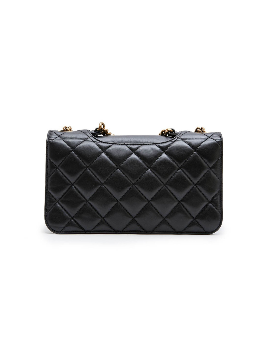 Collector. Chanel double flap bag, 'Pondicherry' model 'Paris-Bombay' collection, in black quilted leather and bordeaux borders. Antique coppered gold metal hardware. Worn by hand using a small chain or shoulder with a chain shoulder strap and black leather shoulder.