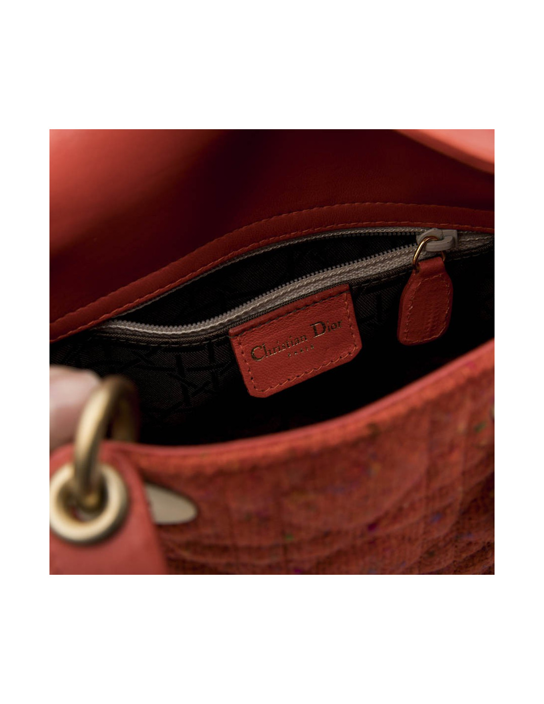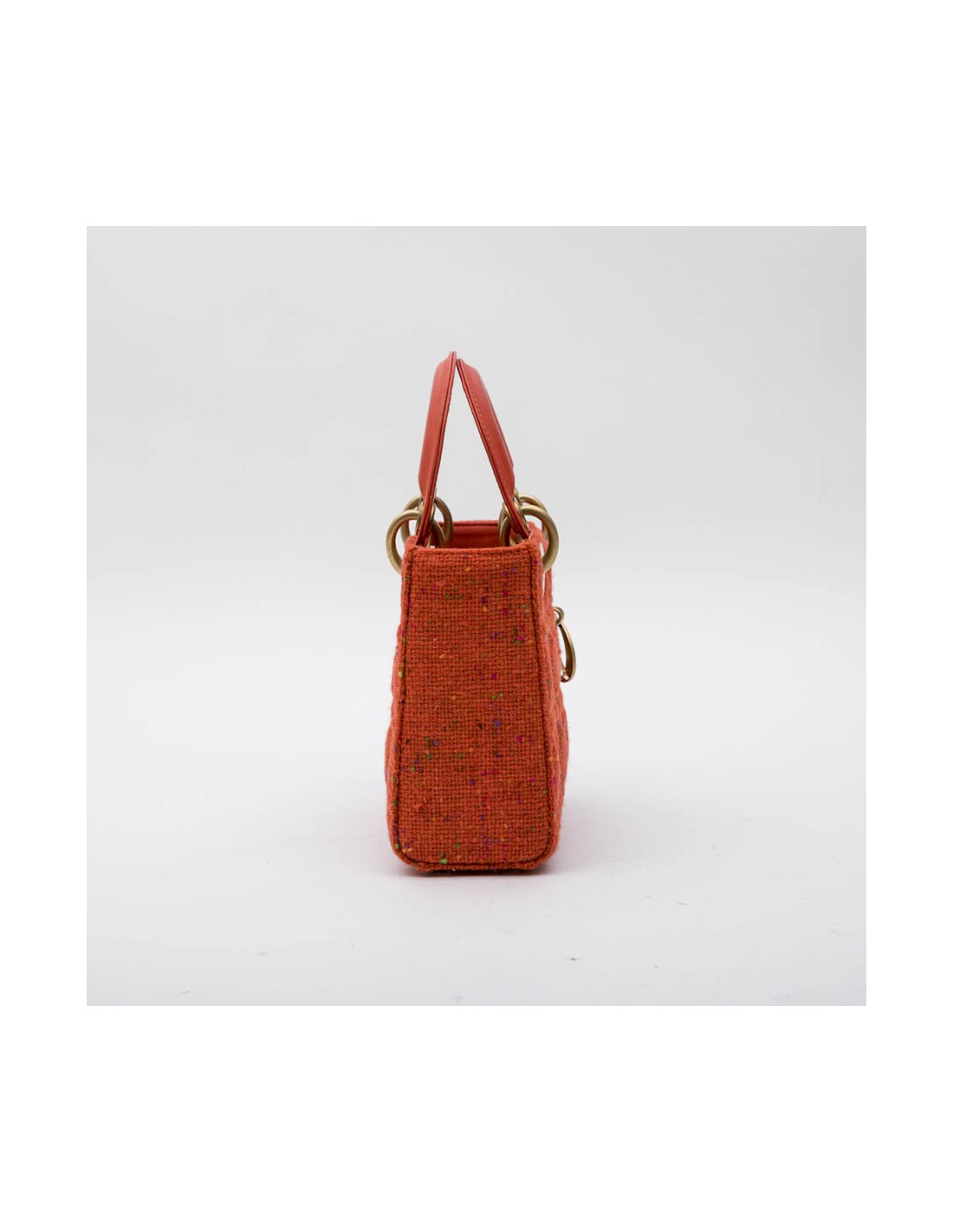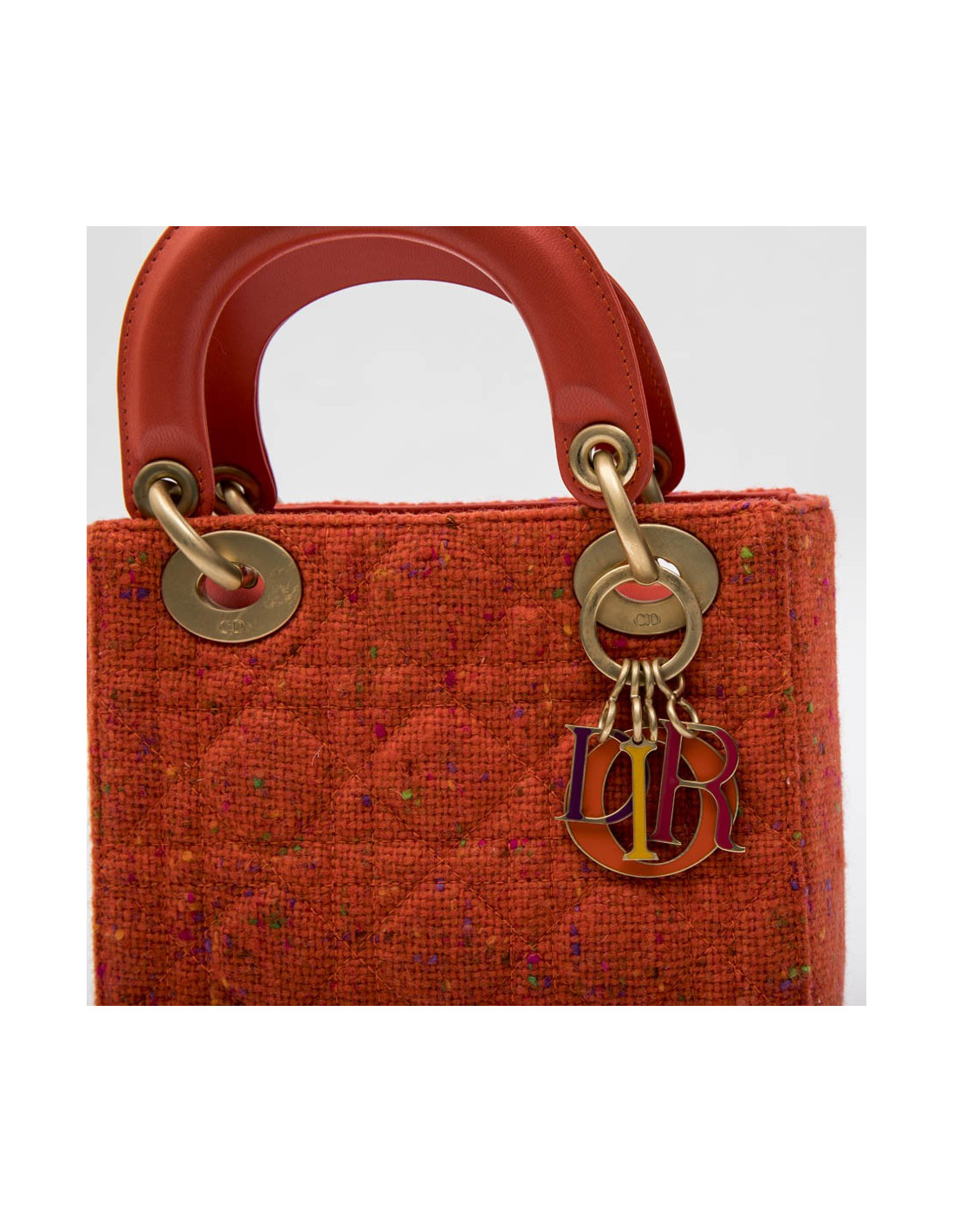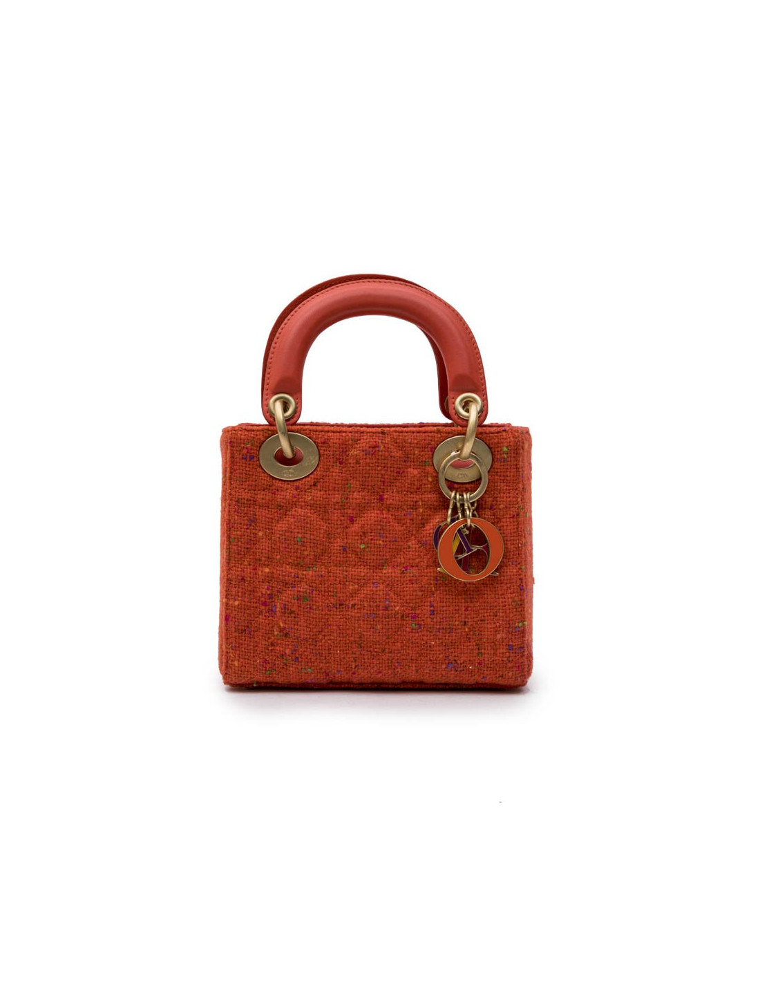 Christian Dior 'Lady D' mini bag in coral tweed and Coral smooth lamb leather finishes. Matte gilded metal hardware. Block multicolored charms 'D.I.O.R'.