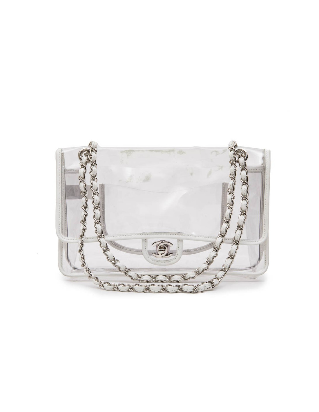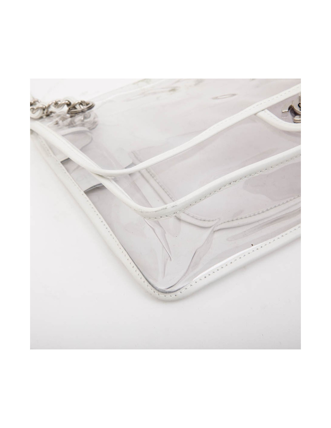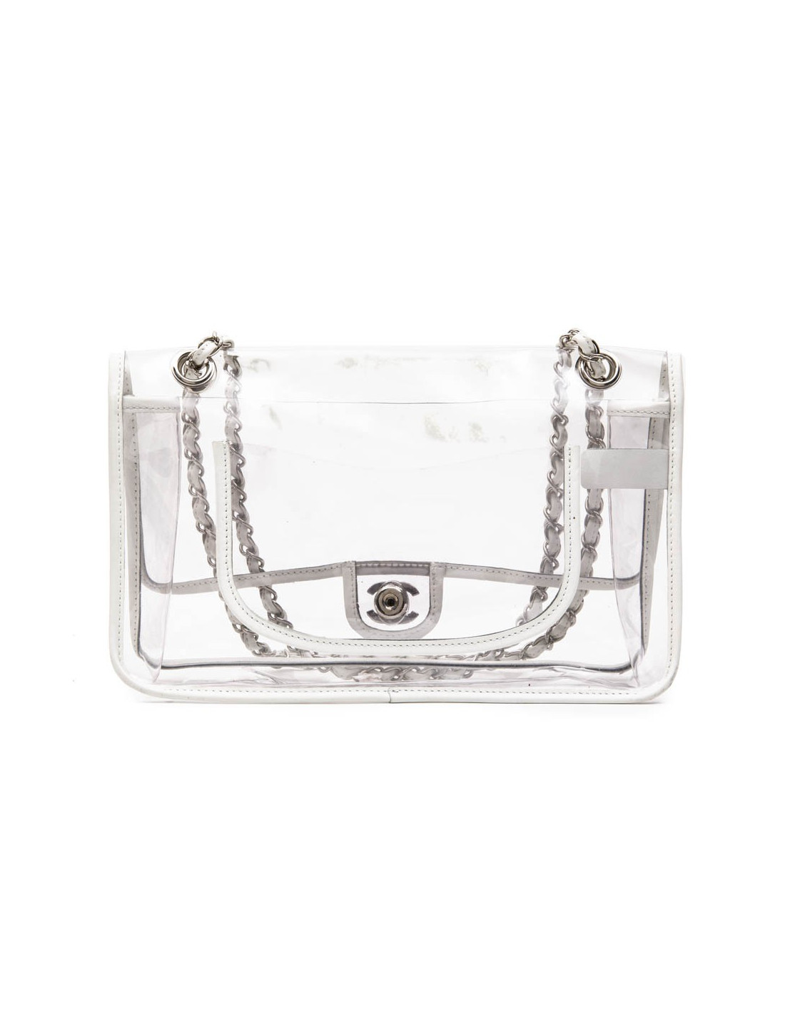 Chanel Timeless bag in transparent plastic and piping in white lamb leather. Silver metal hardware. Clasp 'CC'. Braided chain interlaced with leather and palladium silver metal