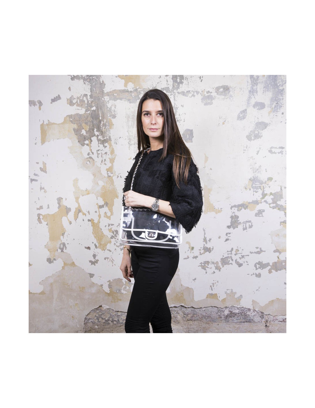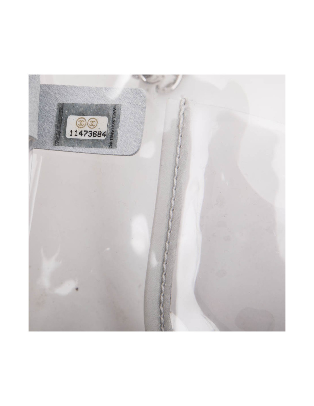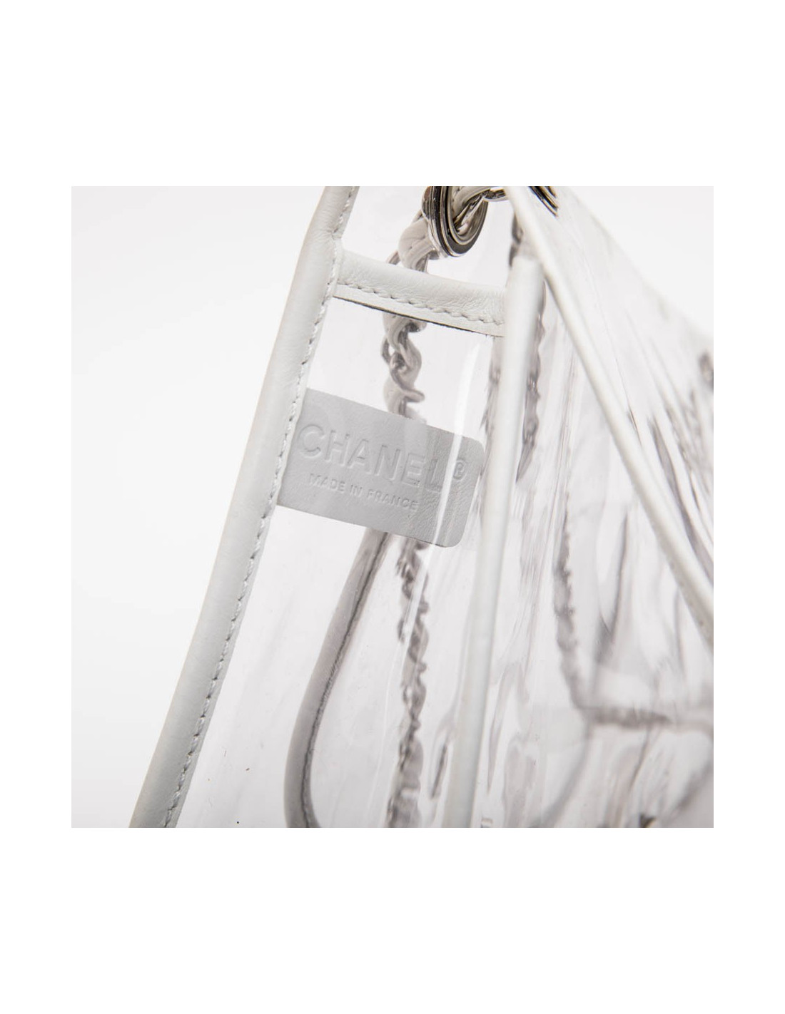 Chanel Timeless bag in transparent plastic and piping in white lamb leather. Silver metal hardware. Clasp 'CC'. Braided chain interlaced with leather and palladium silver metal