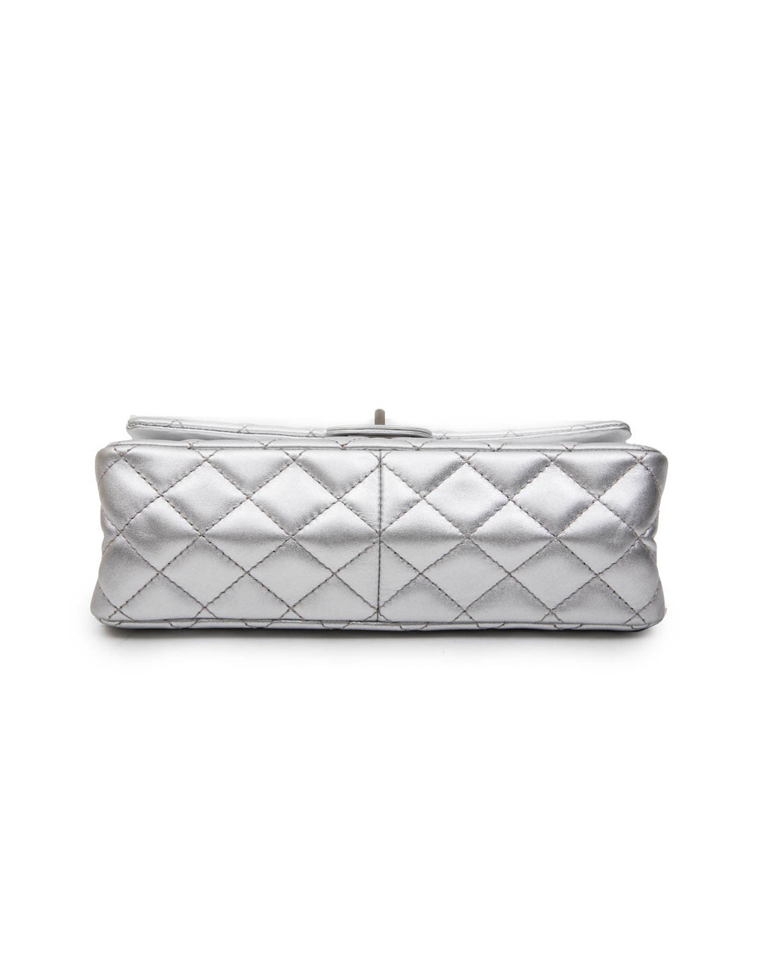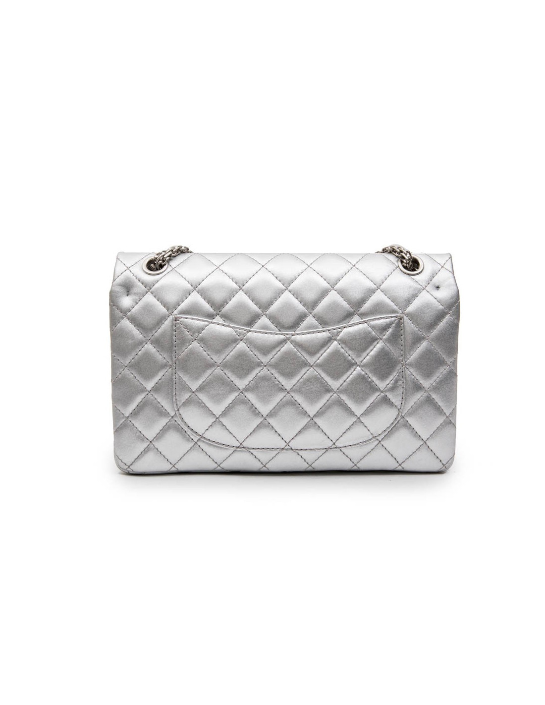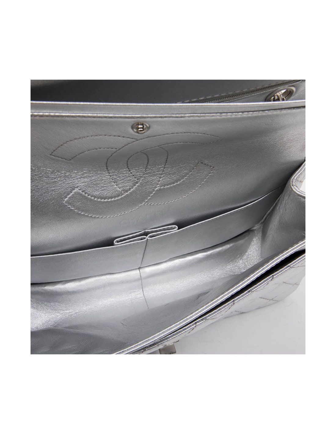 Chanel 'Timeless' double flap bag in silver quilted leather. Clasp 2.55. Matt silver hardware. The interior is fully lined in silver leather. Made in France.