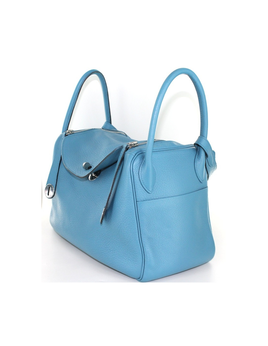 Taurillon clemence leather HERMES LINDY bag blue jean, palladium jewelry. Double zipper closure. Demi-bandouliere and double handle. Two pockets on each side of the bag. The clasp is abbreviation "HERMÈS PARIS". Inside this mythical bag has two flat pockets. This bag has underwent a full renovation treatment of leather. It is therefore in very good condition. On the bottom of the bag, four dots of protection. "HERMÈS PARIS" slightly inscriptions erased by the renovation. Made in France.
