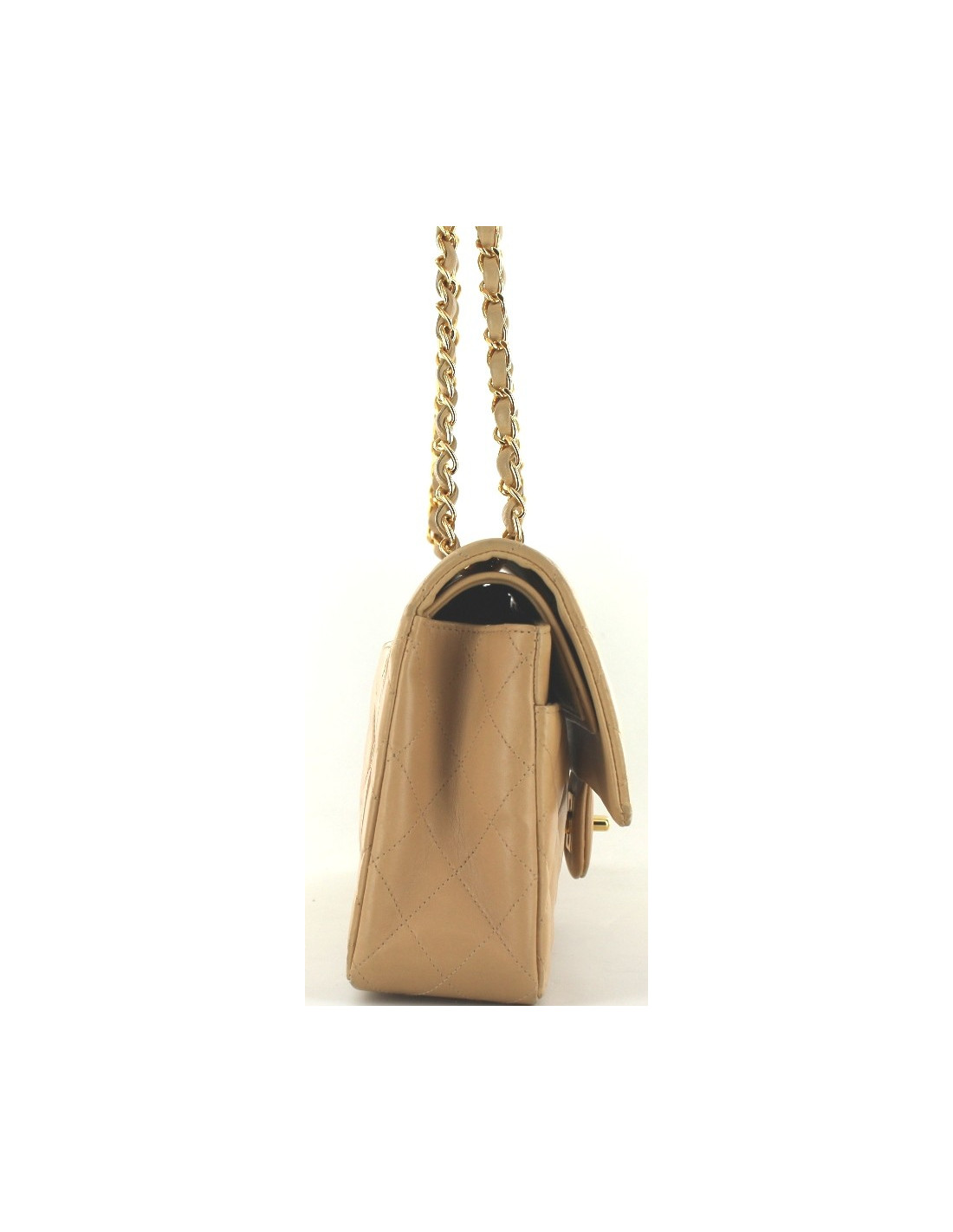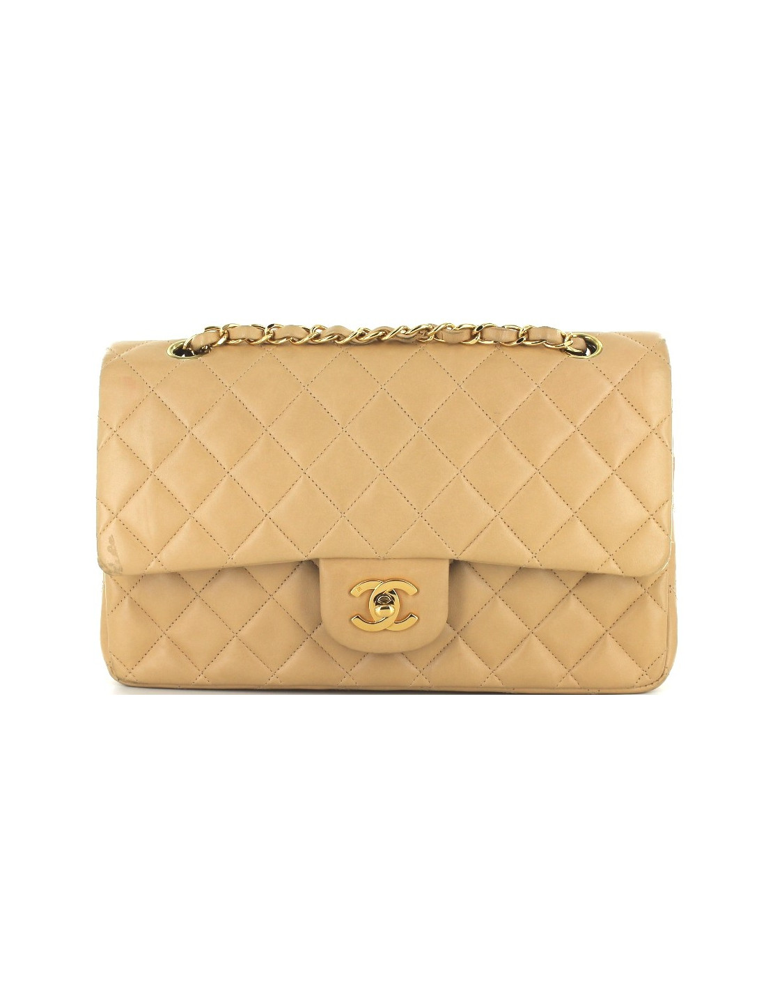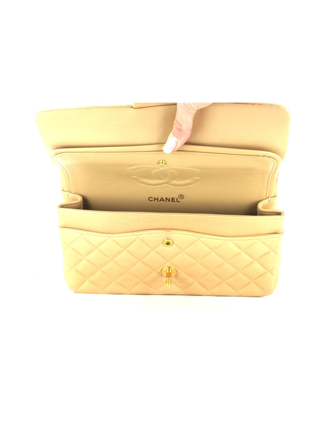 Timeless CHANEL double-flap lambskin beige and Golden jewellery bag. CC clasp in gold metal. A few light marks and traces of wear (see photos). External flat pocket on the back of the bag. Inside, a large Pocket plate and two small mobile phones. Very good general condition. Hologram 51..., year 2000. Made in France. Sold with his dustbag.