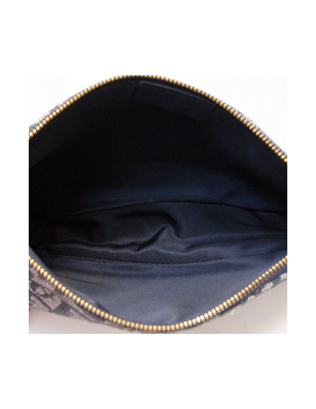 The Cove is Navy Blue, removable leather. It can be worn on the shoulder, hand and wrist.The closure is zipped. The Interior is marine blue satin with a small white spot. It is in good condition with a slight staining on the back.