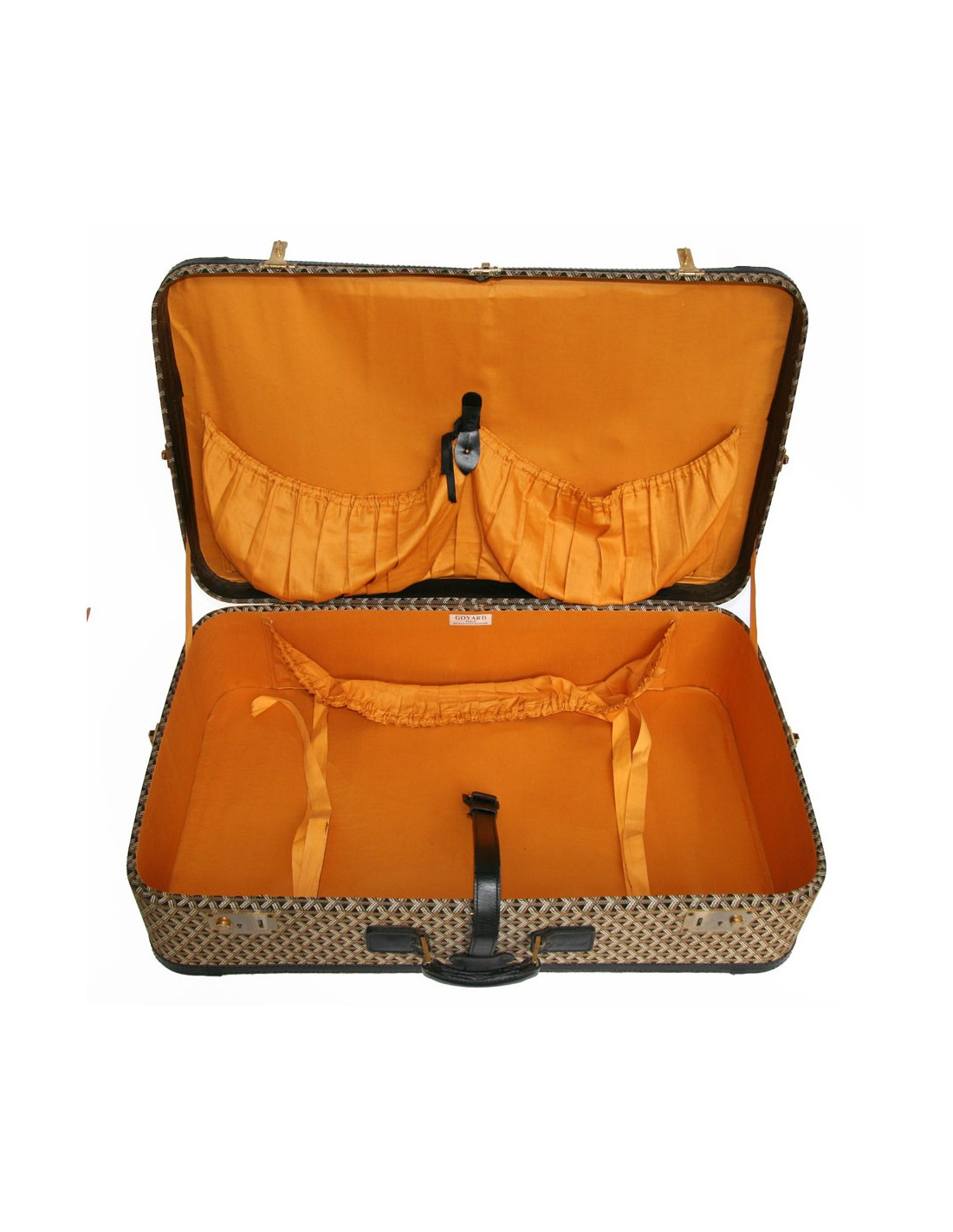 Ultra vintage! Suitcase Goyard woven fabric with black, beige and ochre, Monogram with angles and edges in smooth black leather strap in the same material. Inside: lining fabric in yellow of the mark. The wrist is in very good condition and is reinforced. There are very discrete initials (CWM). A recovery was made very properly at the back of the bag.