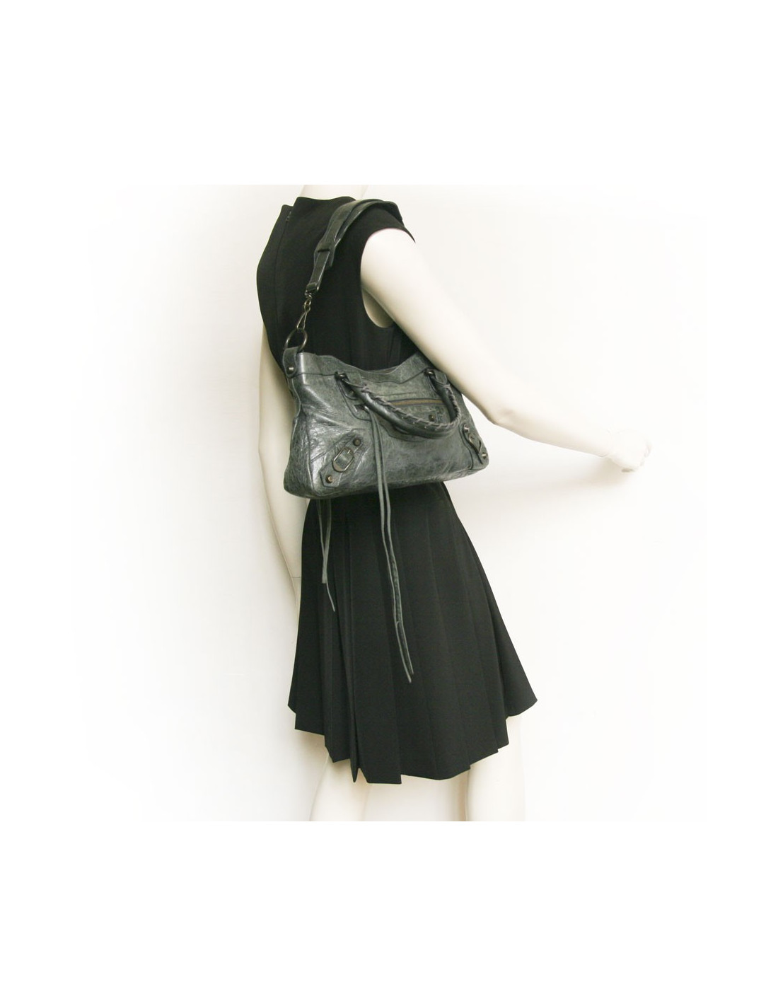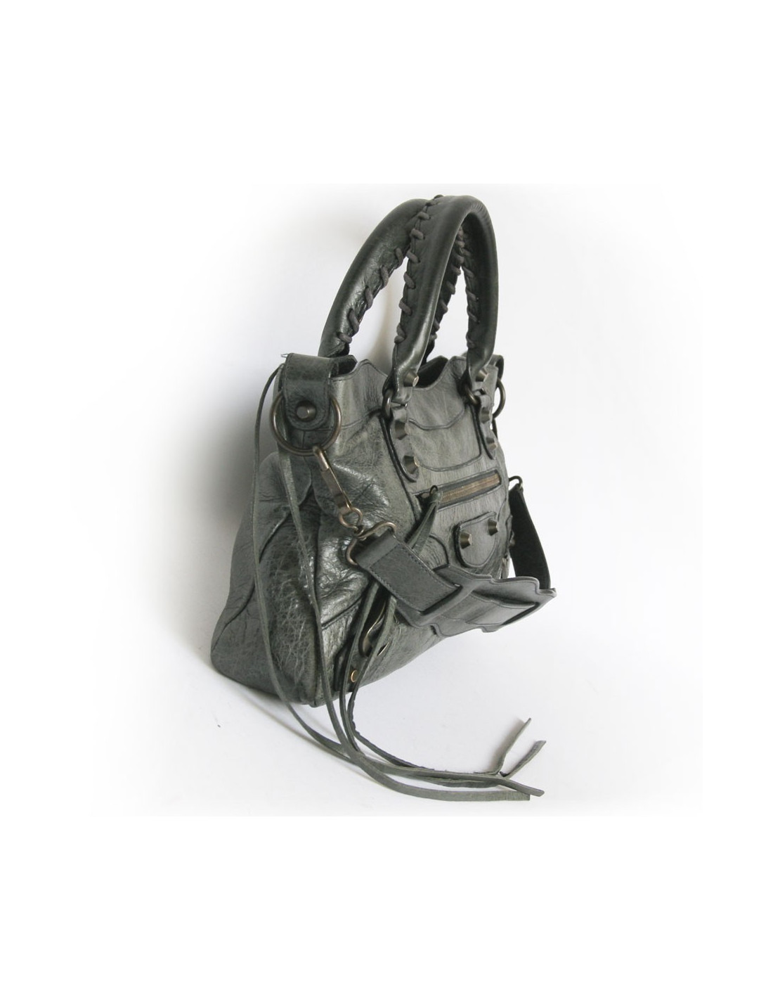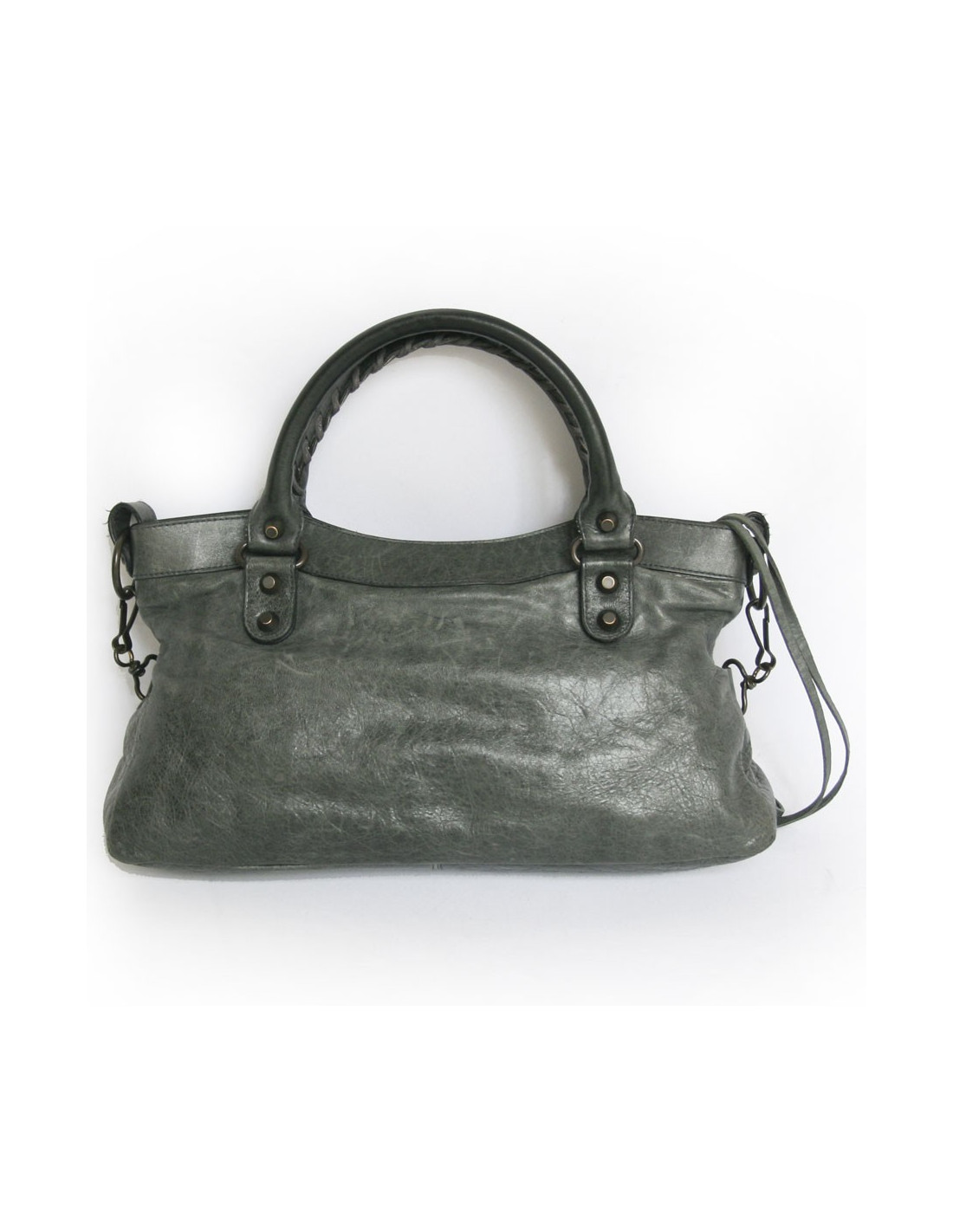 Bag Classic Balenciaga first green soft lambskin leather. Hand stitched handles. Zipper closure. Antique brass finishes. Strips of leather on the zips. Zipped pocket on the front. The Interior is black cloth with a zipped with engraved metal plate Balenciaga.
