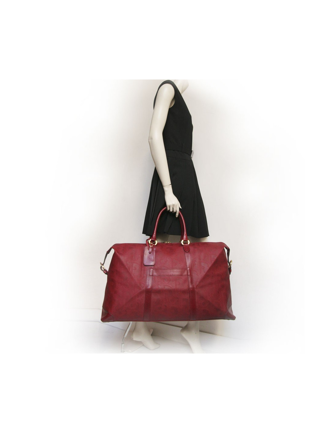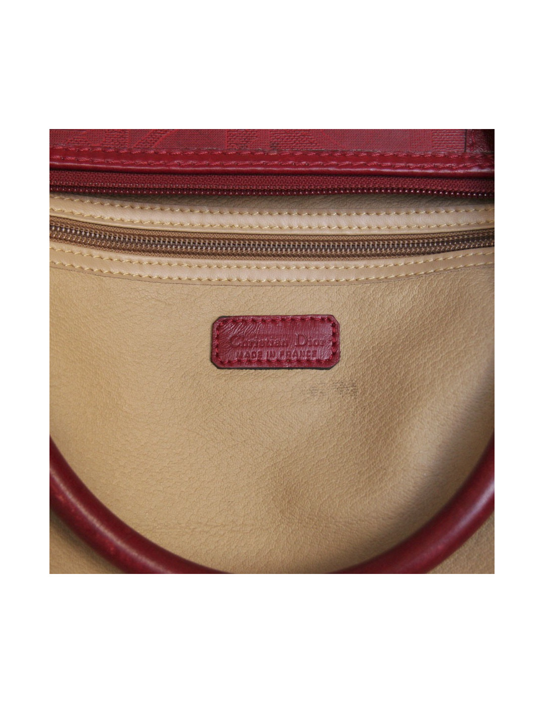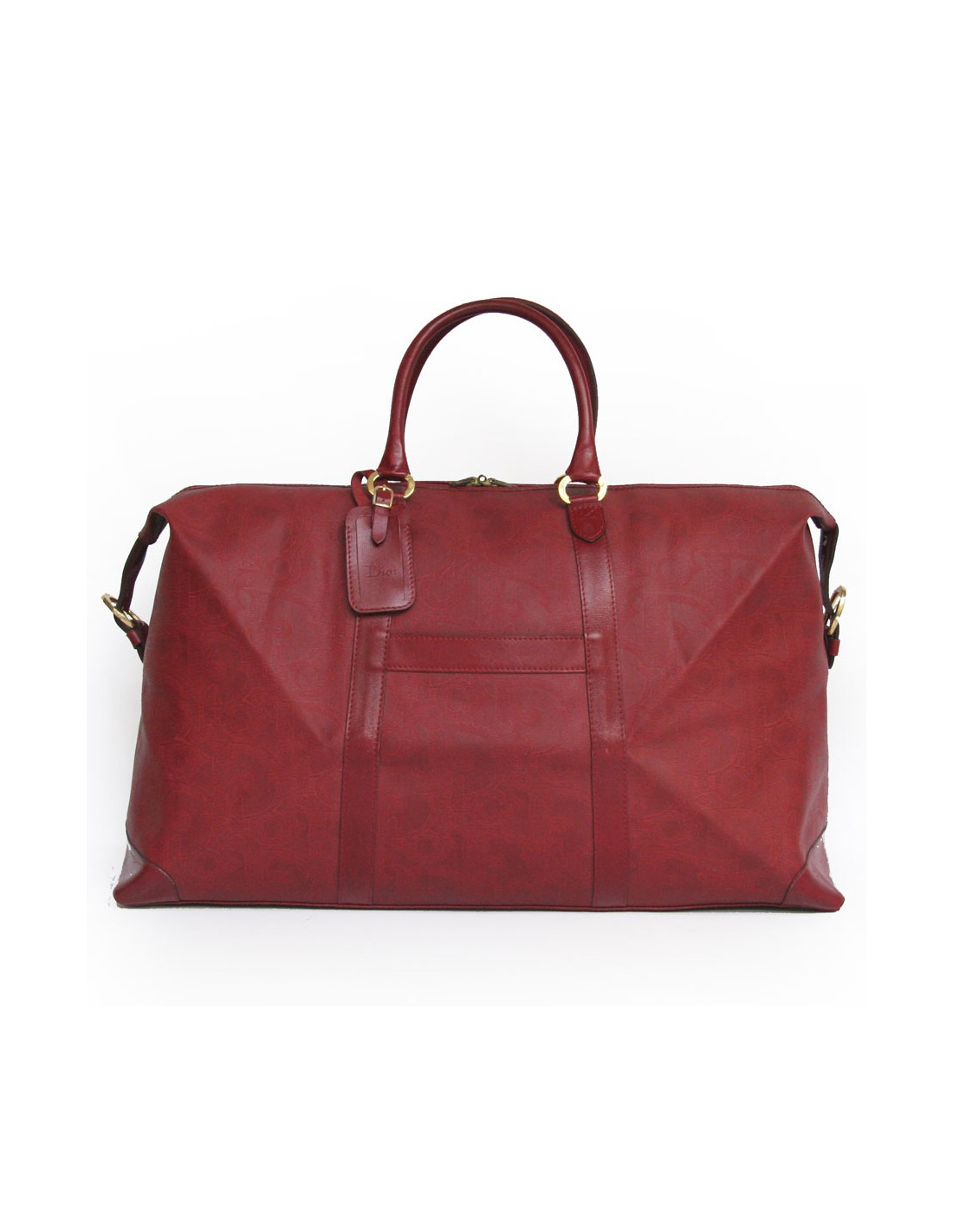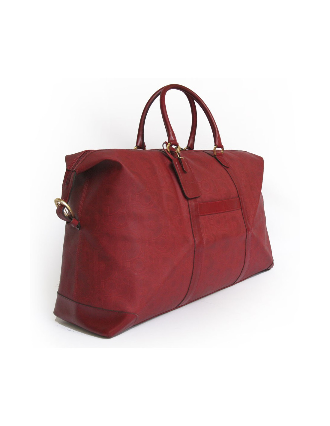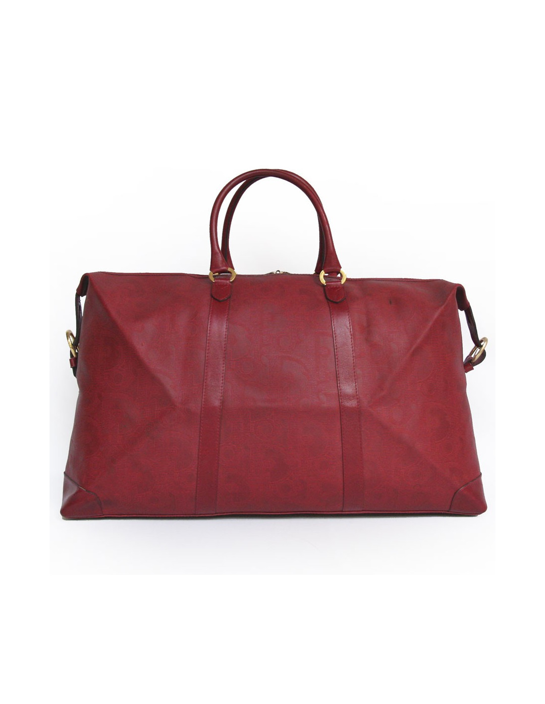 Très pratique !! Sac de voyage de la Maison Christian Dior en toile embossée rouge monogrammé. L'accastillage est en métal doré. Fermeture zippée. L'intérieur est en cuir beige avec une grande poche zippée. Double anses en cuir. En bon état. (une petite tache noire à l'avant ainsi que la patine du cuir sur les anses.)