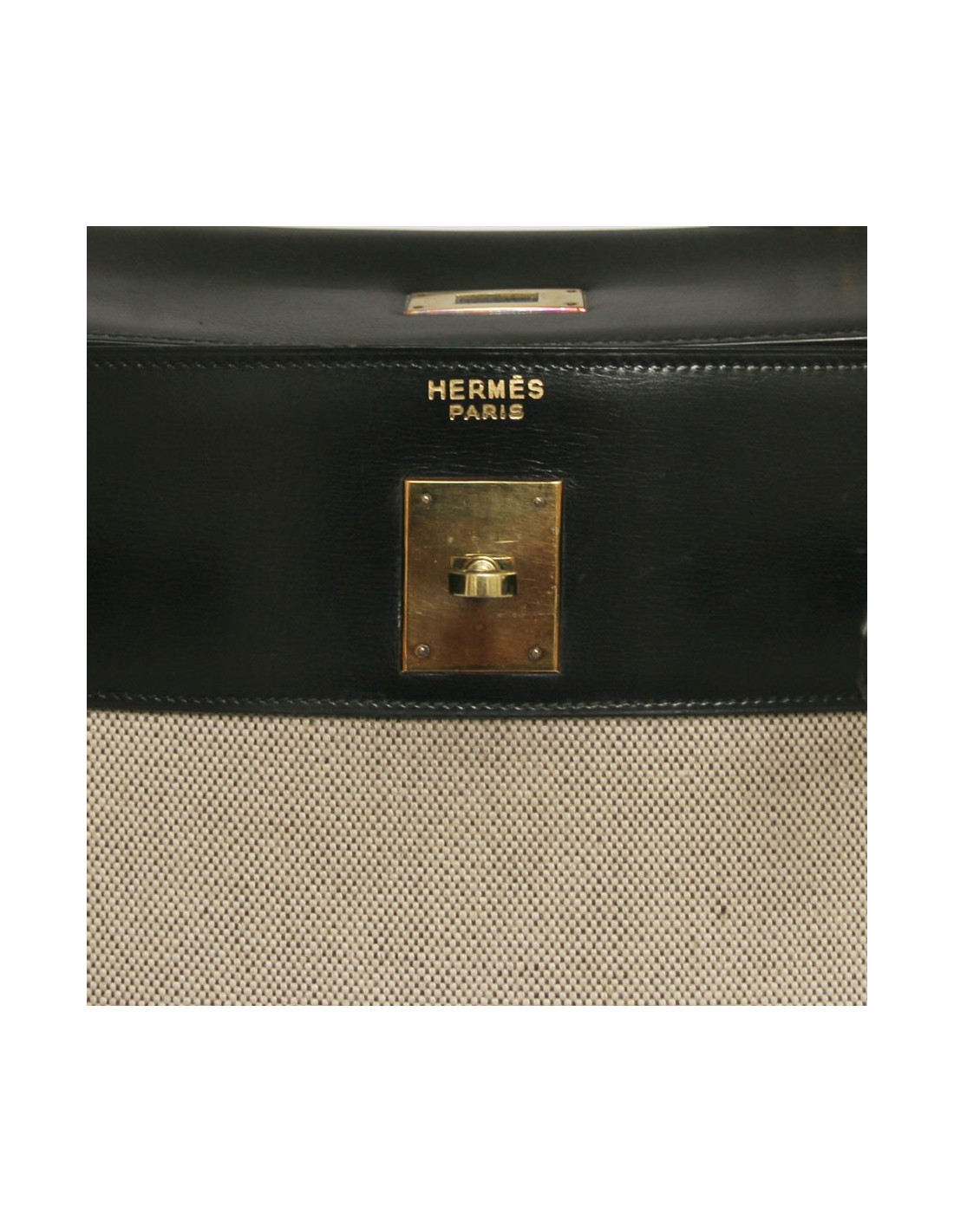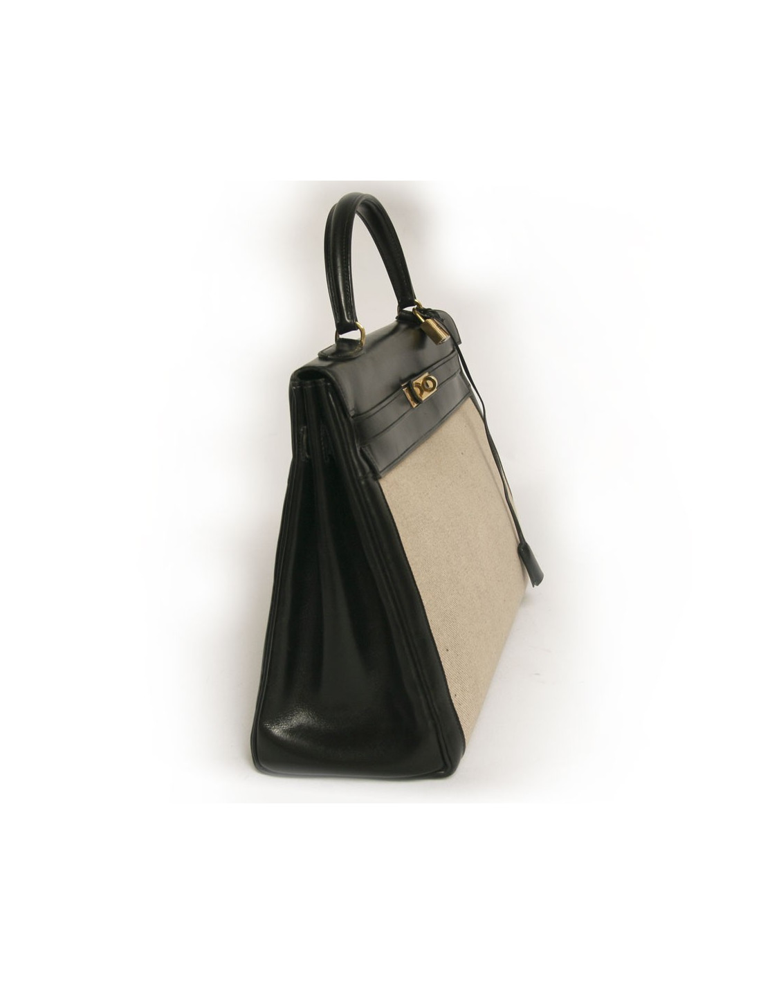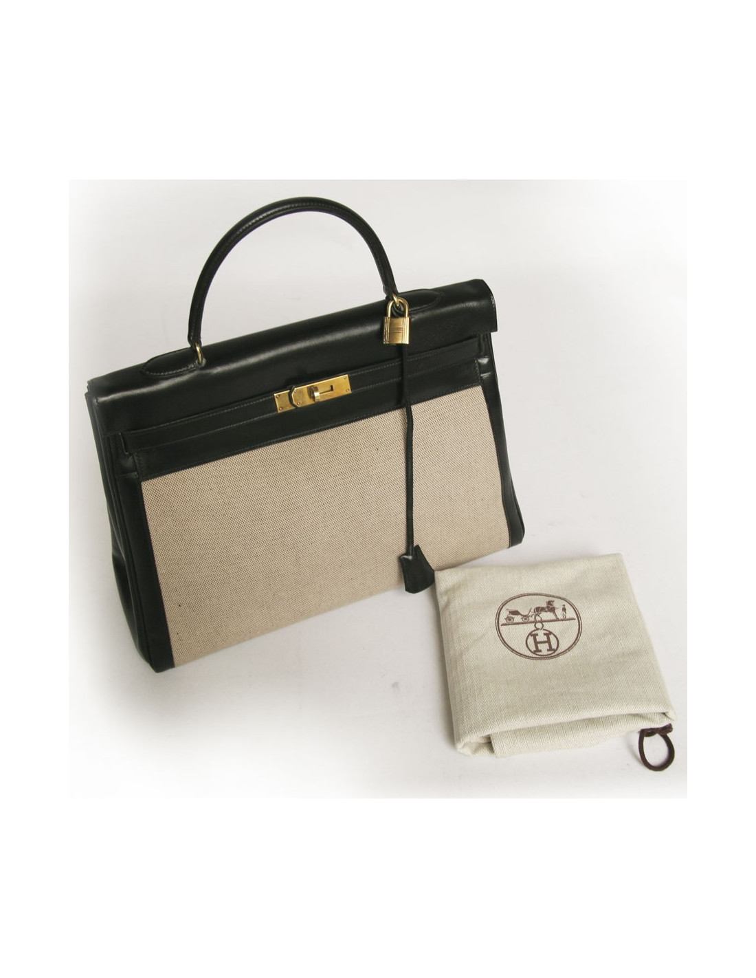 The unbeatable bag Kelly 35 of Hermès in black leather and canvas. Fittings is made of gilded brass. Padlock, Tinker Bell, and two keys. Inside, there are 3 large pockets of which one zipped. In very good condition. Small patina of leather on the handle and on the tongue that helps close the bag and small very light yellow stains on the canvas at the back of the bag.
