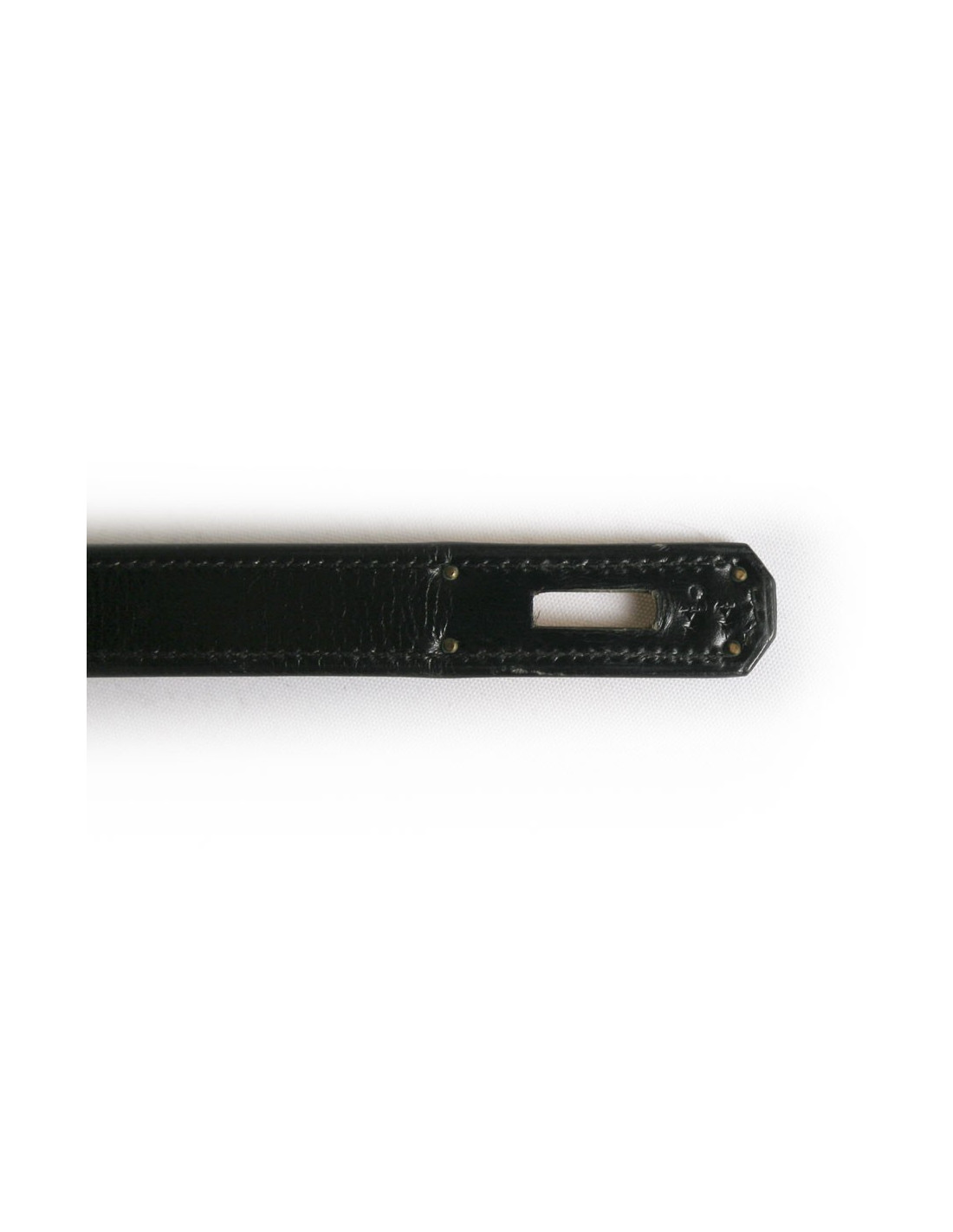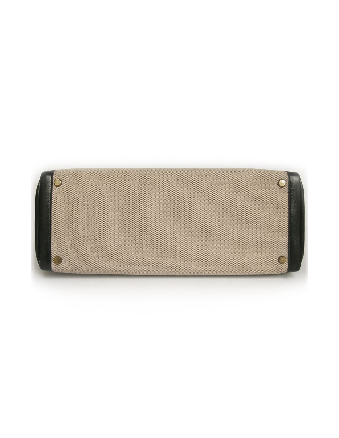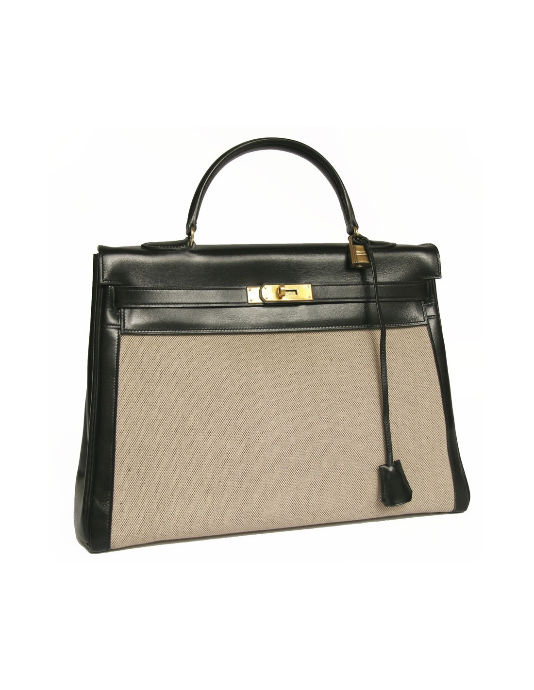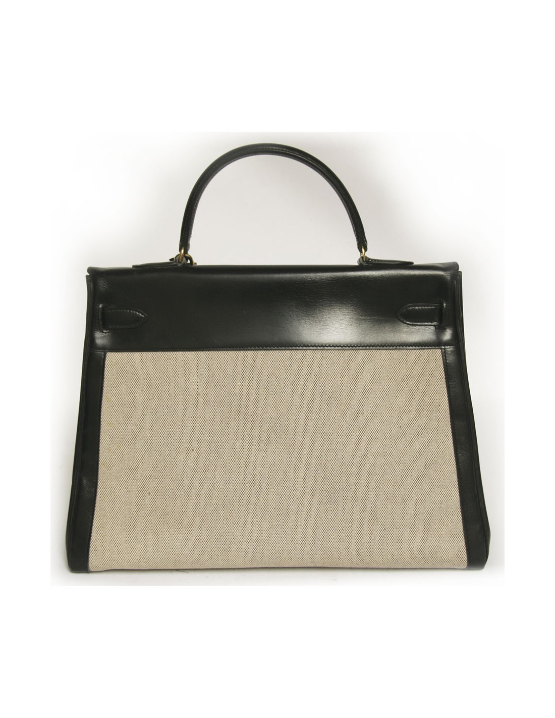 The unbeatable bag Kelly 35 of Hermès in black leather and canvas. Fittings is made of gilded brass. Padlock, Tinker Bell, and two keys. Inside, there are 3 large pockets of which one zipped. In very good condition. Small patina of leather on the handle and on the tongue that helps close the bag and small very light yellow stains on the canvas at the back of the bag.
