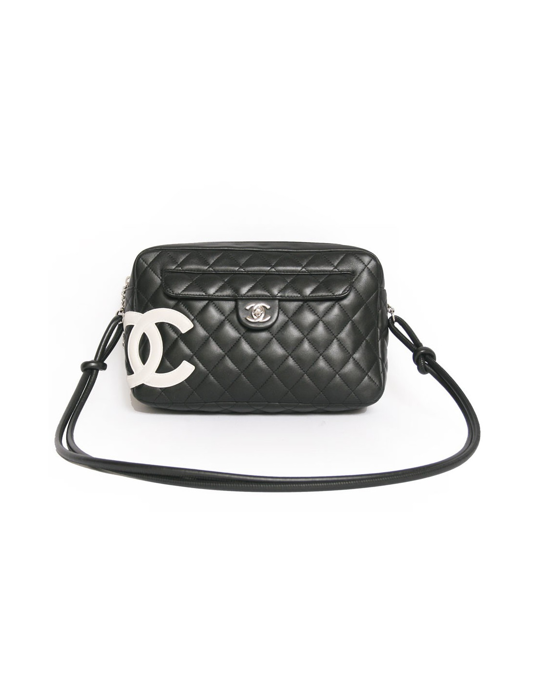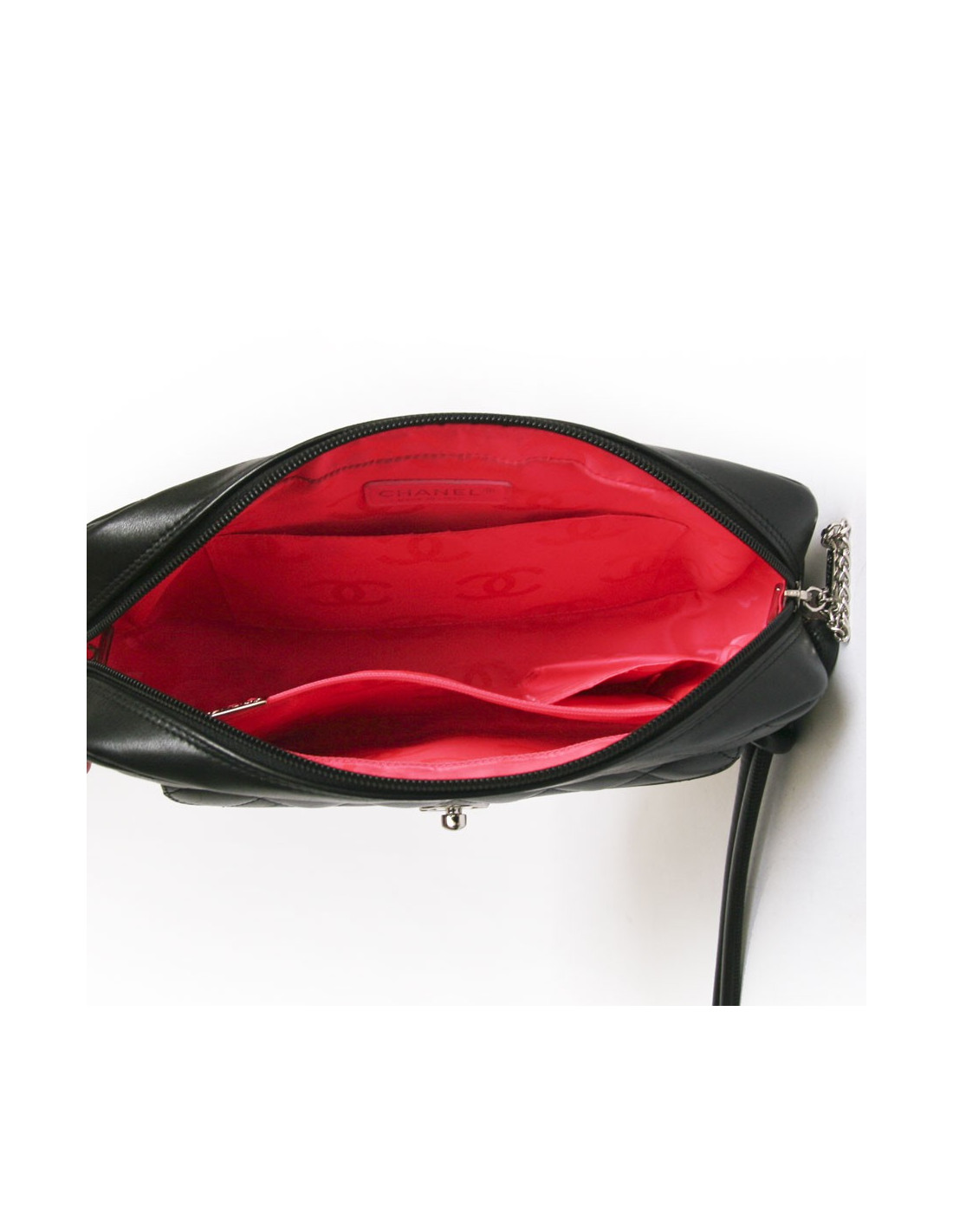 Gorgeous bag Cambon for the House of Chanel quilted leather black. He wears in two ways in the shoulder and shoulder. The Interior is cloth pink Monogram with 4 pockets: 1 zipped, 1 for pens, 1 for smartphone and 1 large flat pocket. Zipper closure. The hardware is in silver metal. There is also a flat pocket on the front with a CC clasp and one at the rear. H - authenticity cardologram: 9891... In very good condition.