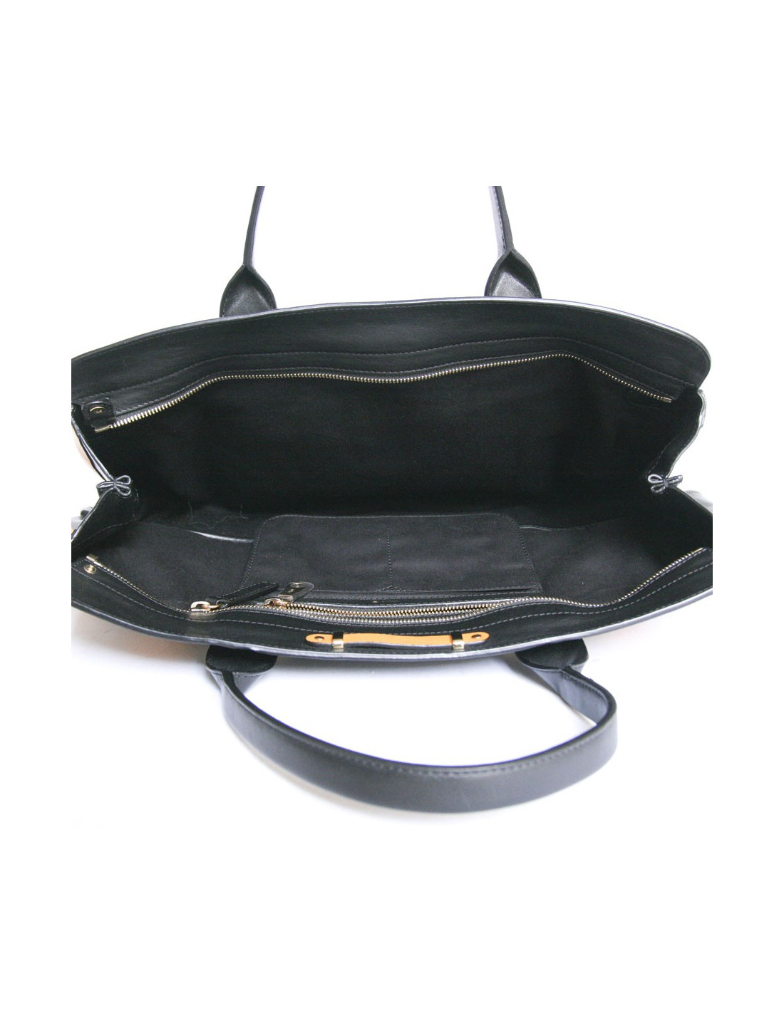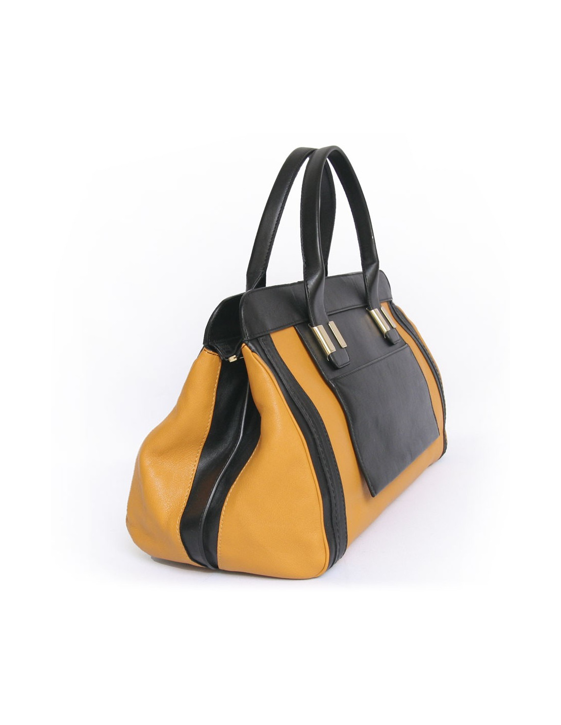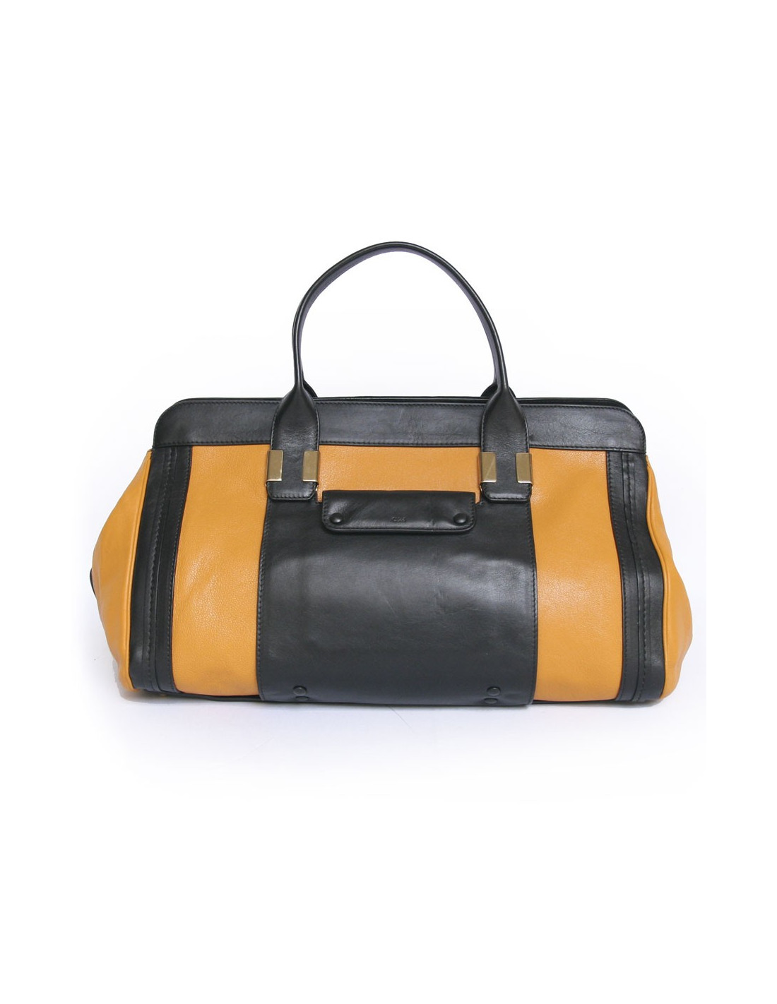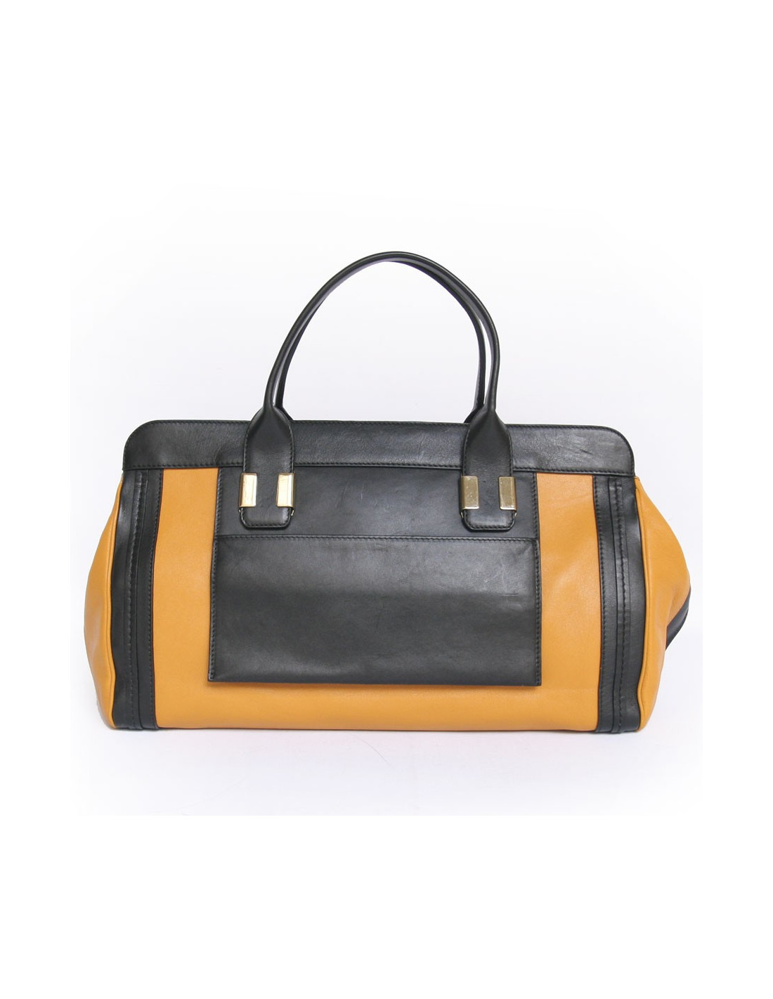 Two-tone Chloe black and mustard-yellow leather bag. Ideal for everyday as it is very convenient to use and it has a large storage space. Double handles for carry in the hand or arm. The hardware is gold metal. The Interior is black cloth with 3 pockets including 1 zipped. There's also a pocket on the front and one at the rear. In very good condition.