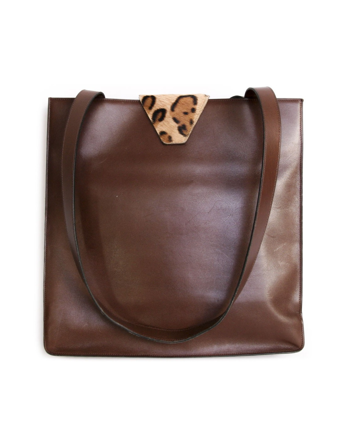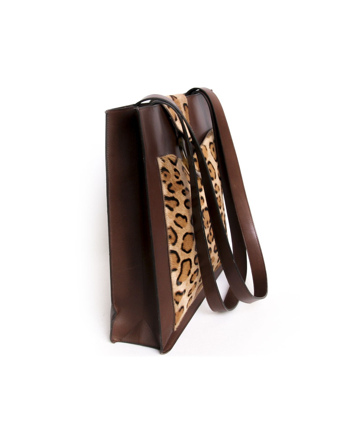 Vintage Christian Dior bag in brown box leather and leopard pattern skin. Full leather interior with zippered pocket and 'Christian Dior' gilded metal plate.