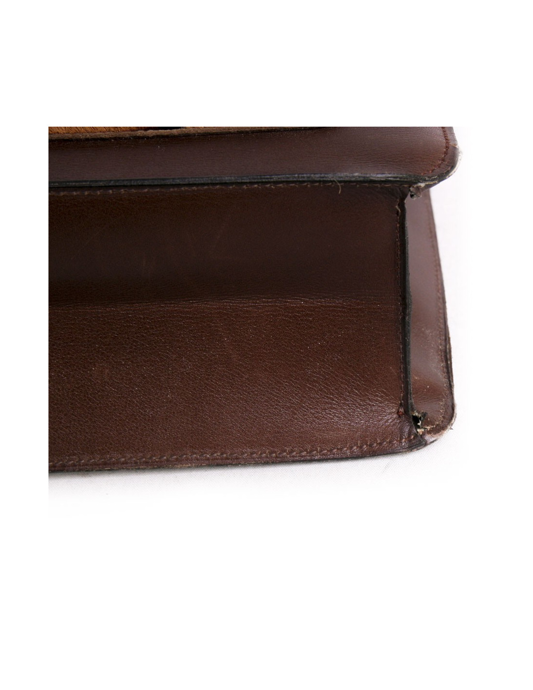 The bag closes with a gold-plated pressure surmounted by a piece of leather and a transparent plastic ring. Beautiful patina in the back.