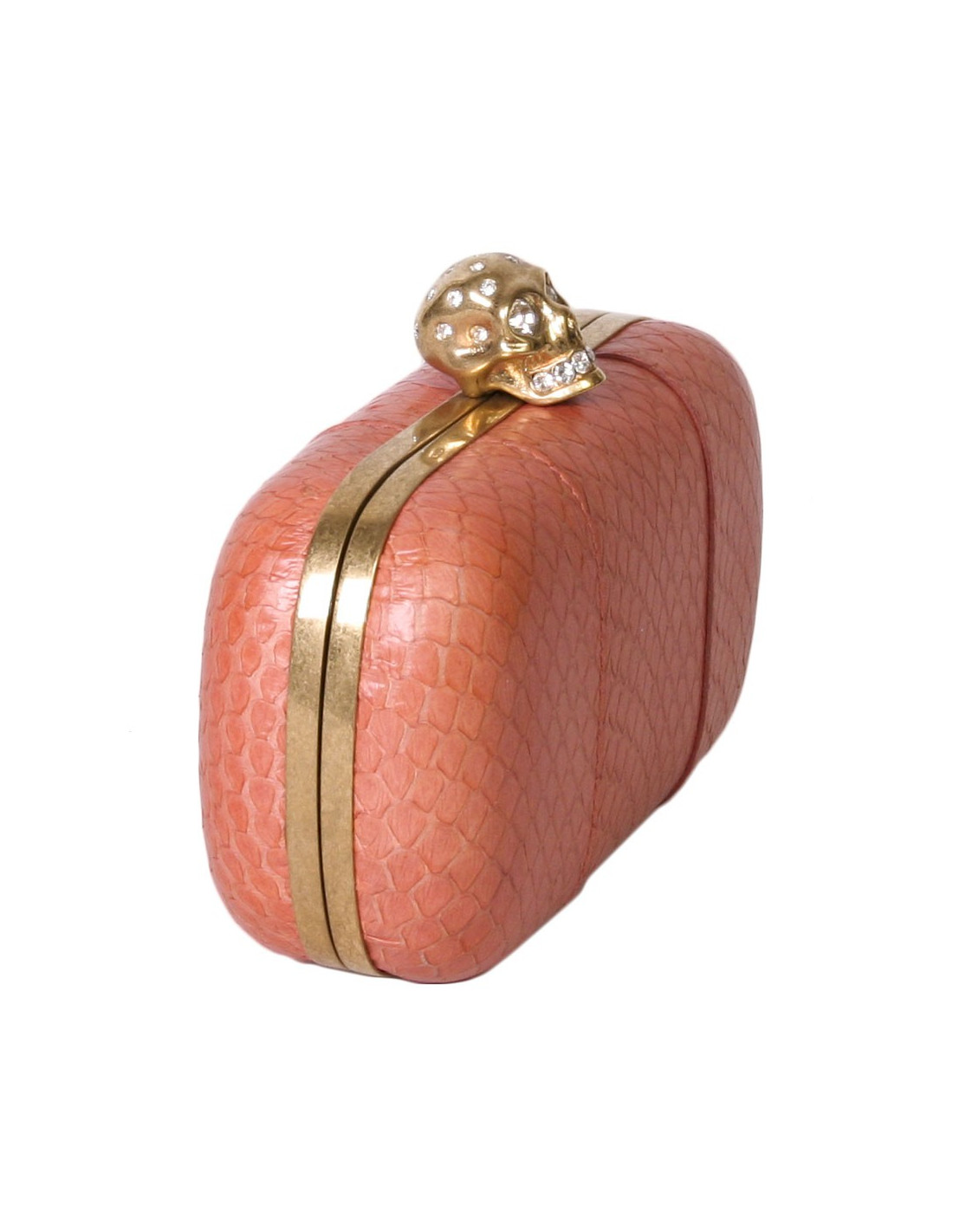 Clutch skull of the House Alexander Mc Queen in coral color python. Clasp to detail in swarovsky crystal skull. Nappa leather lining. Door hand. Collection spring/summer 2012. Number of serious inside authentication: 2362... In excellent condition.