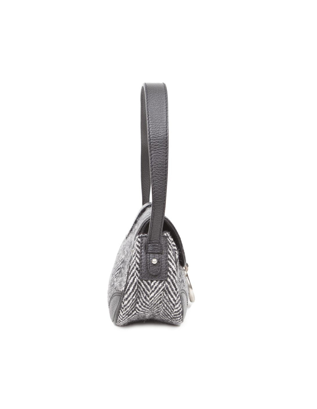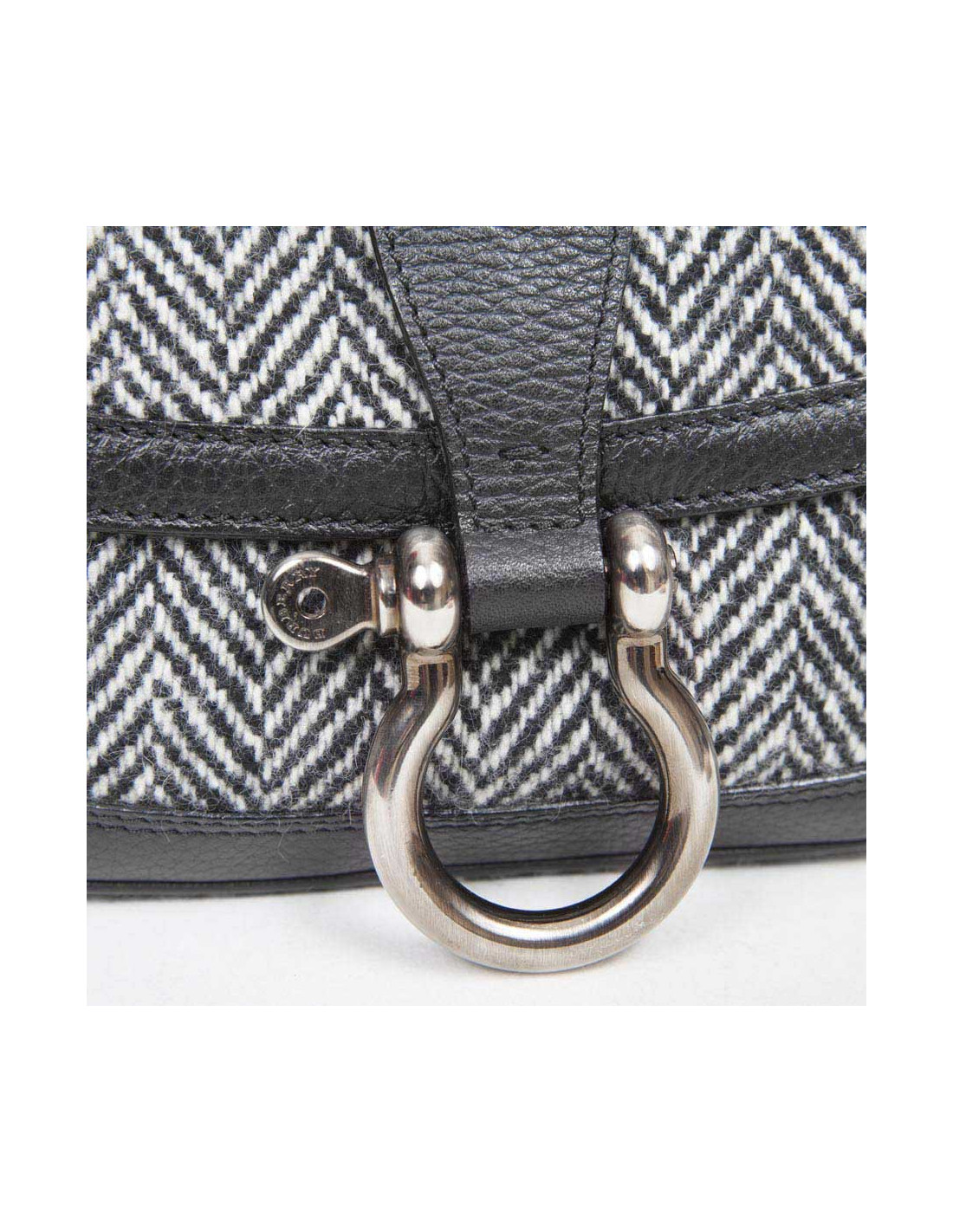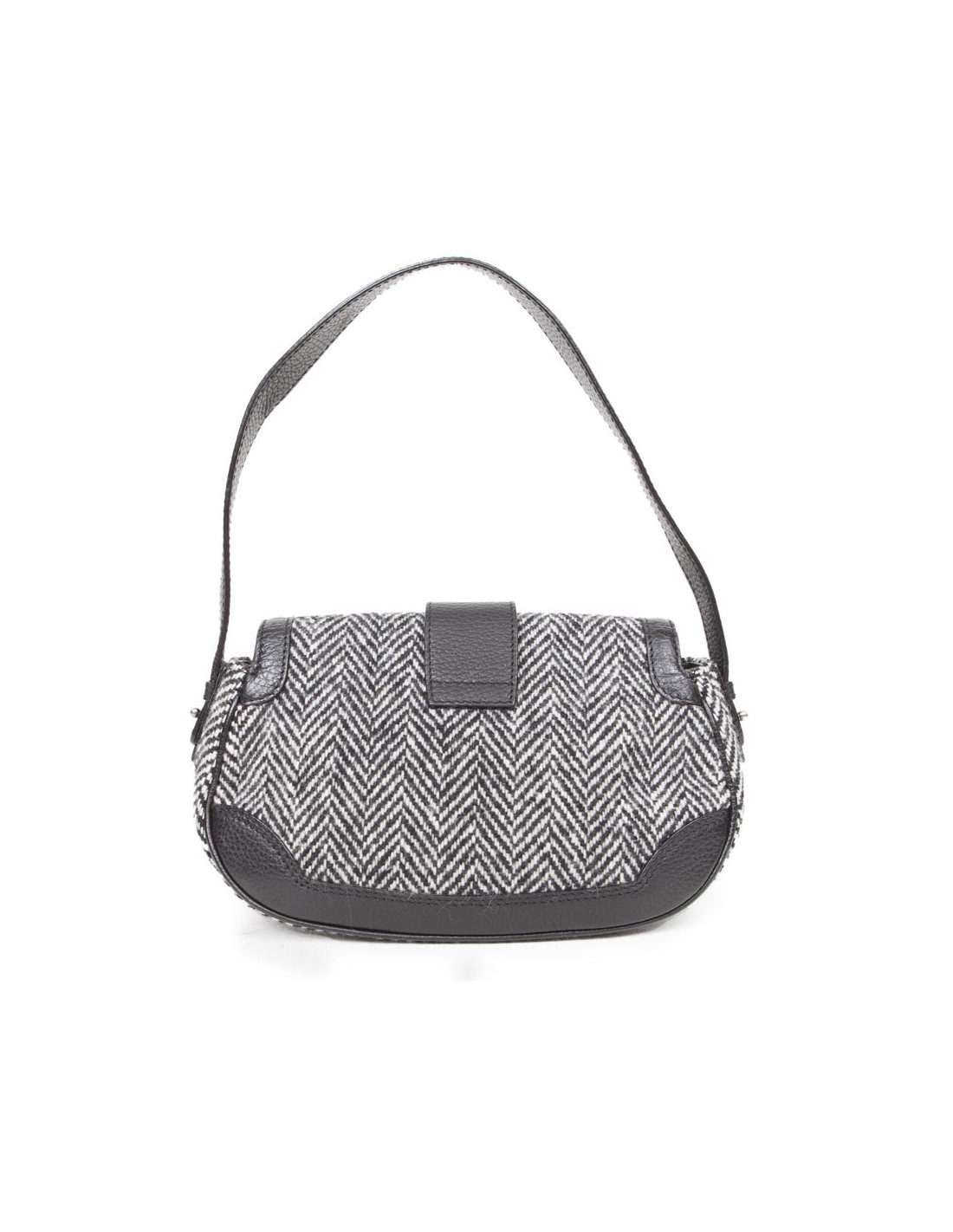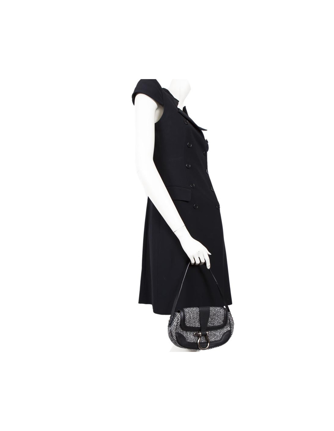 Burberry canvas chevron black and gray and black grained leather bag. The jewelry is silver color brass. Snap button closure. The Interior is black cloth with a zipped pocket, the zipper of the ends with a silver key. The bag is worn on the shoulder.