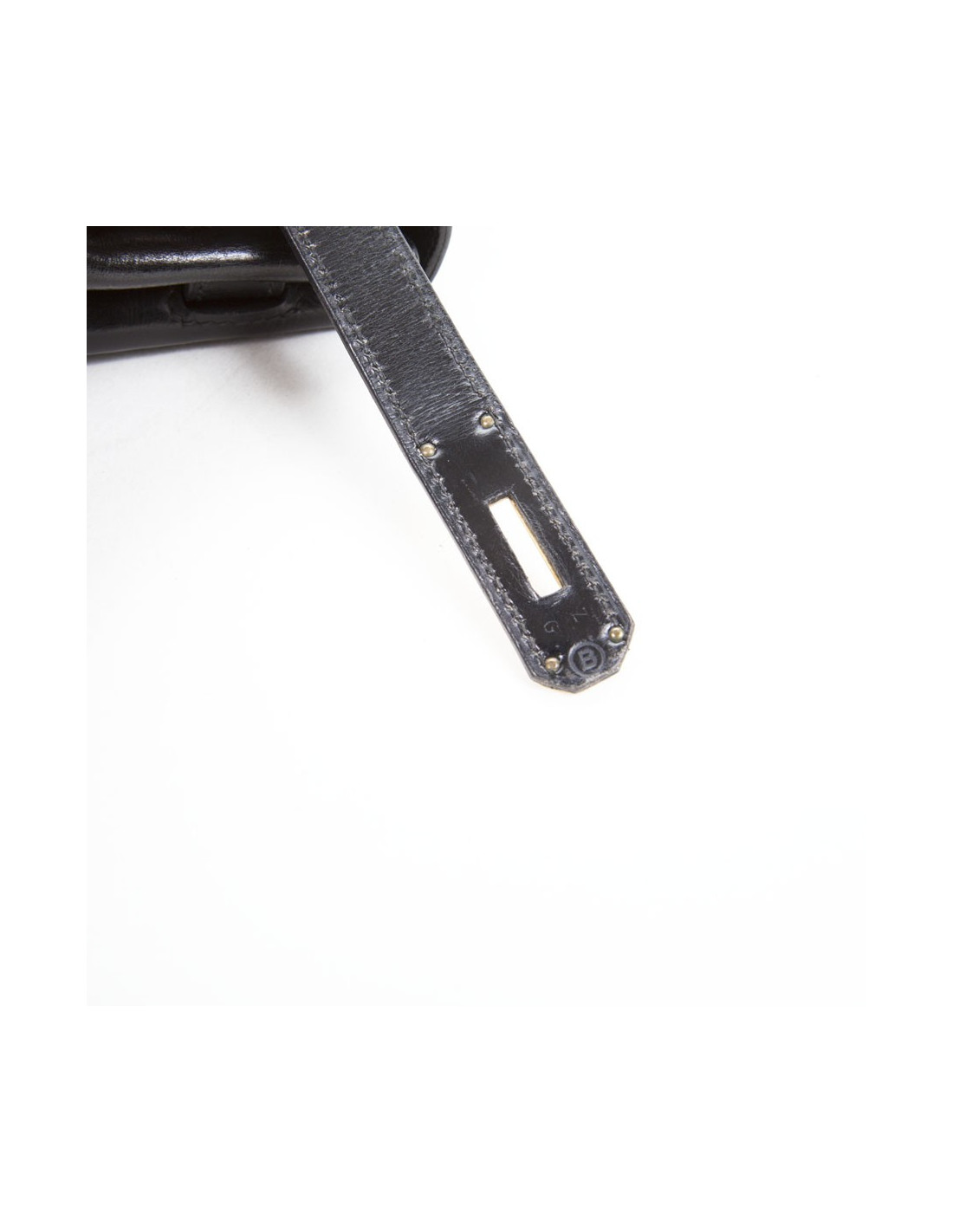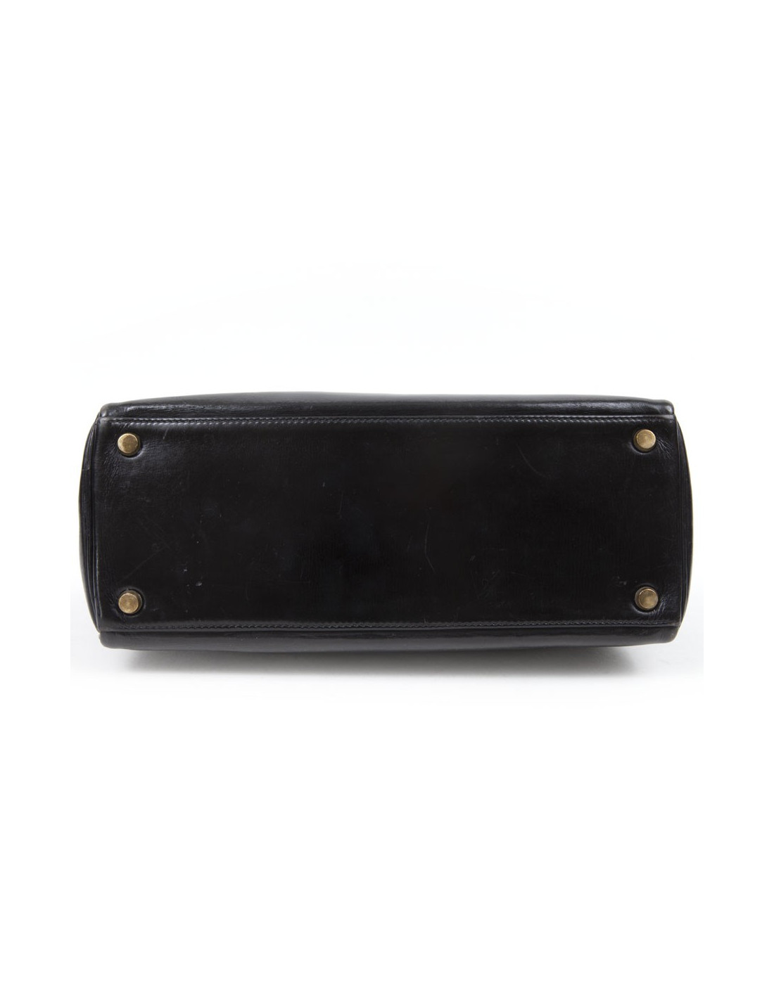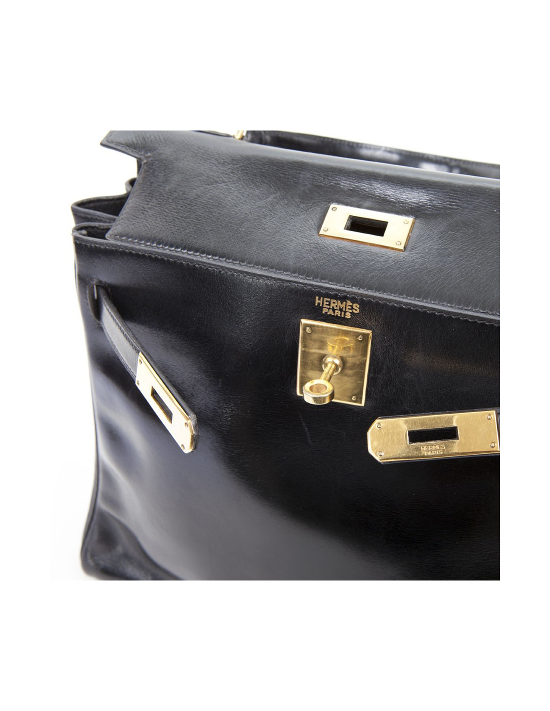 Rare! Bag 'Kelly 28' of Hermès leather black box. The jewelry is plated gold. The Interior is black leather with 3 plated pockets. Letter B in a round. State vintage. The corners are not damaged. The Cove, the zipper and Bell have been changed.