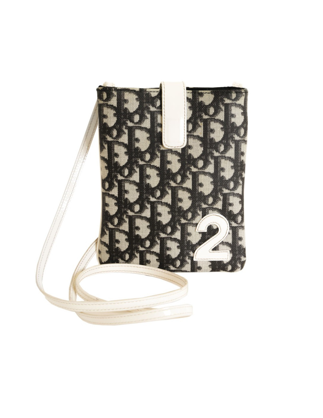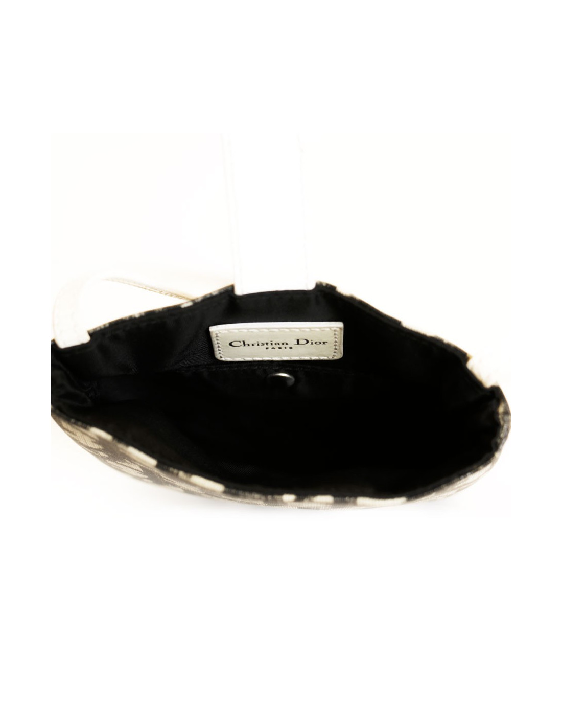 Dior monogram canvas pouch, vintage. serial number BM-0012. The lining is black fabric with an inner pocket. The Cove and the clasp (closes by one love) is white patent leather...