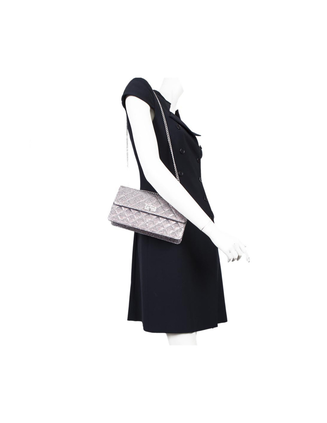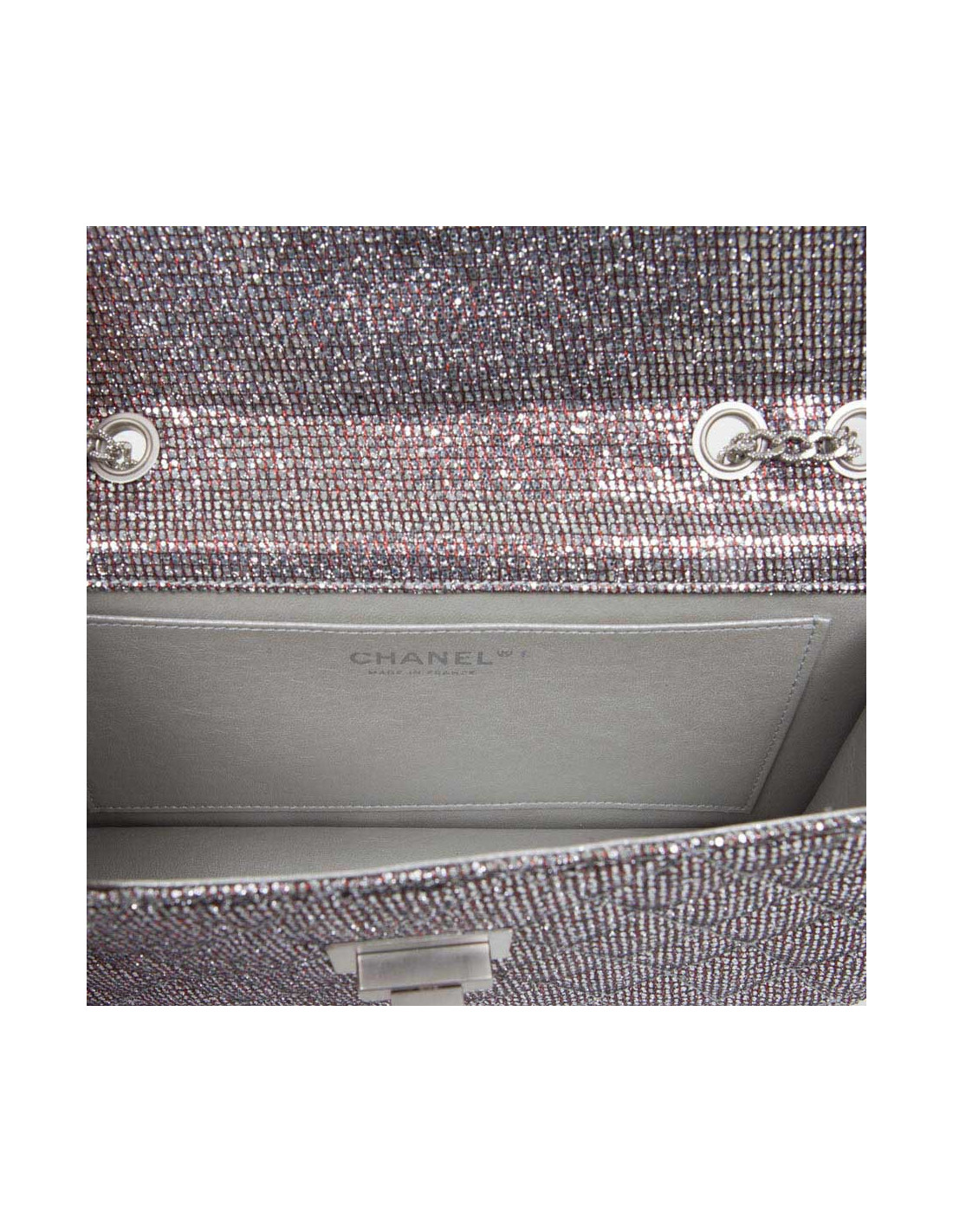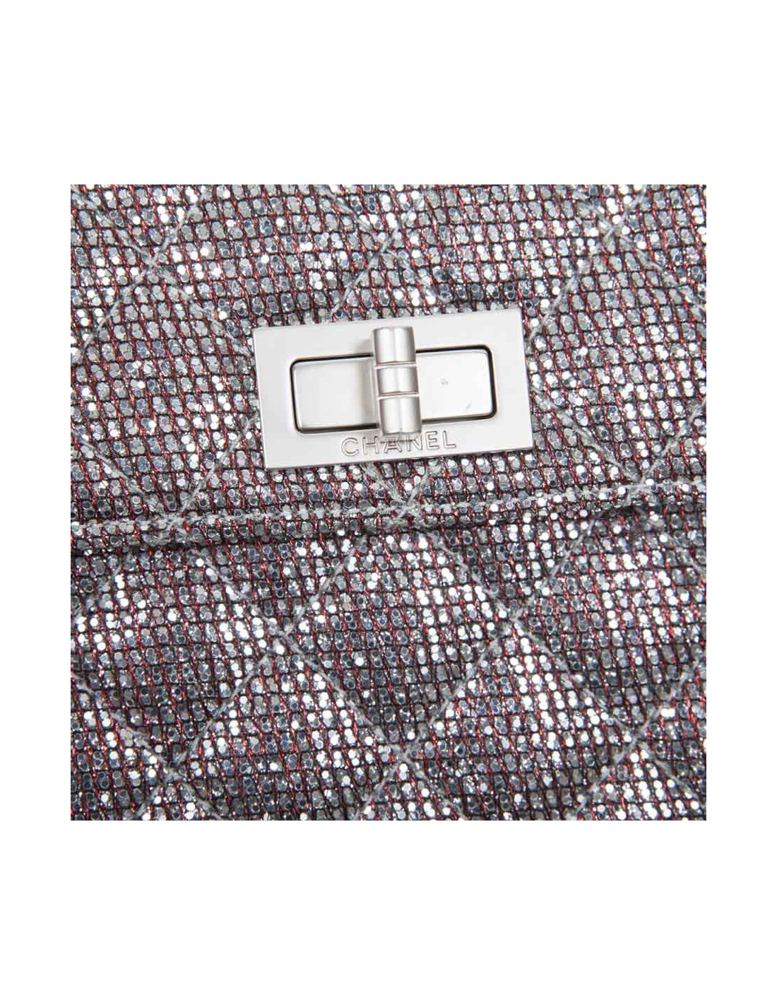 Lovely bag of the night of the House of Chanel, padded and glittery red and silver. The jewelry is silver. Clasp 2.55. The Interior is grey leather. Hologram: 1576... No authenticity card. Small spot at the bottom of the bag. In very good condition.