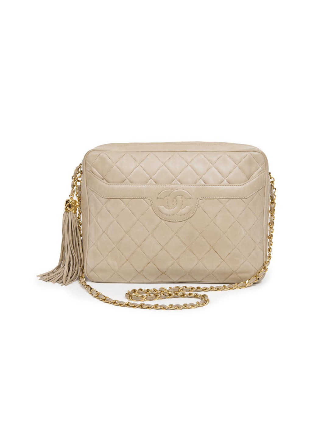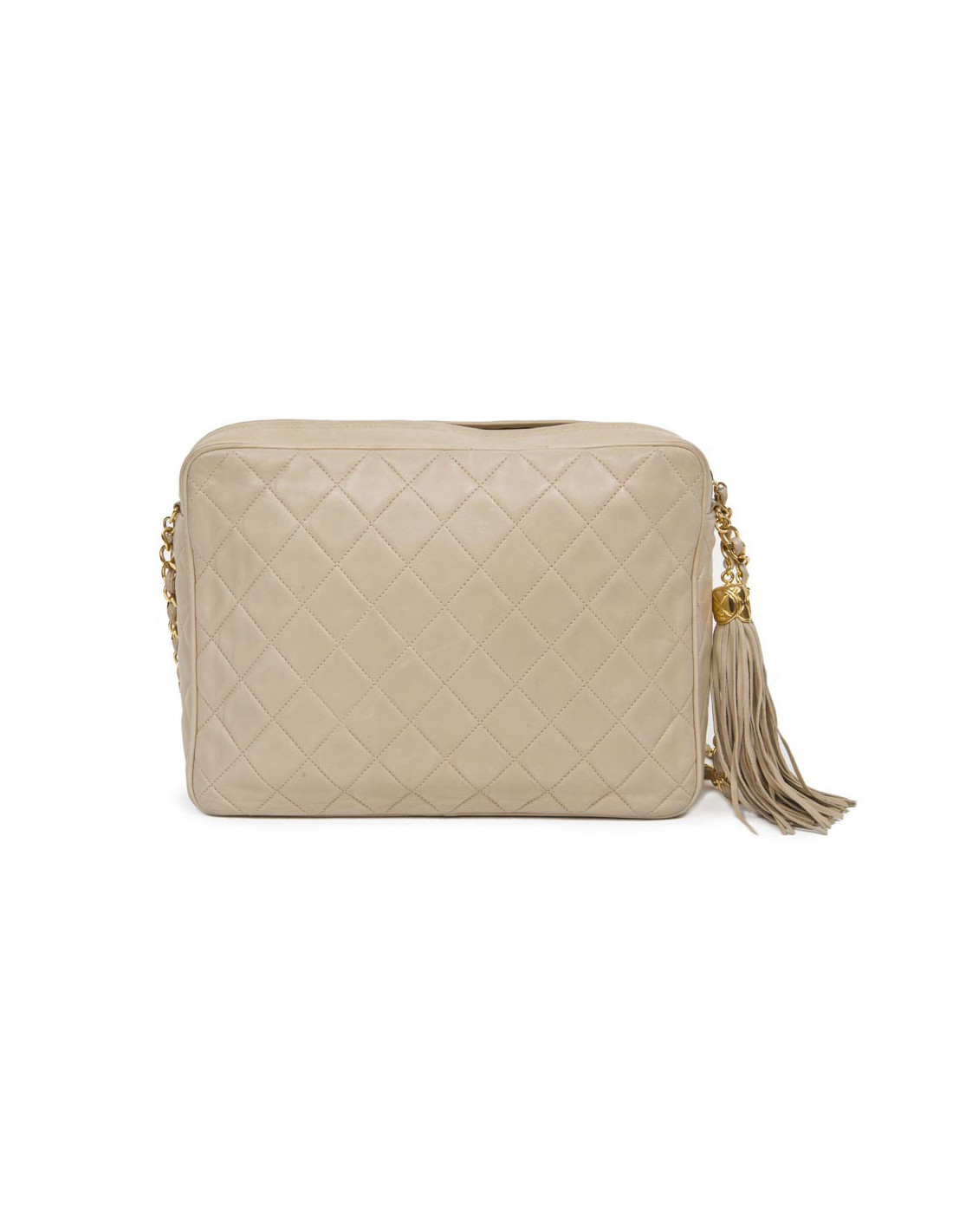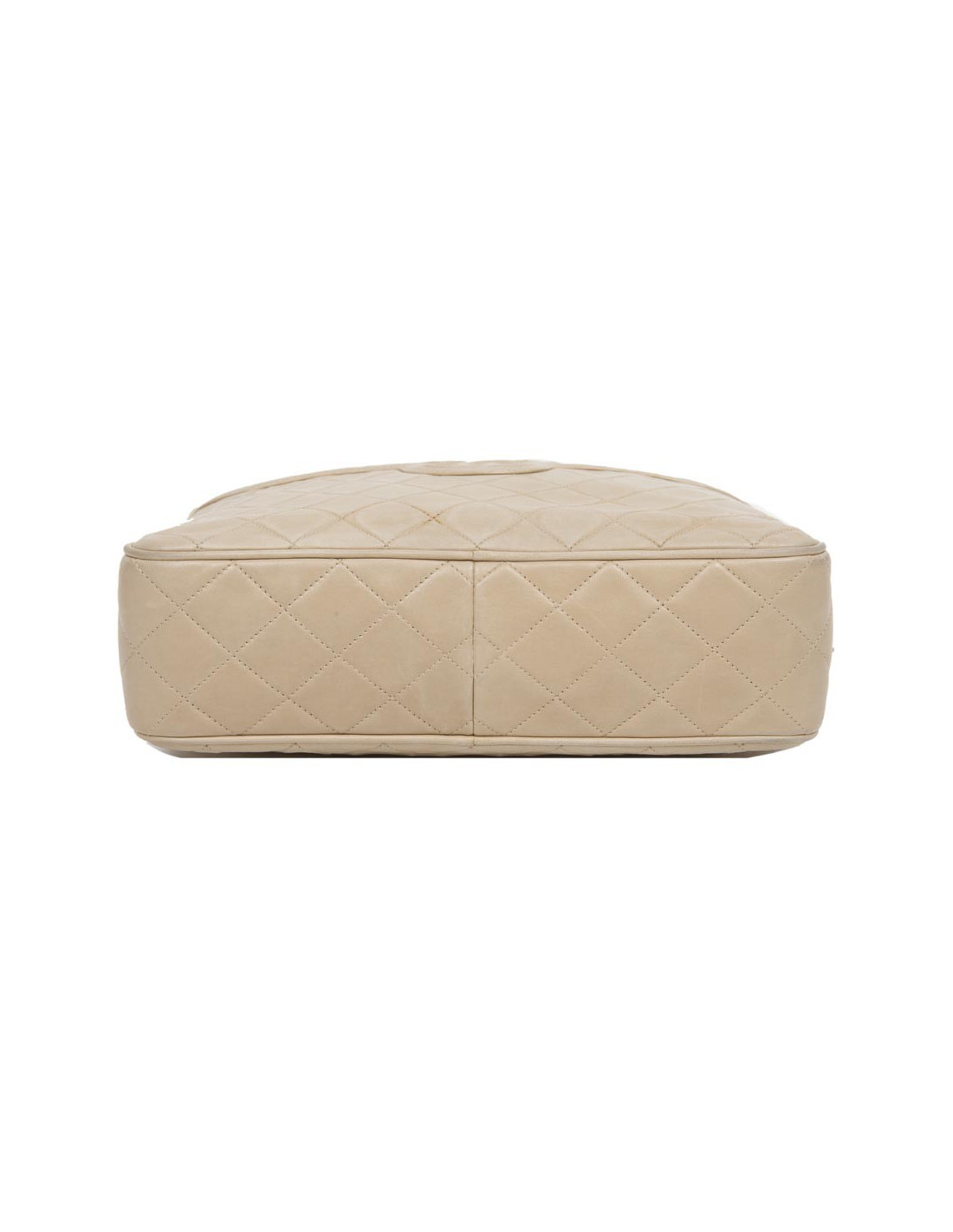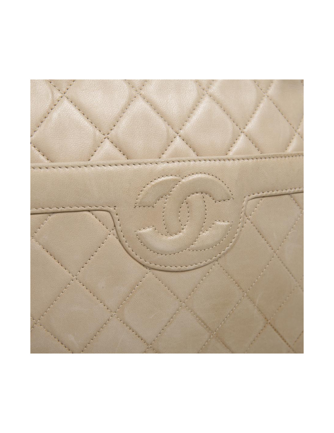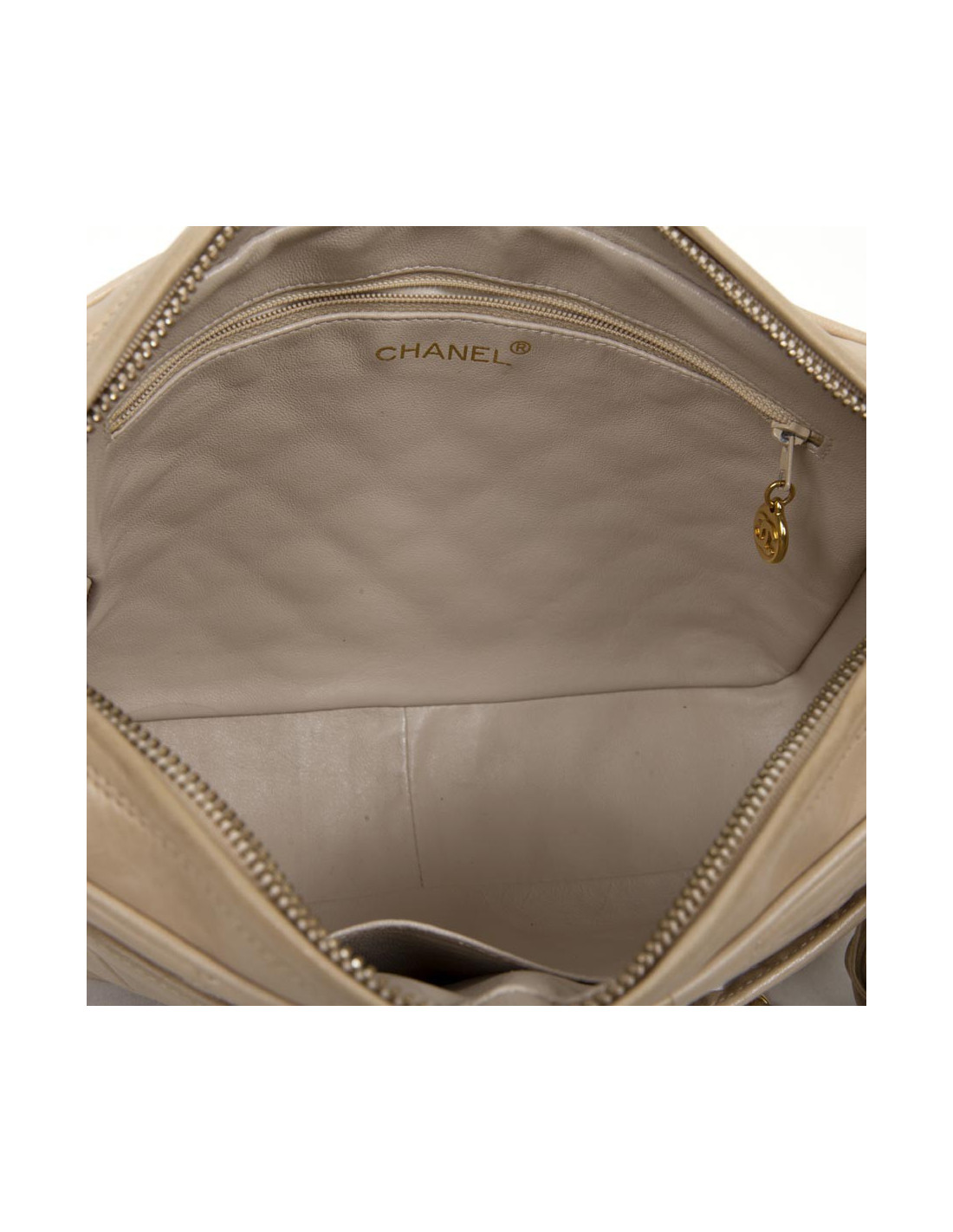 Vintage! The House of Chanel's beige quilted leather bag. Zipped. The jewelry is gold metal. The Interior is beige leather with 2 pockets including 1 zipped. Pocket in the front, snap closure. Presence of a hologram inside the bag, indicating that the date of the beginning of the 1990s.