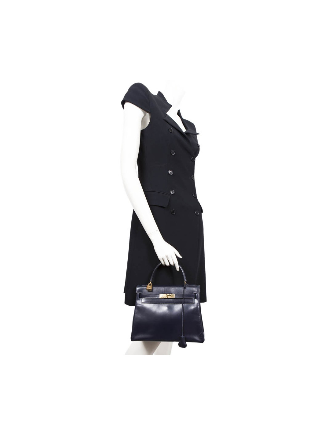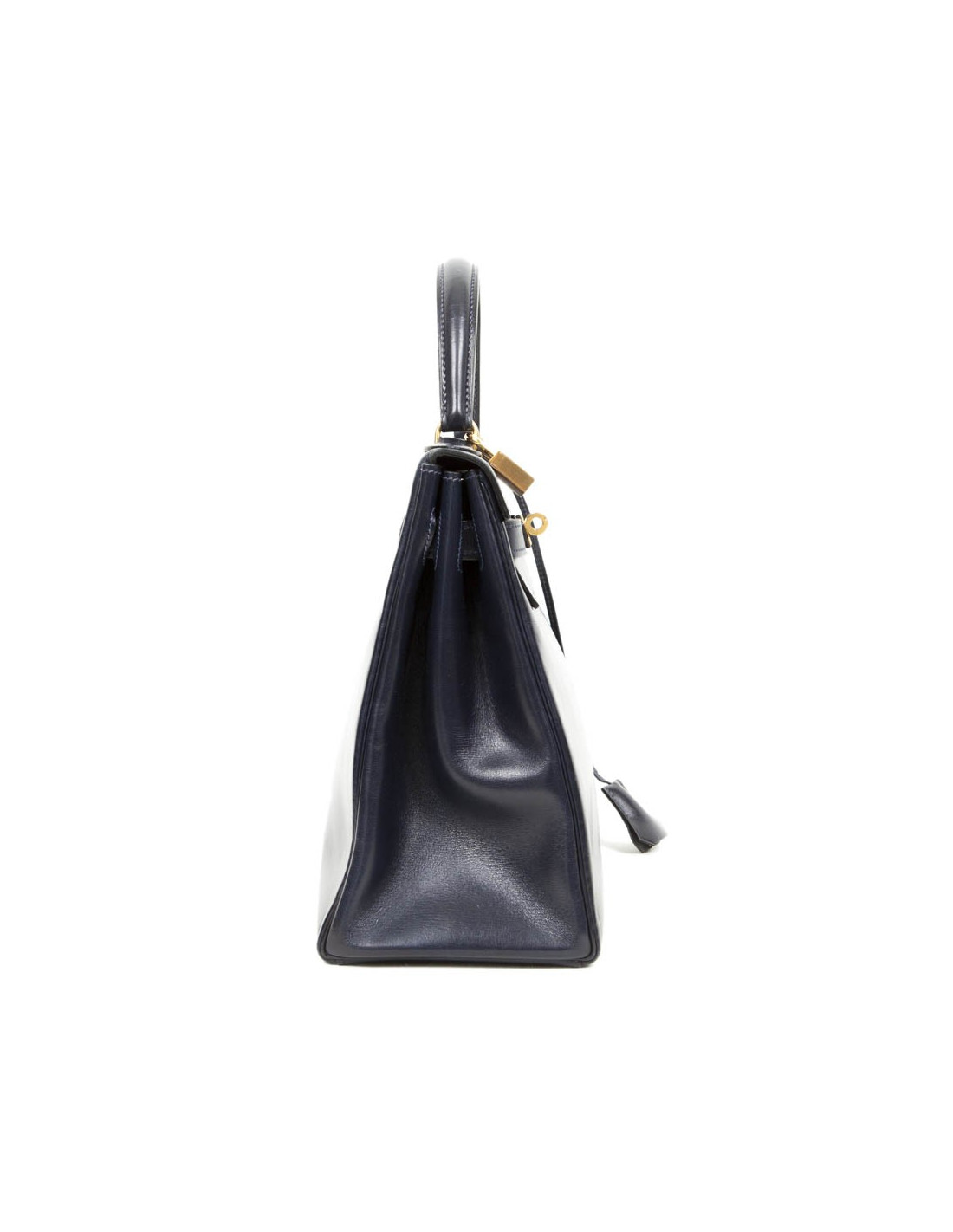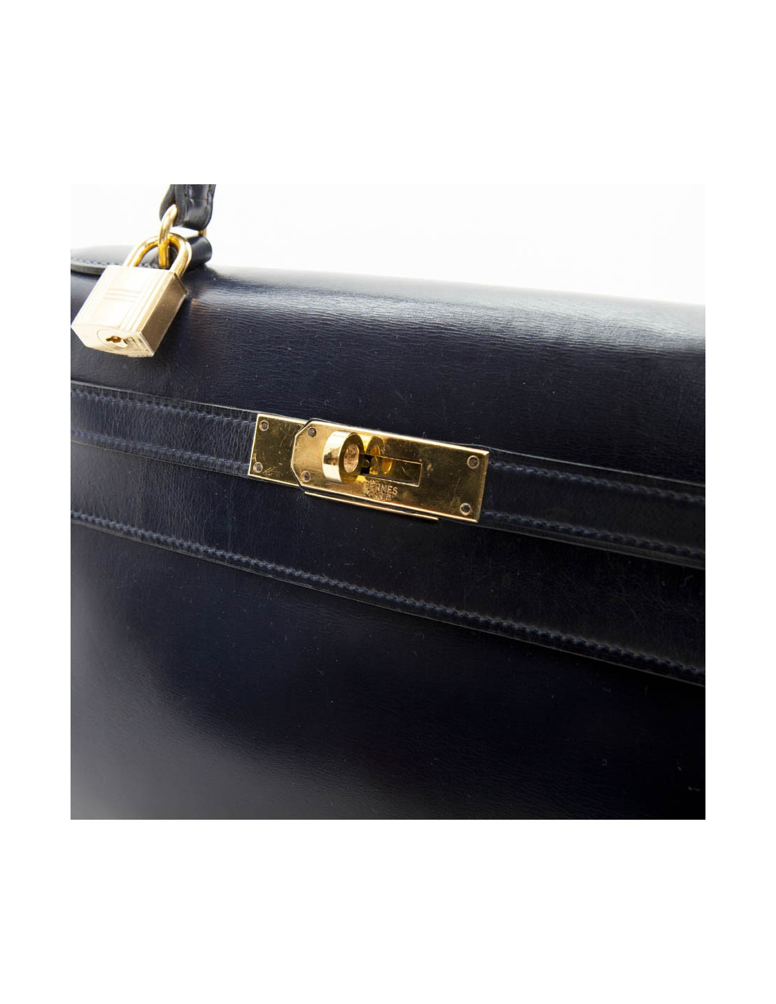 Exceptional! Kelly 28 of Hermès leather blue box at night. The jewelry is plated gold. Inside, 3 plated pockets and one zipped (very good condition). Letter A in a circle.