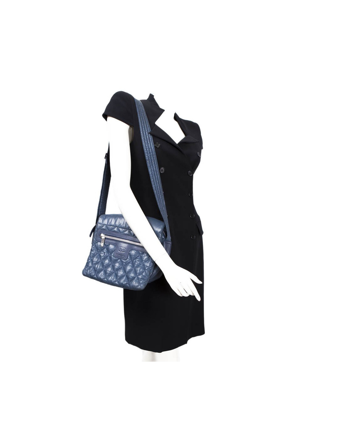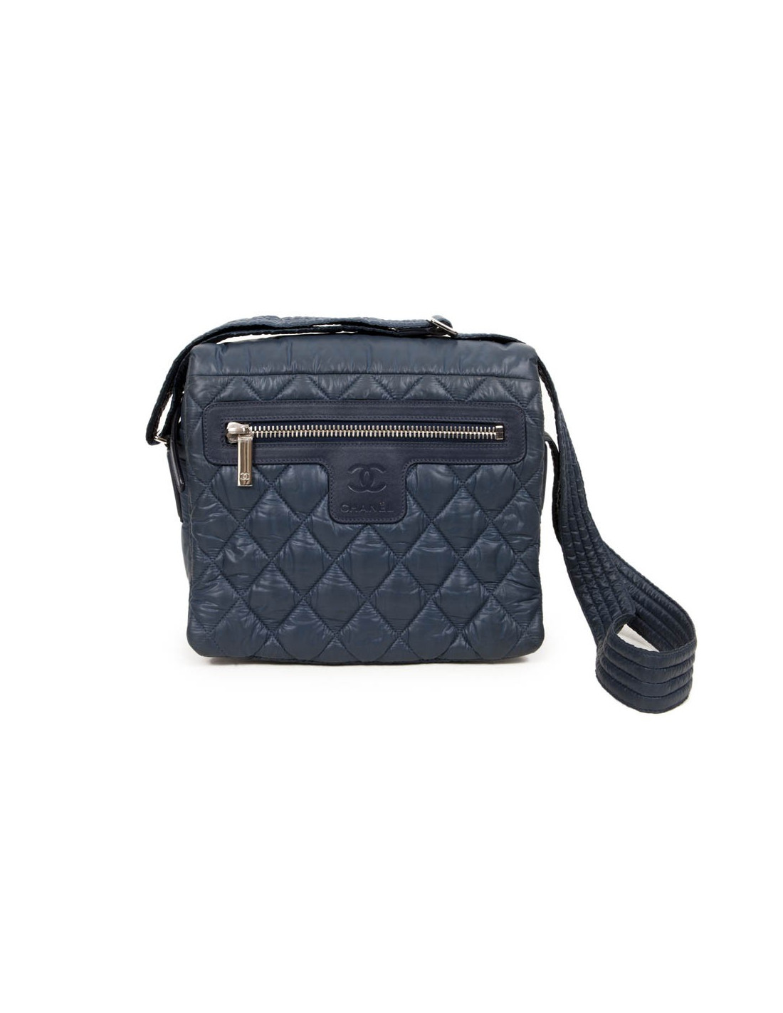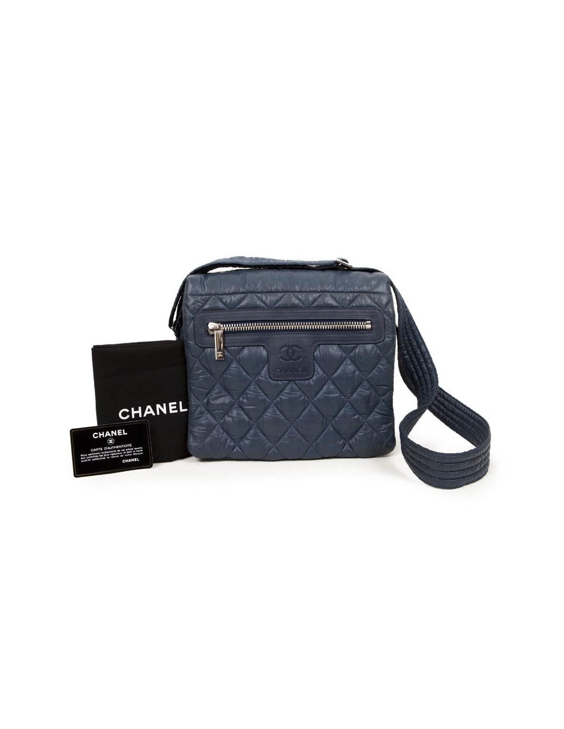 Bag 'Coco Cocoon' of the House of Chanel in waterproof canvas blue gray (slightly dark in some places use to use). The jewelry is silver metal. Zipped. The Interior is black with a zipped pocket. There is also a zippered front pocket. It is worn in crossover or shoulder with an adjustable bandoulere. Hologram: 1365... and authenticity card. In good condition. Tiny spots on the right flap white but very little visible. See photos.