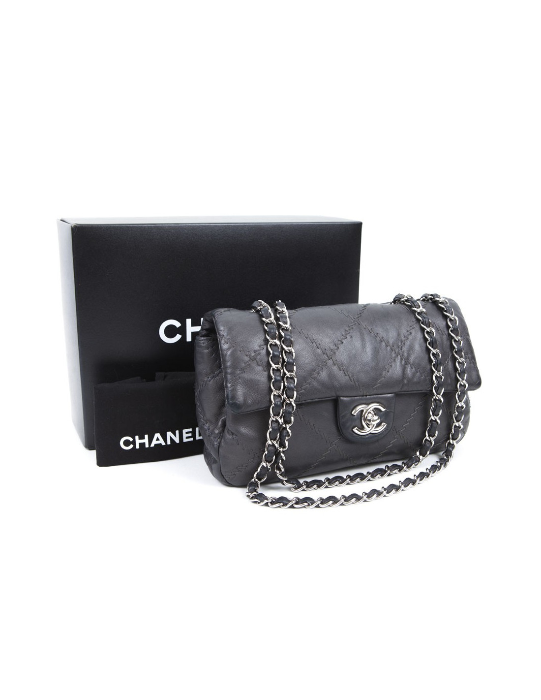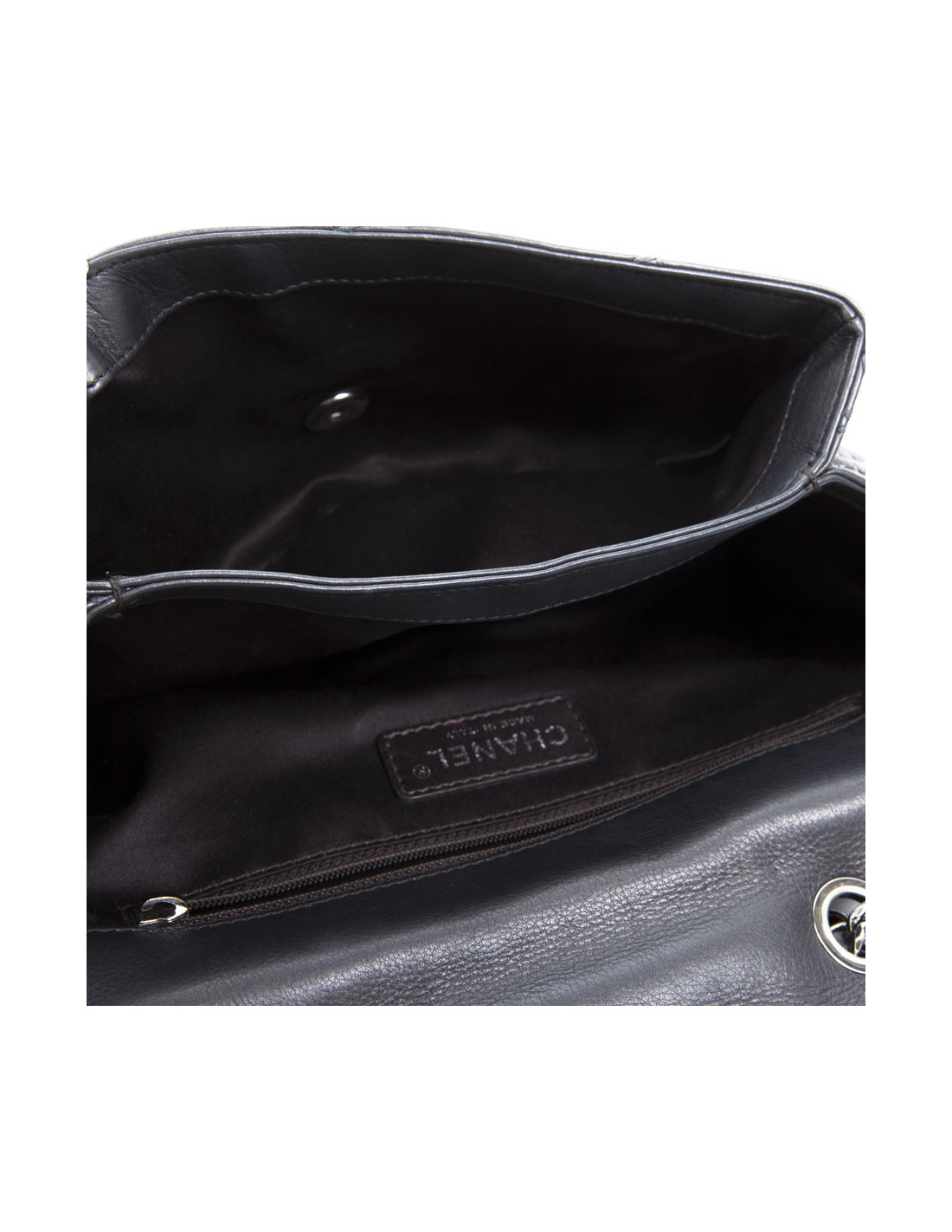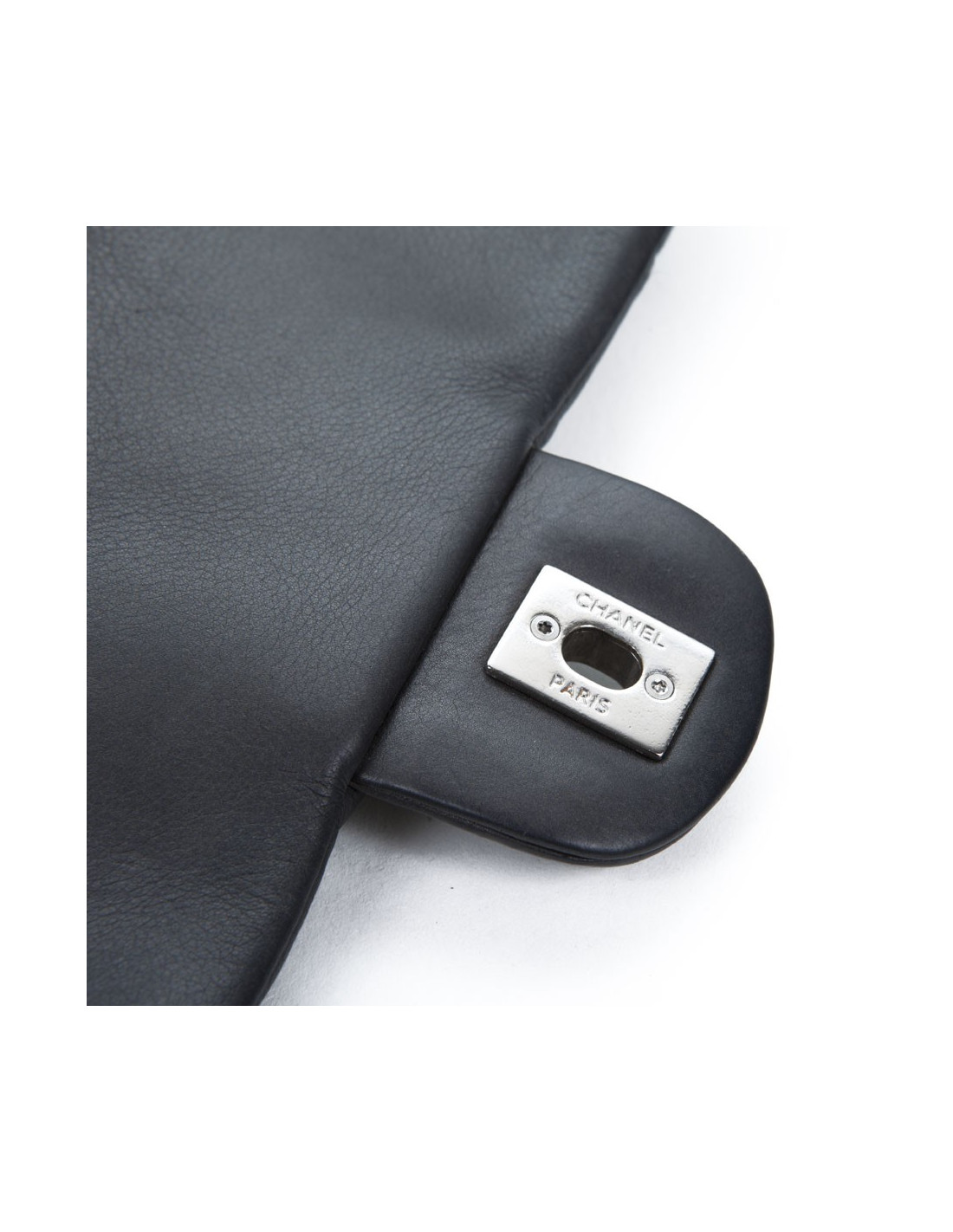 Grey leather bag slate for the House of Chanel. Clasp 'CC'. The jewelry is silver metal. The Interior is brown satin. It consists of two compartments with a zippered pocket. There is also a flat rear pocket.