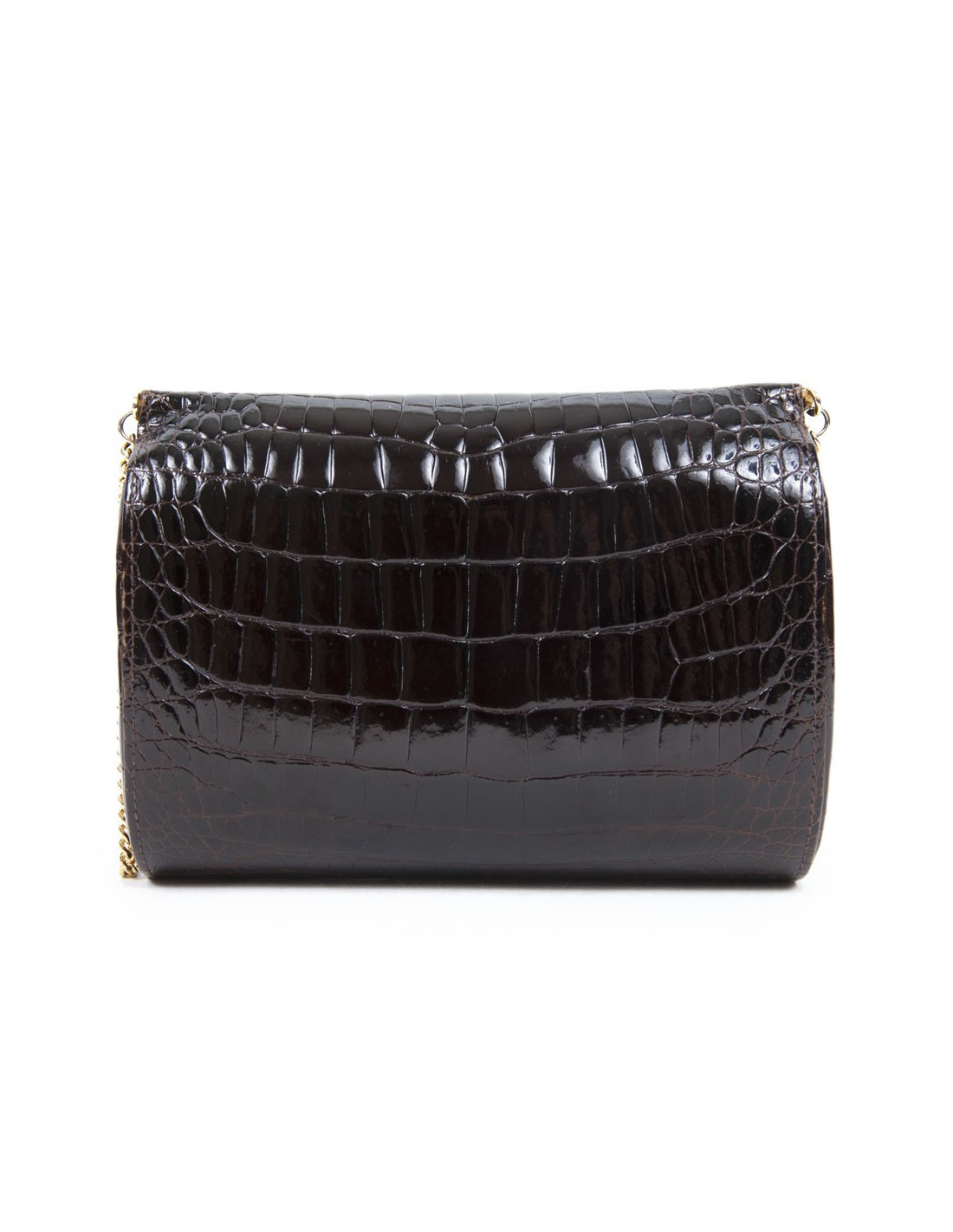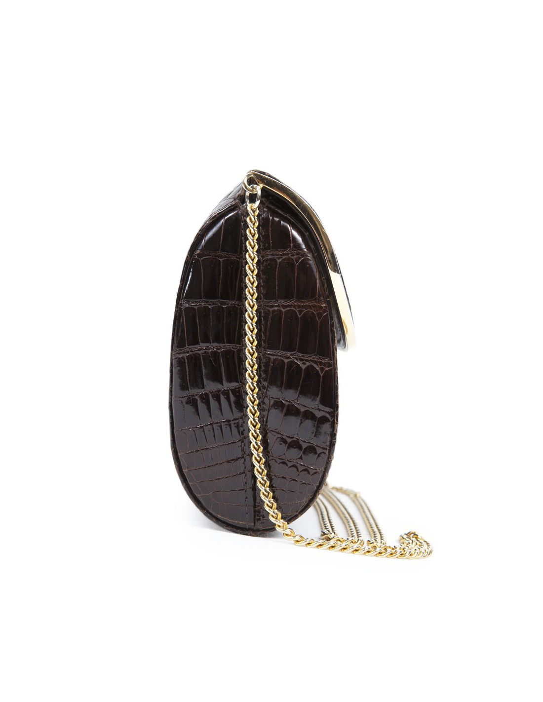 Vintage! Clutch in Brown crocodile of the House of Gucci. The jewelry is gold metal. Snap button closure. The Interior is brown leather with a small patch pocket. The shoulder strap is in golden chain. State vintage.